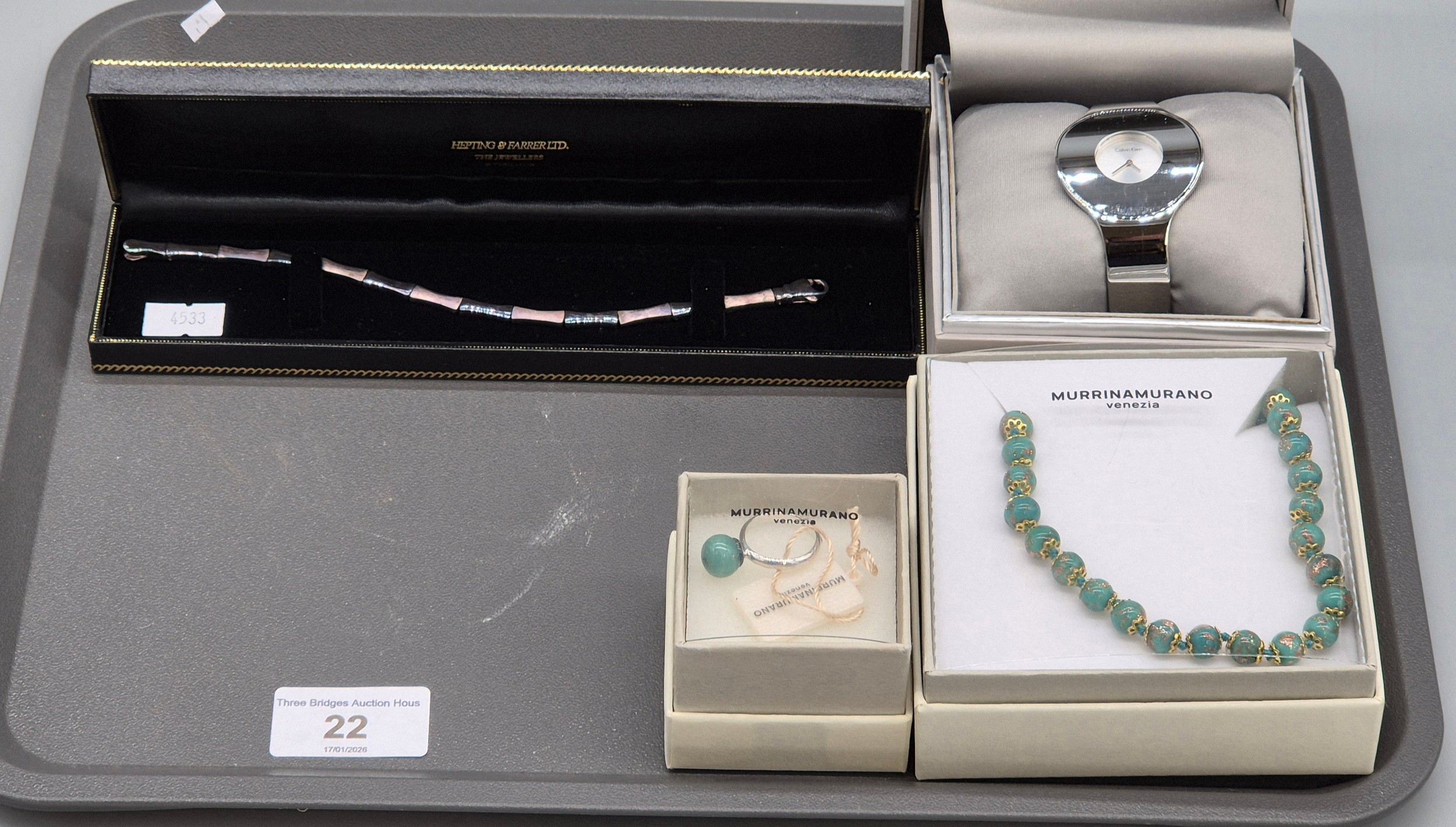 Various mixed jewellery; Silver bracelet. Murrinamurano ring and necklace and Calvin Klein ladies watch- box damaged.