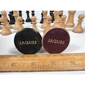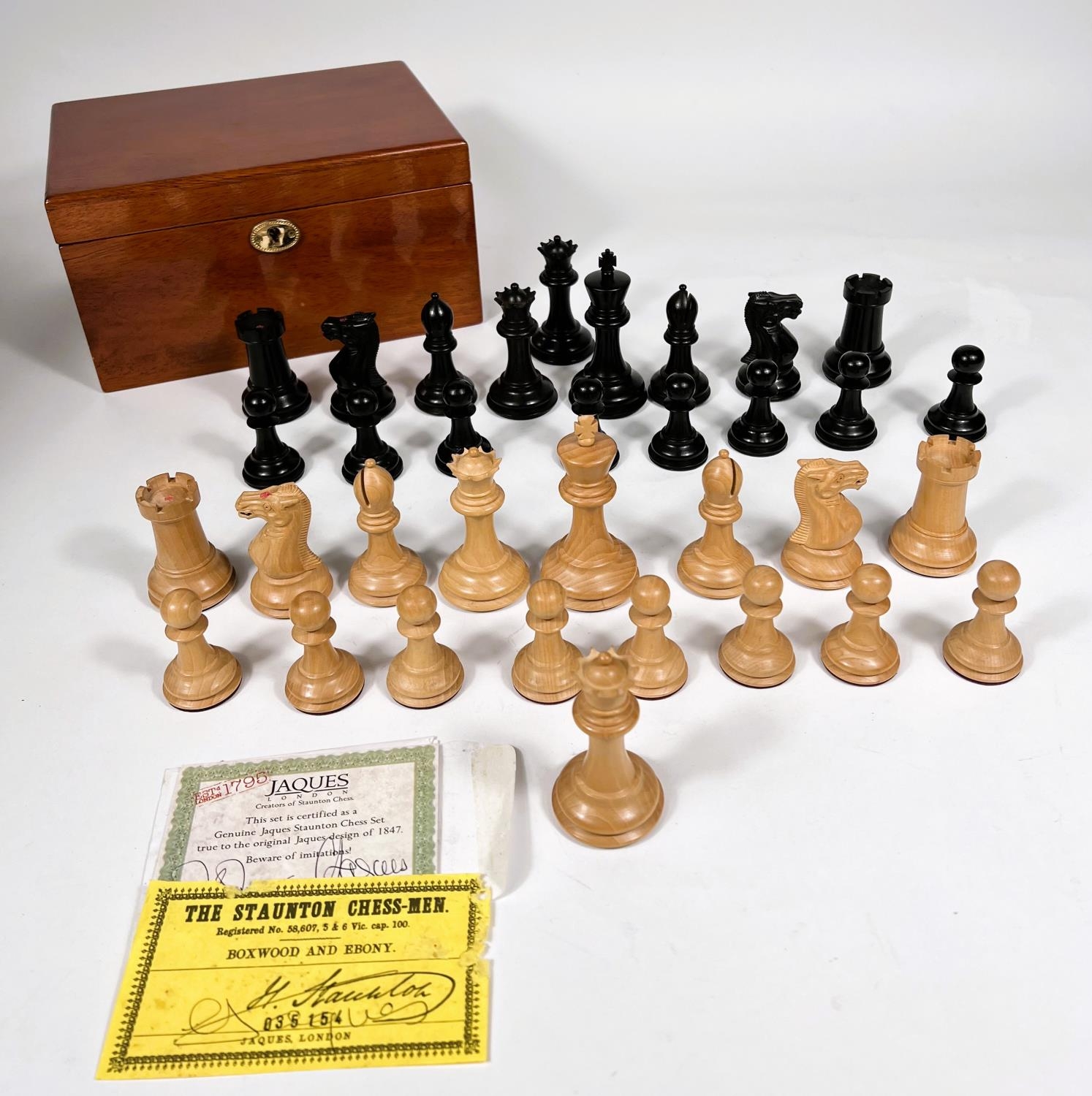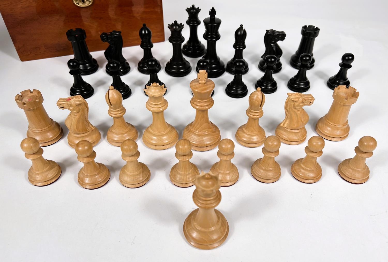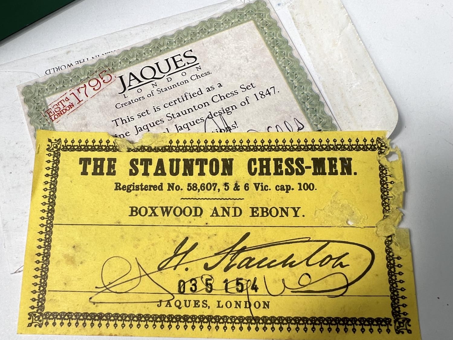 A modern Jaques Staunton chess set, in storage box with certificate, weighted bases, King height 9cm; Chess clock and boxed Mahjong set