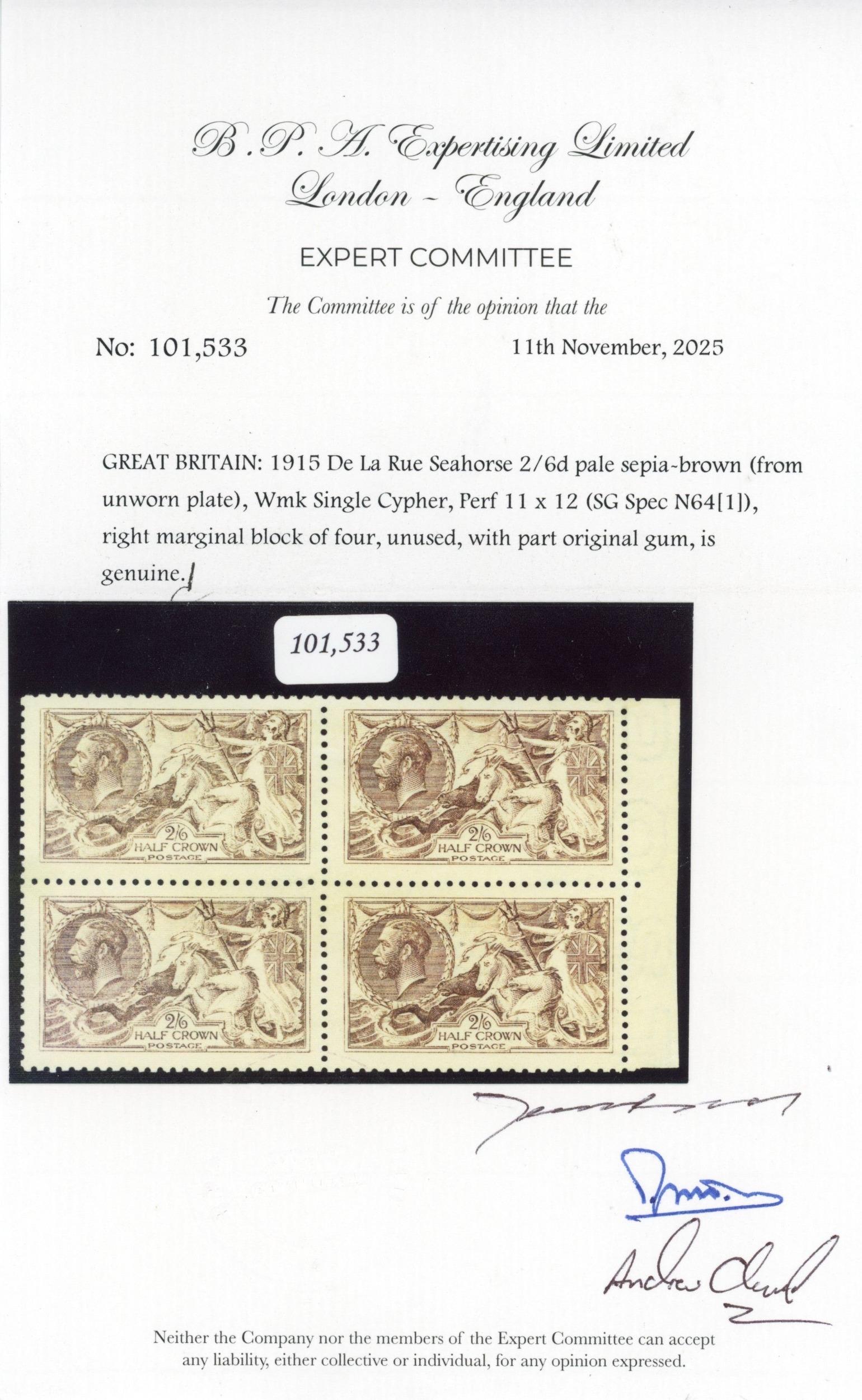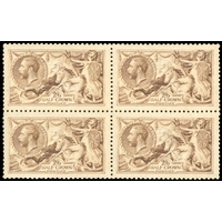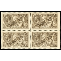 1915 De La Rue 2s6d pale sepia-brown (from unworn plate), mint right marginal block of four in this unmistakeable pale crisp shade, lower left stamp unmounted. Lovely fresh appearance of this exceptionally rare shade in block. BPA Certificate (2025). SG 408 var, Spec N64(1).