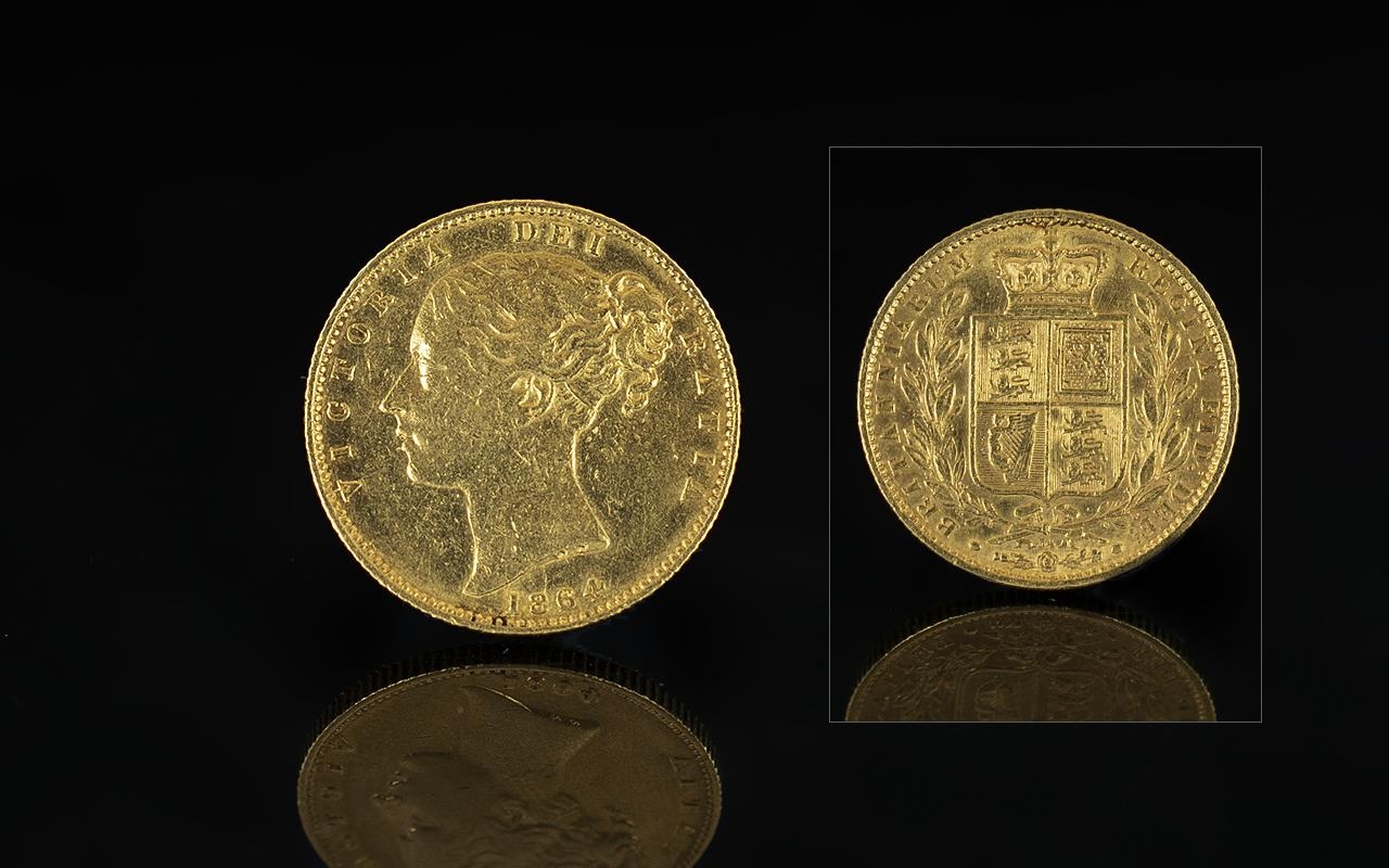 Queen Victoria 22ct Gold - Young Head Shield Back Full Sovereign - Date 1864. London Mint, Die Number 34. Good Grade - Please Confirm with Photo.
