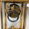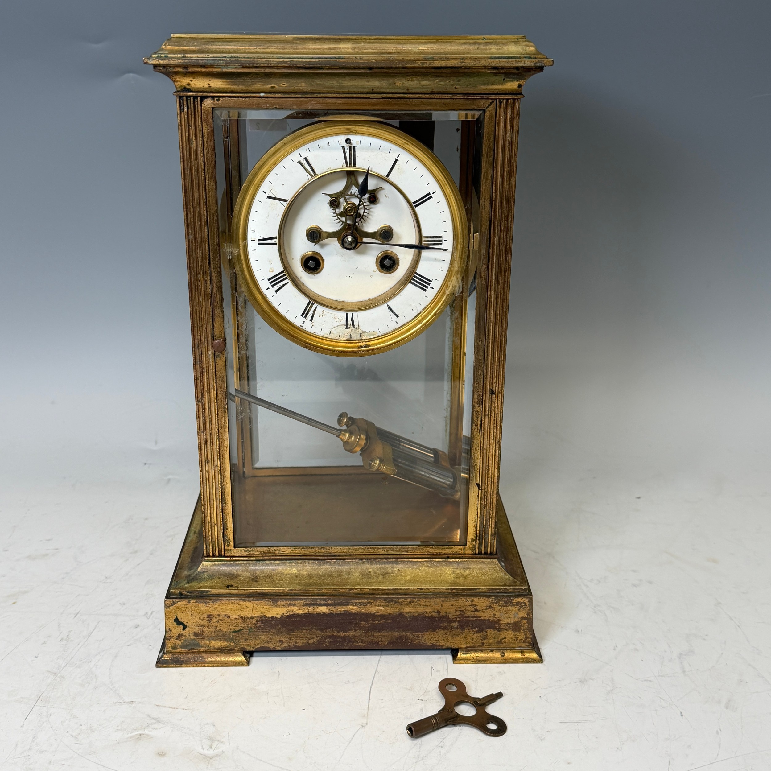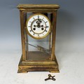 An early 20th century French four-glass gilt metal mantel Clock, the dial with skeleton escapement and backplate signed 'John Bennett, London', striking on coil and complete with mercury filled pendulum and key, note damage to enamel chapter and wear to the case, please see images, H 35 cm.