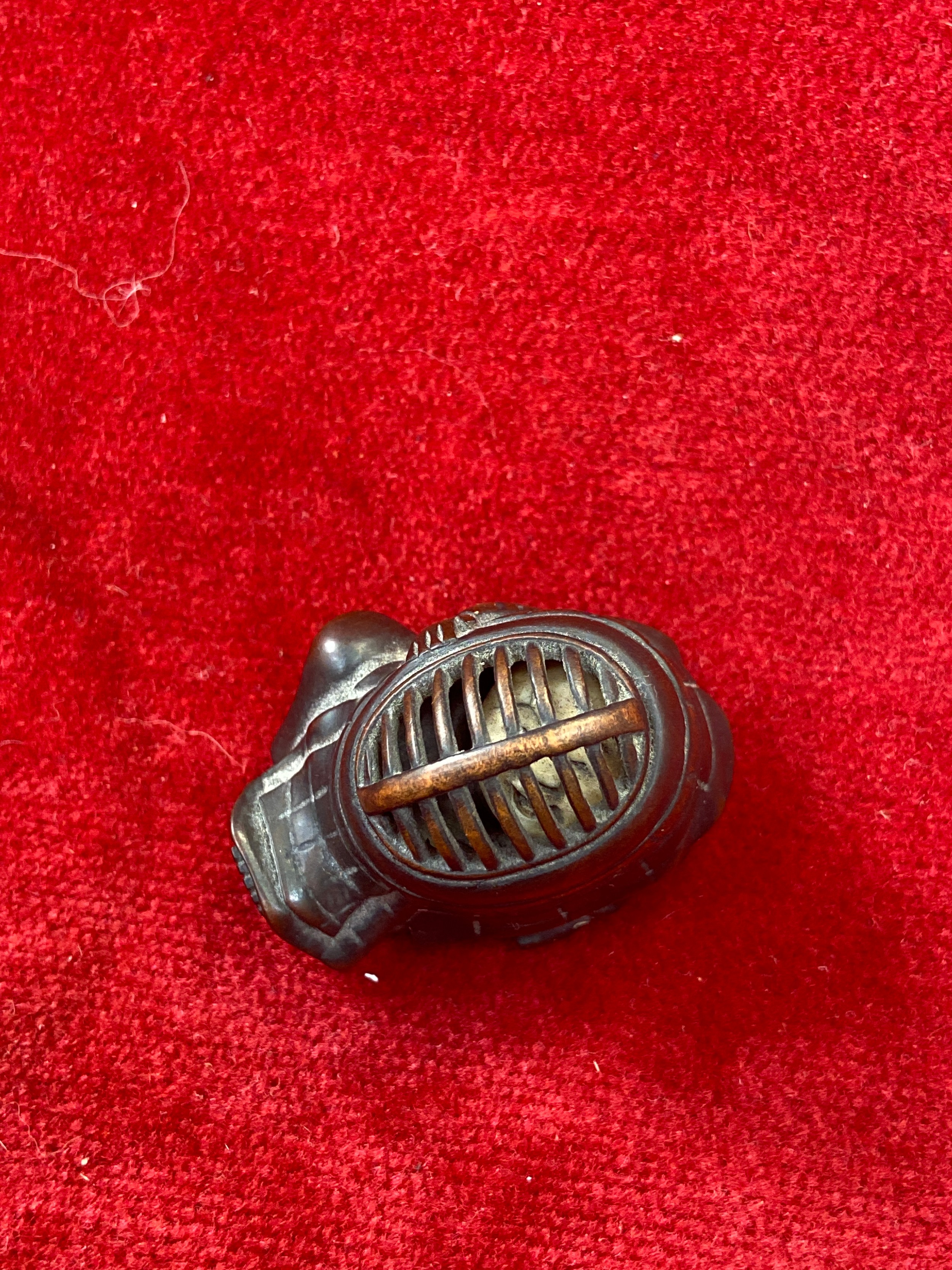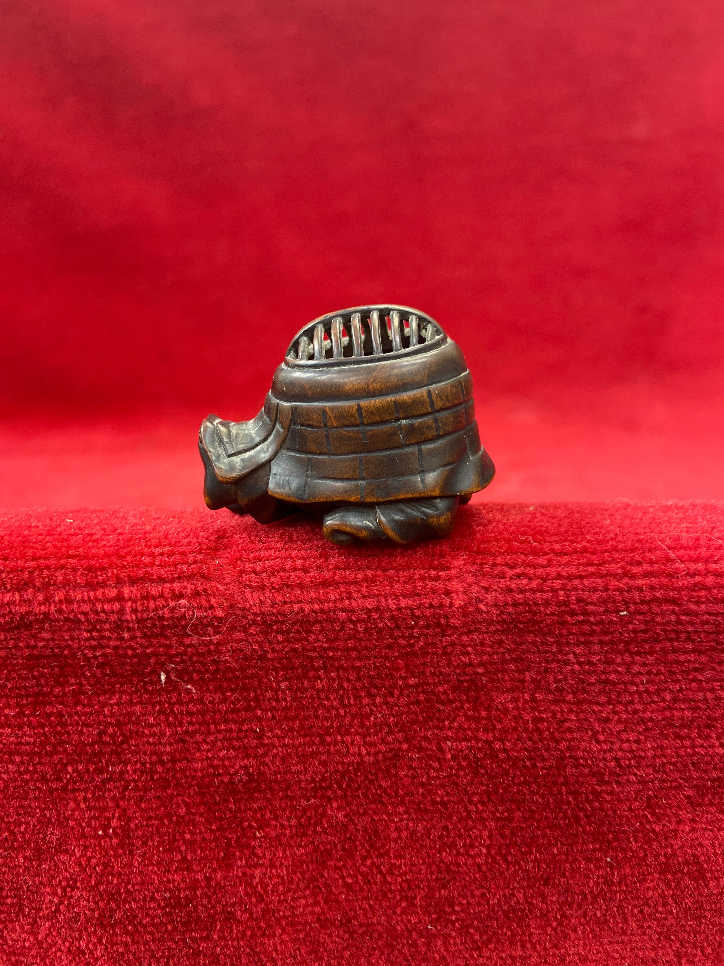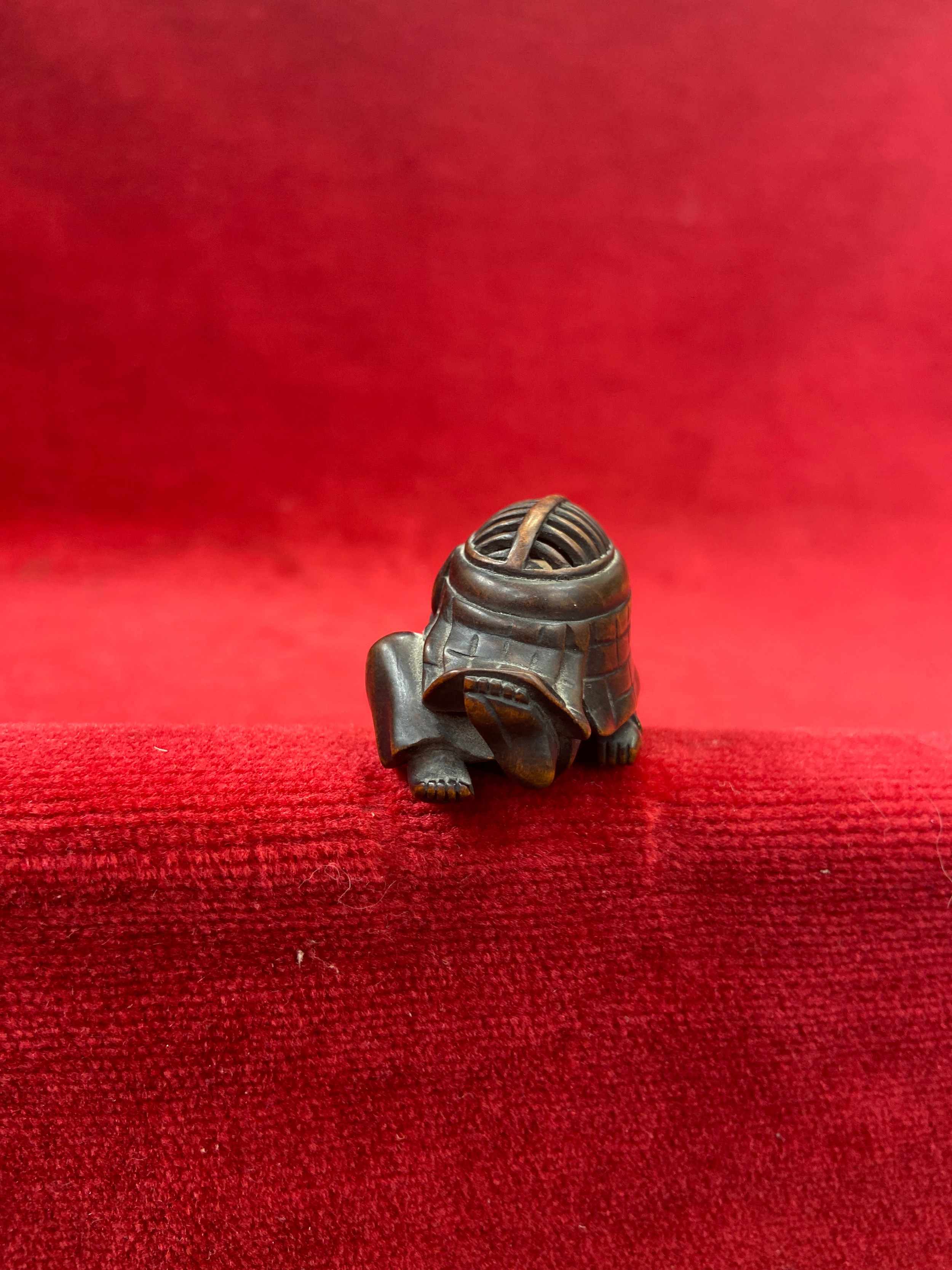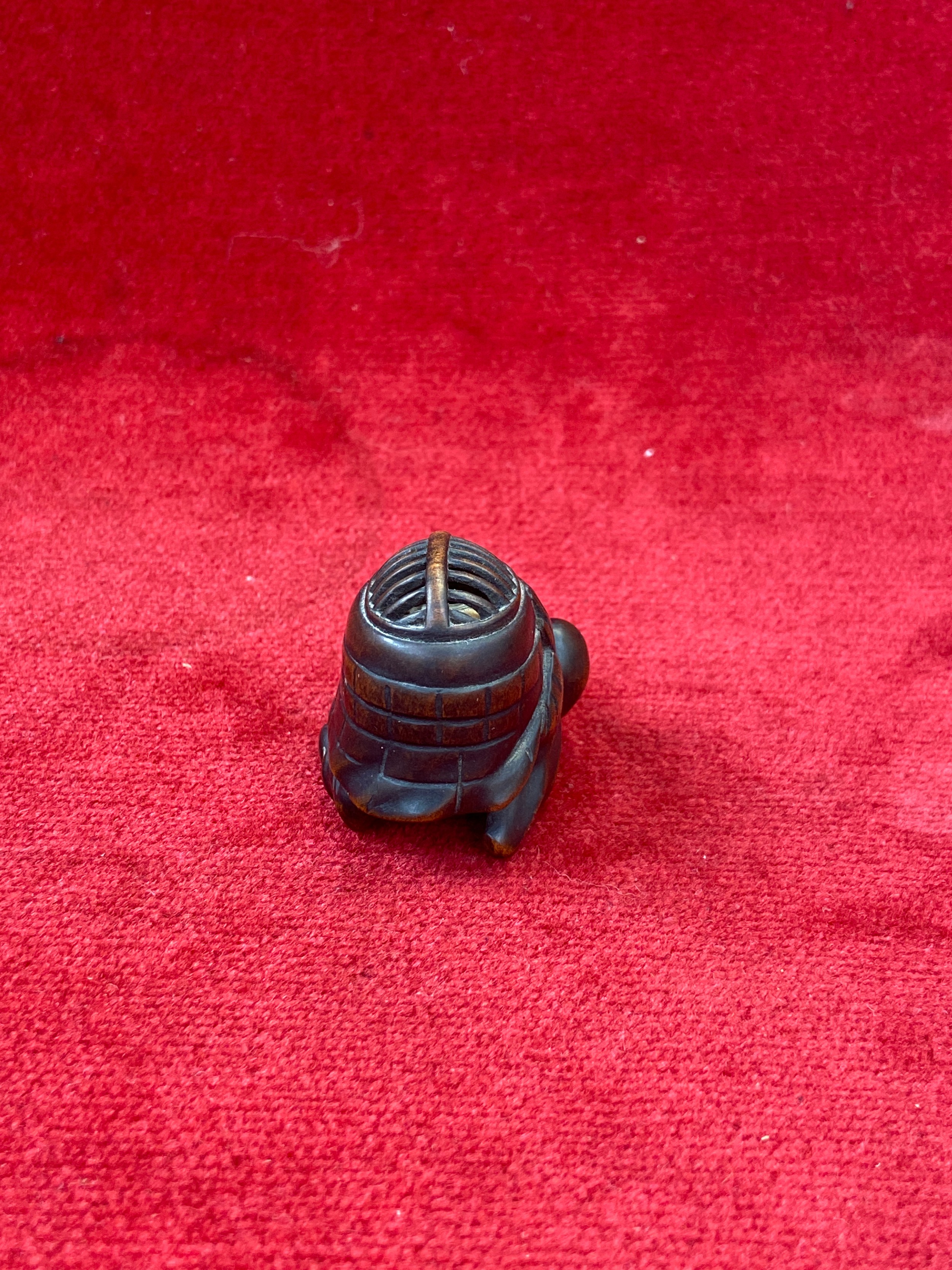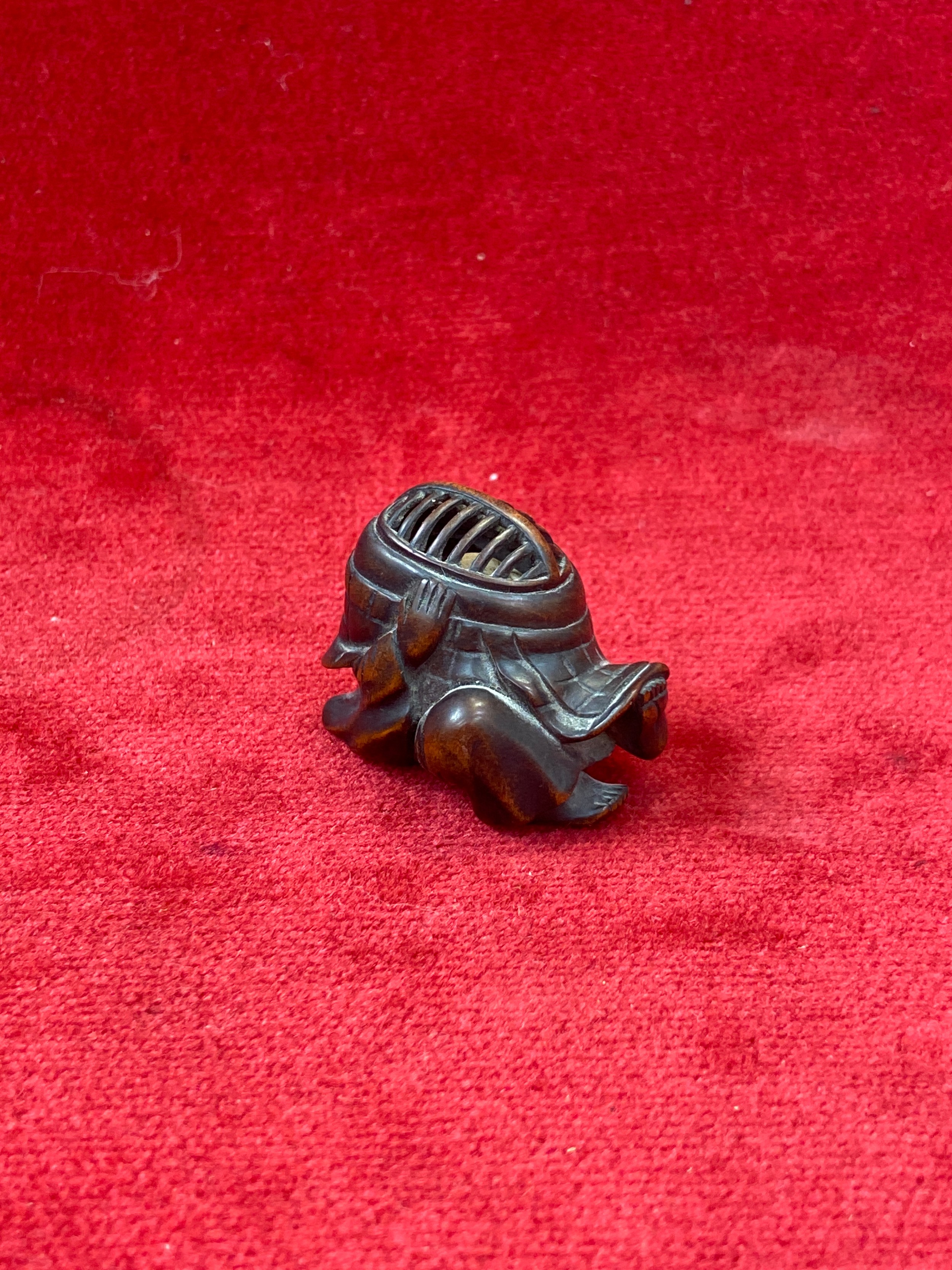 Japanese boxwood Netsuke, finely carved in the form of a small figure crouching beneath a larger bōgu (Kendo mask). Inside the grill of the mask is a small loose piece carved into a smiling face.