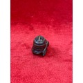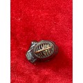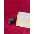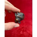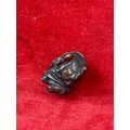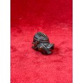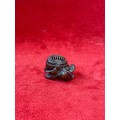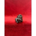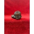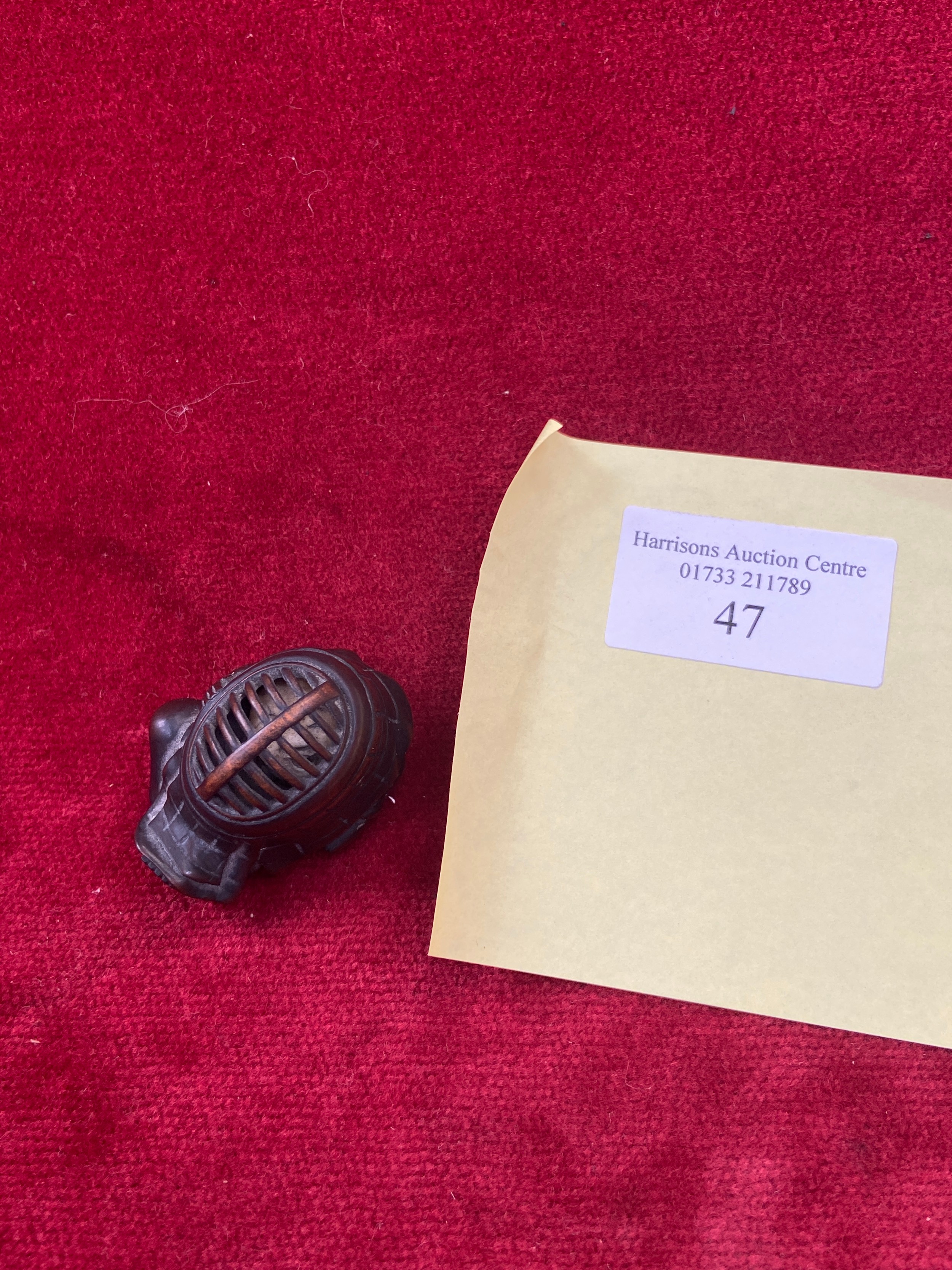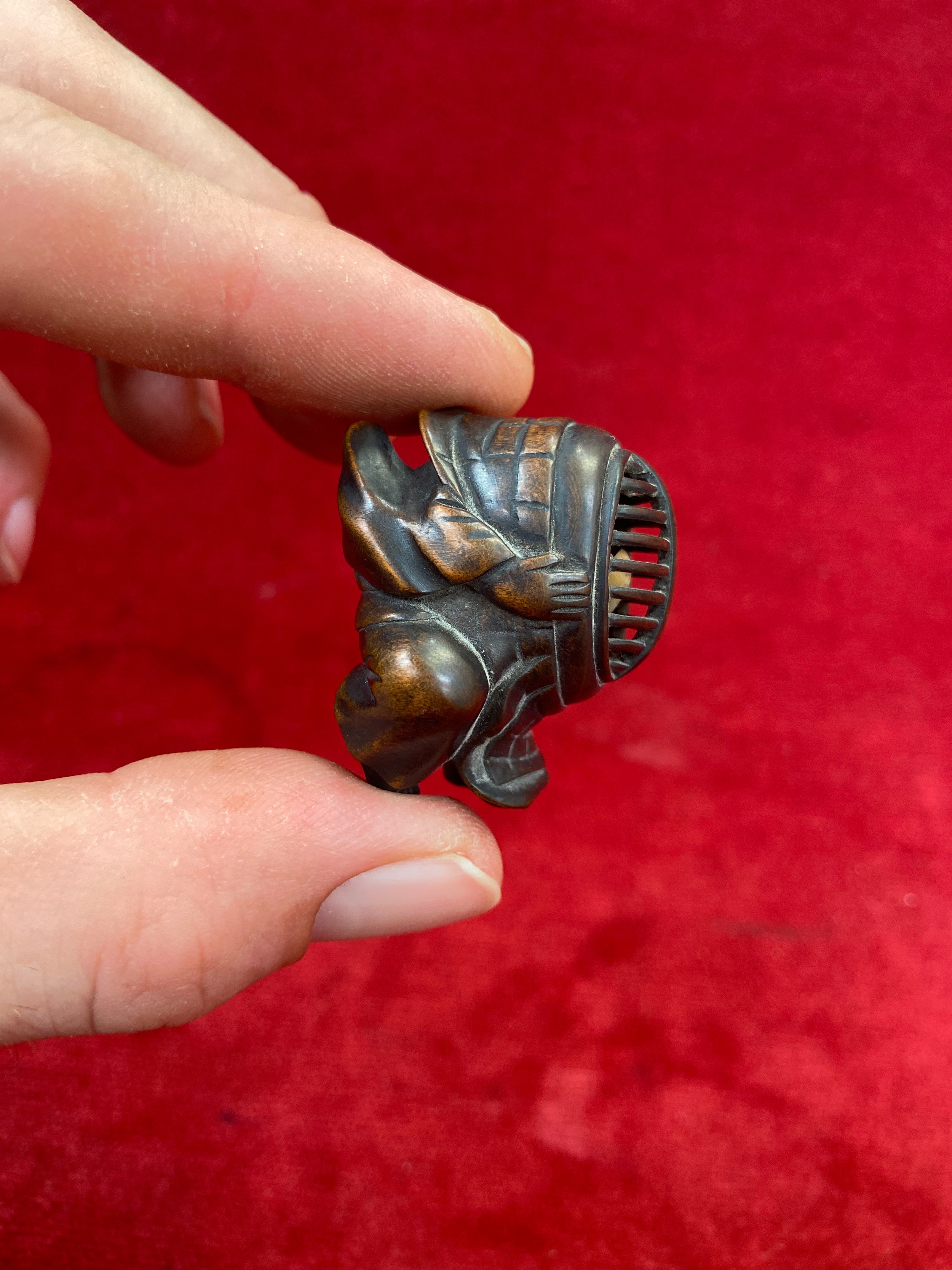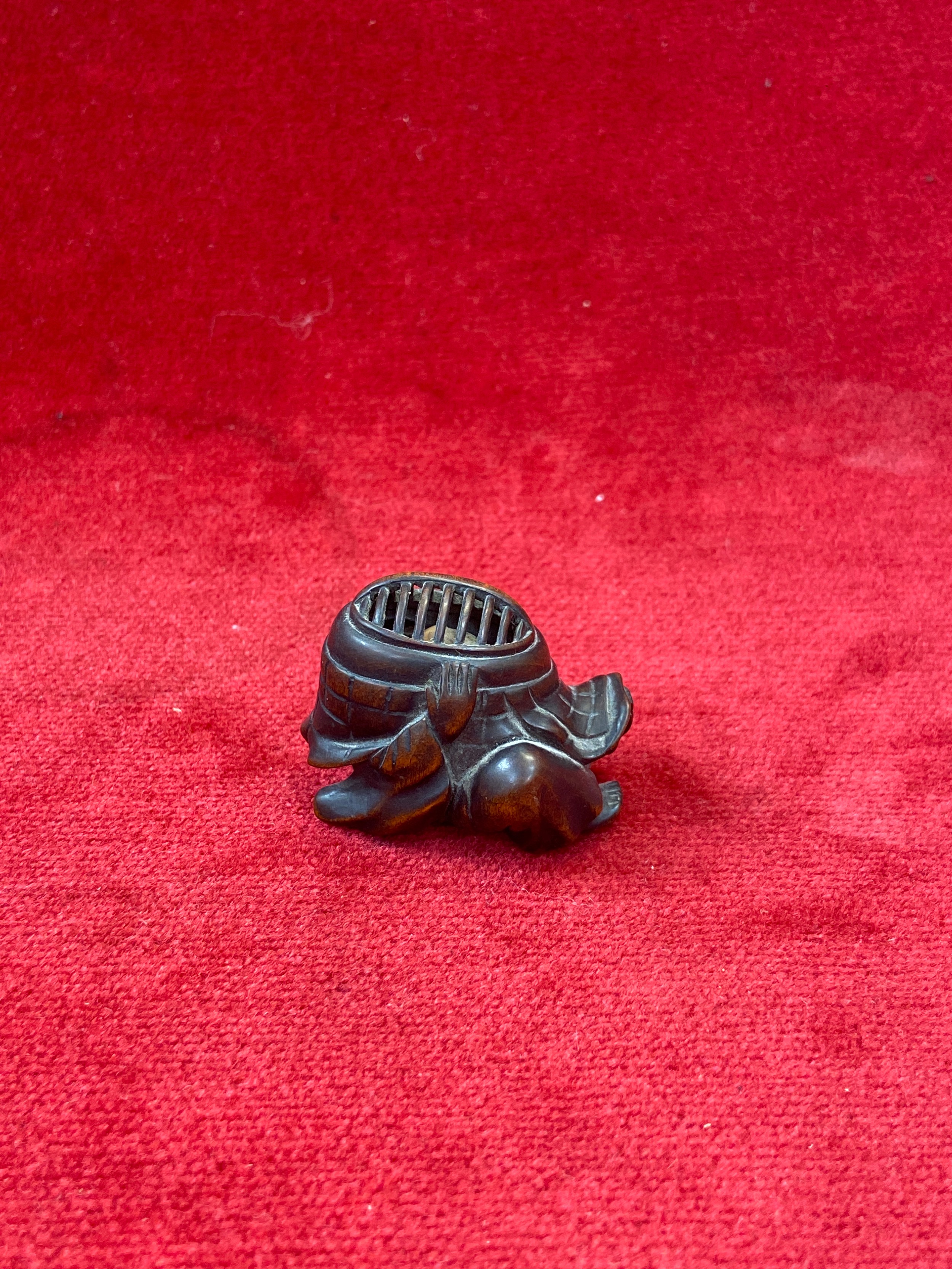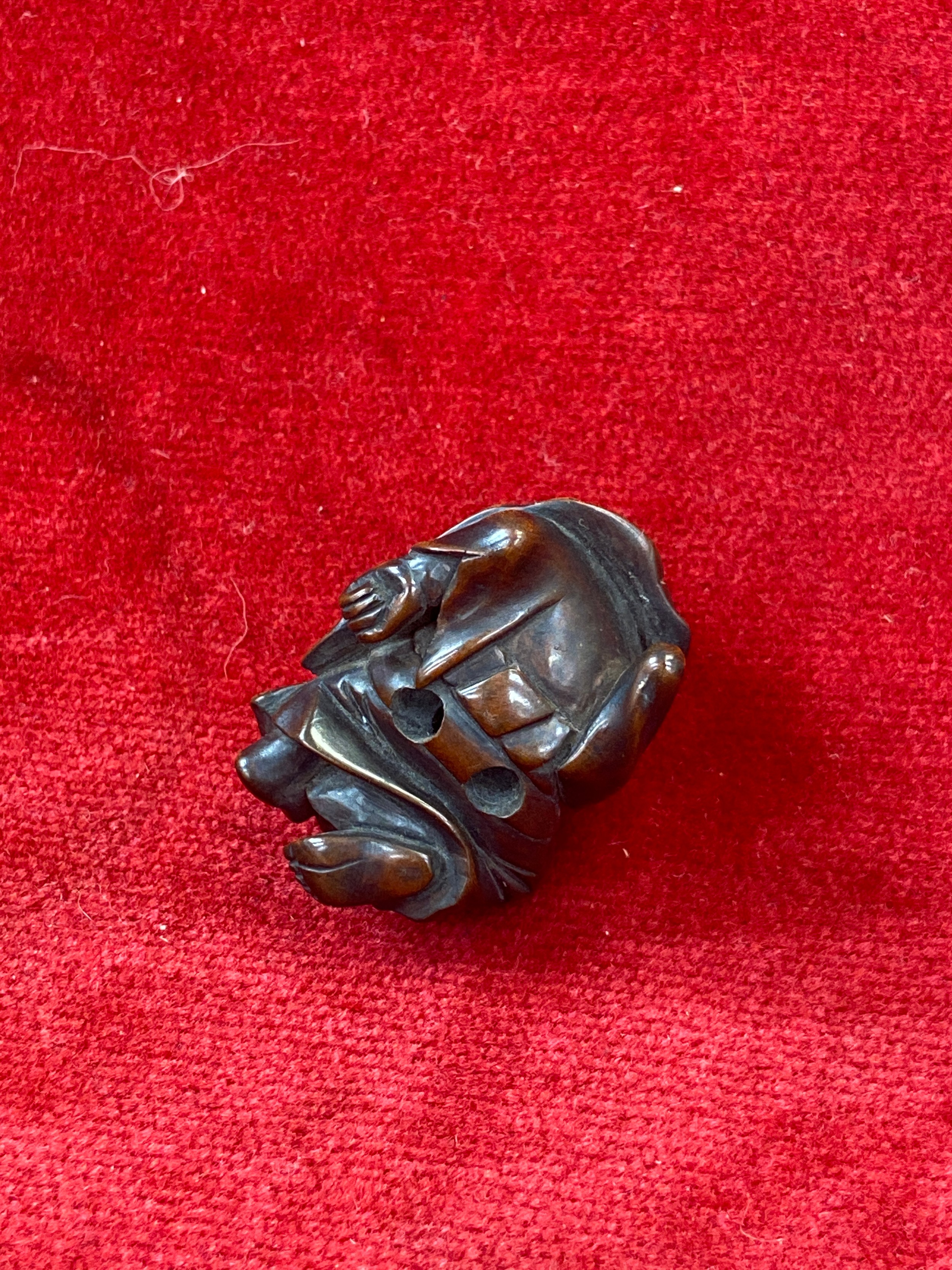Japanese boxwood Netsuke, finely carved in the form of a small figure crouching beneath a larger bōgu (Kendo mask). Inside the grill of the mask is a small loose piece carved into a smiling face.