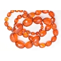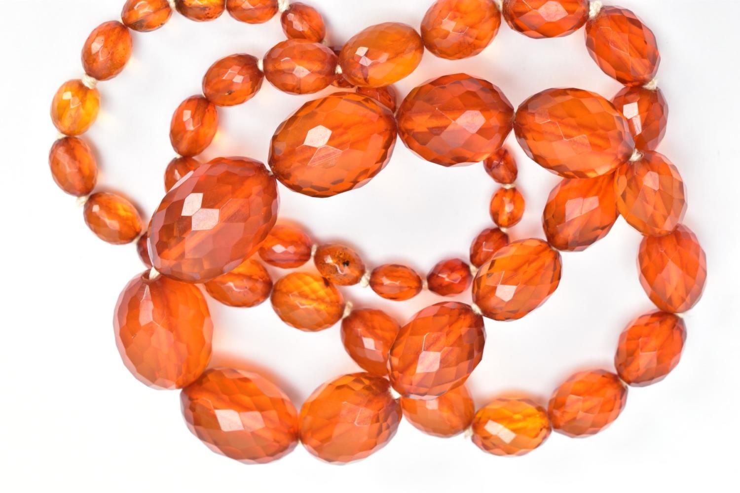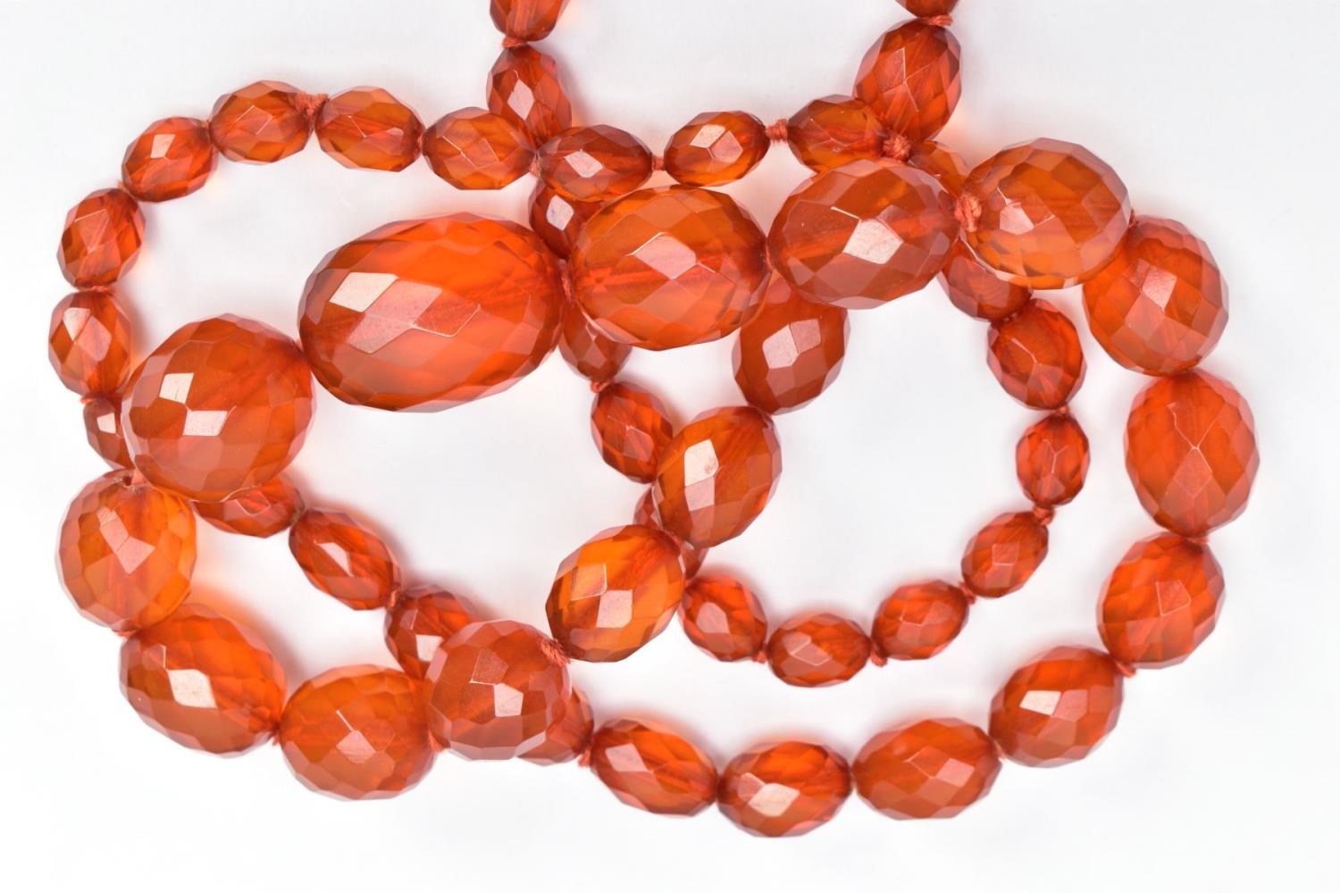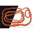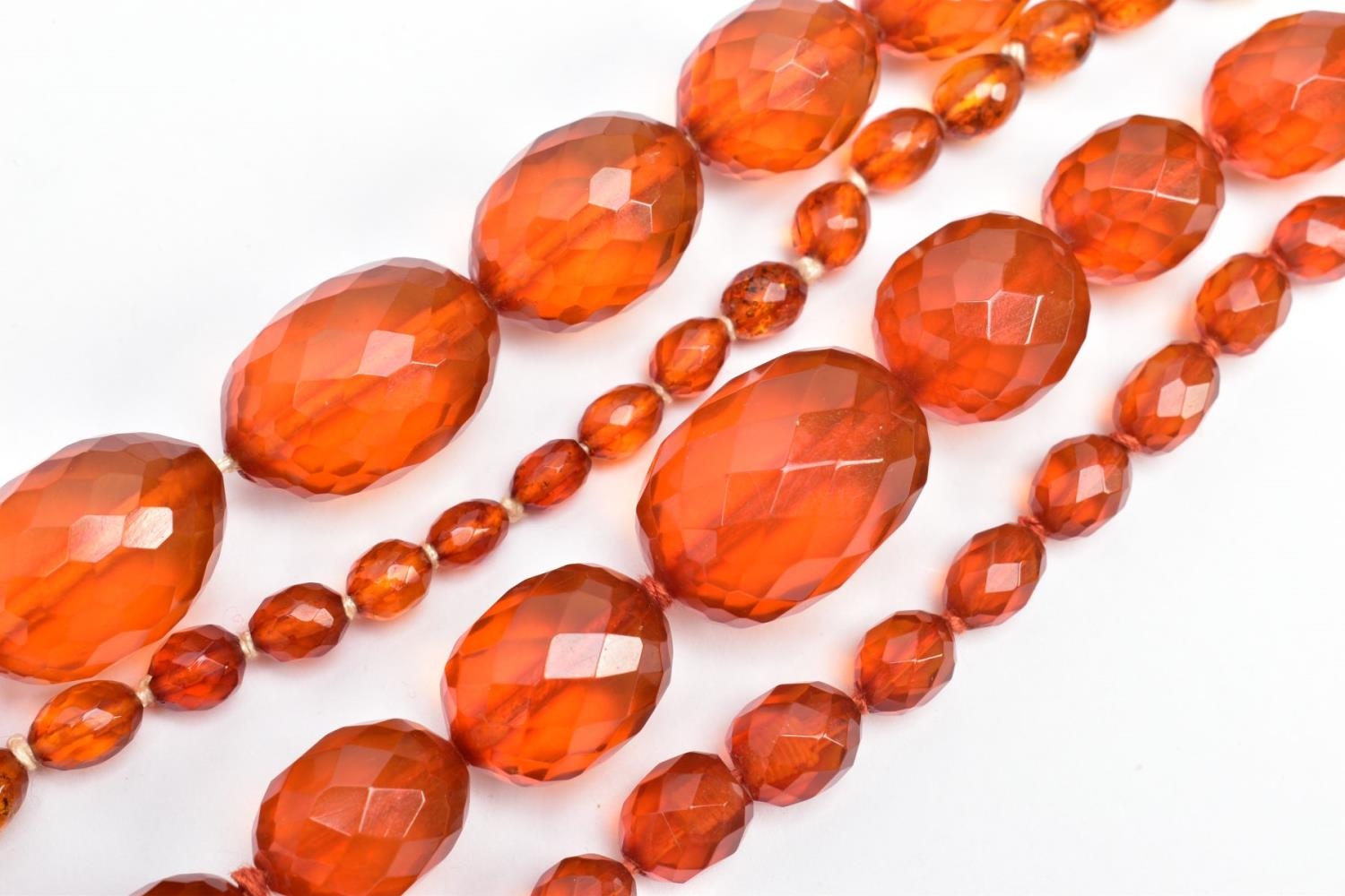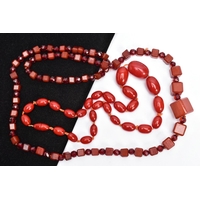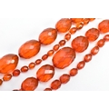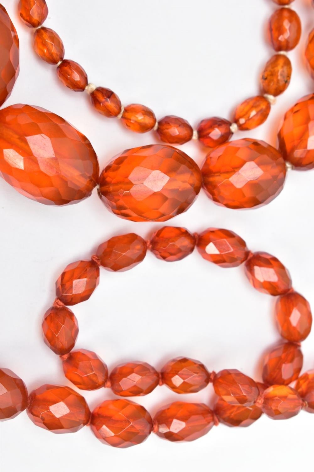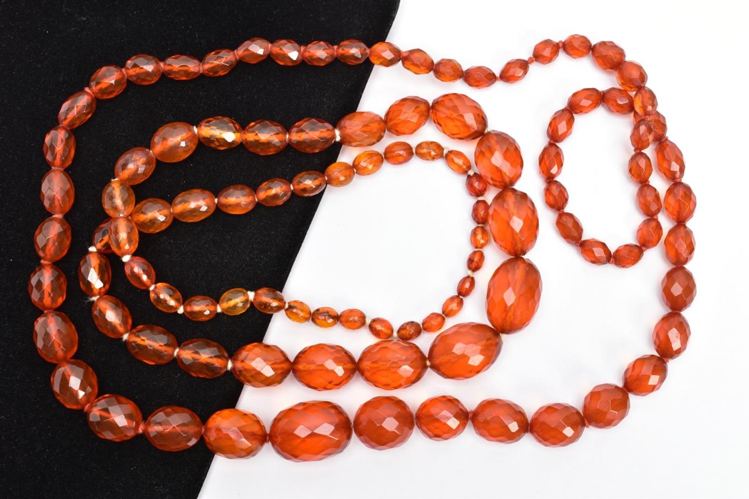 TWO SETS OF ORANGE FACETED PLASTIC BEAD NECKLACES, each designed with graduated, faceted oval beads, largest beads measuring 35.1mm x 26.9mm and 33.2mm x 25.0mm, smallest bead measuring 14.2mm x 12.0mm and 15.9mm x 13.9mm, lengths 740mm and 820mm