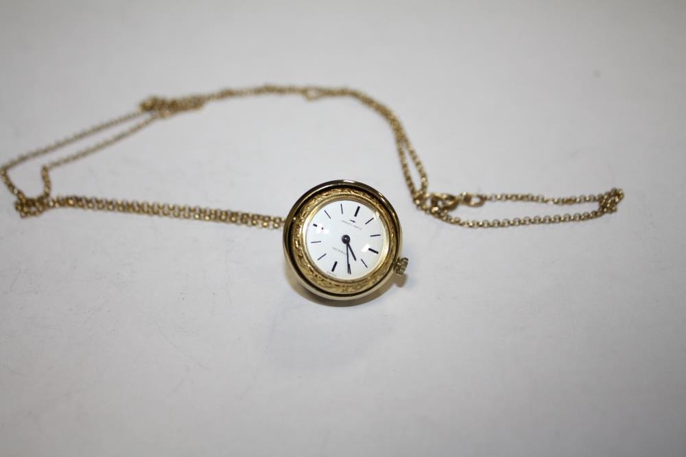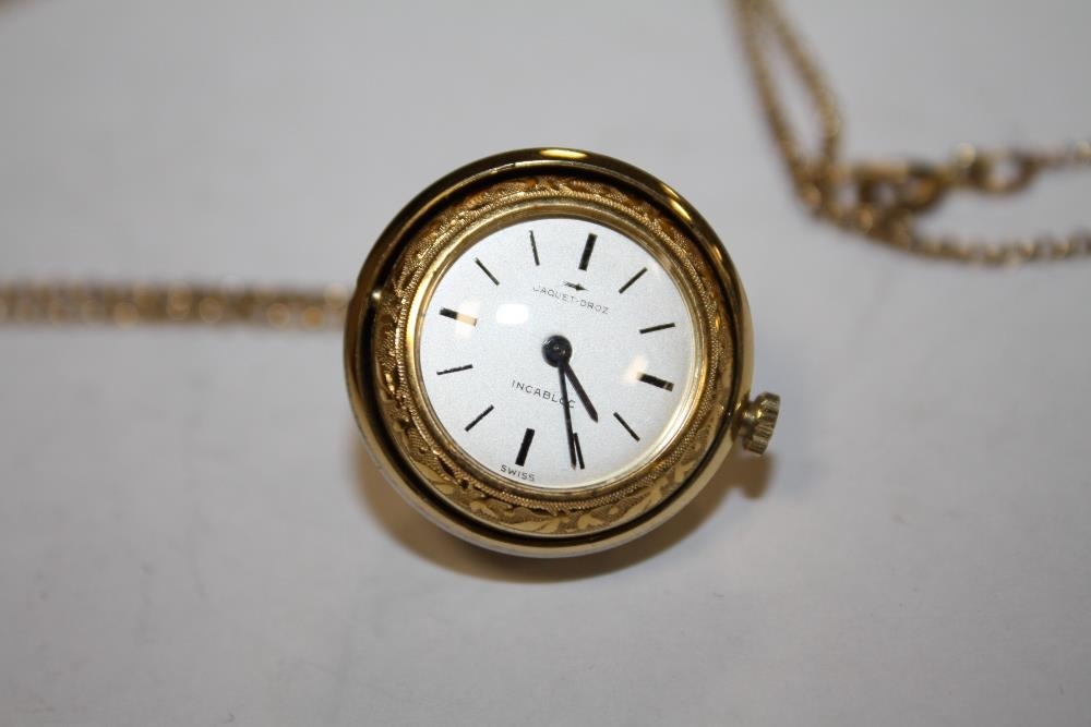 A JAQUET-DROZ INCABLOC YELLOW METAL SWIVEL PENDANT WATCH ON CHAIN STAMPED 9K