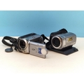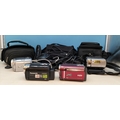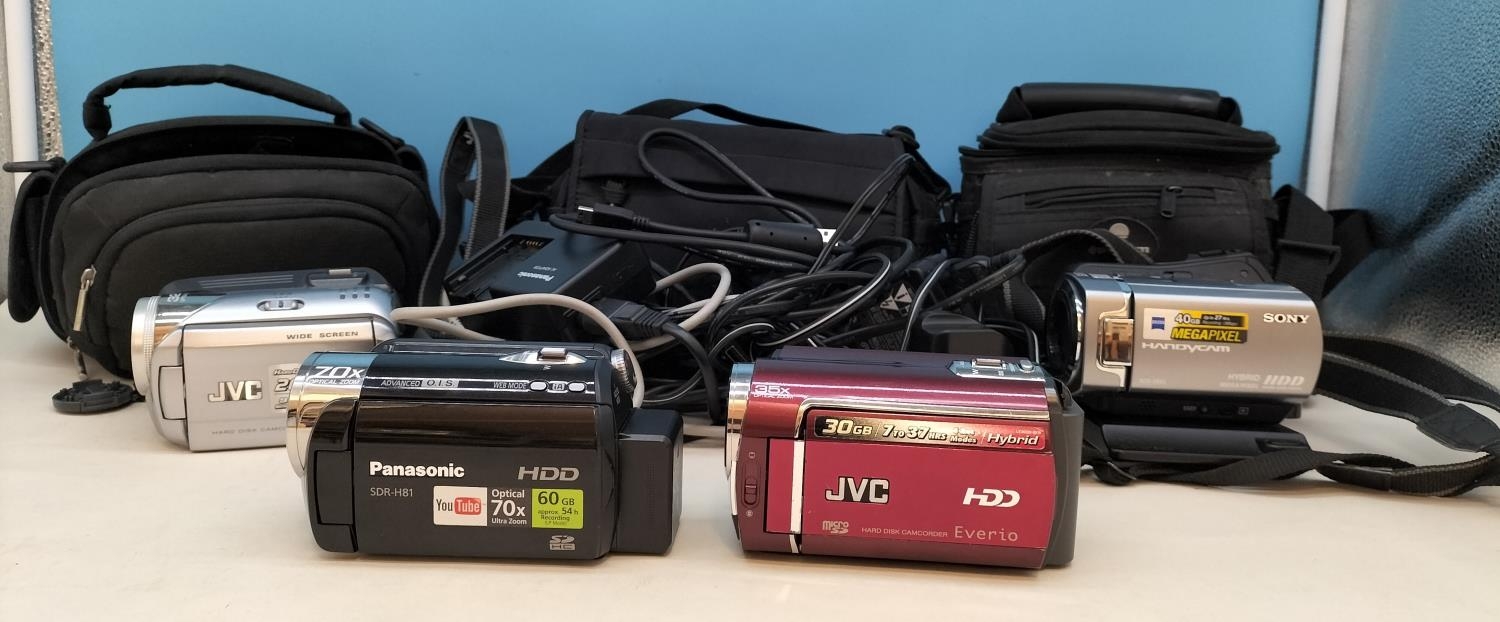 Collection of Camcorders (4) to include Panasonic SDR-H81 and JVC GZ-M6330REK (Both Power Up). Others Missing Charger/Battery. Plus 3 x Camcorder Cases.