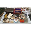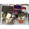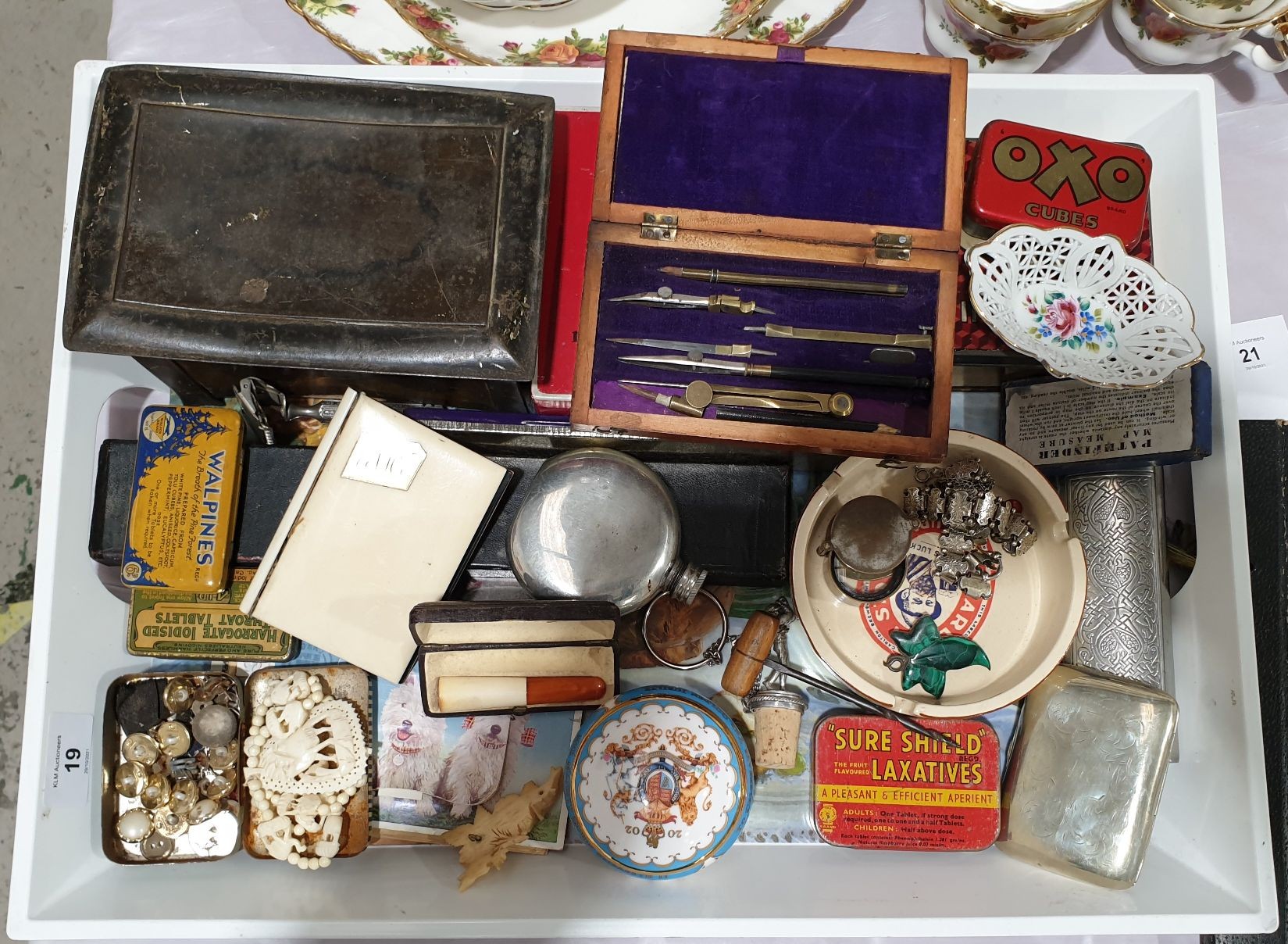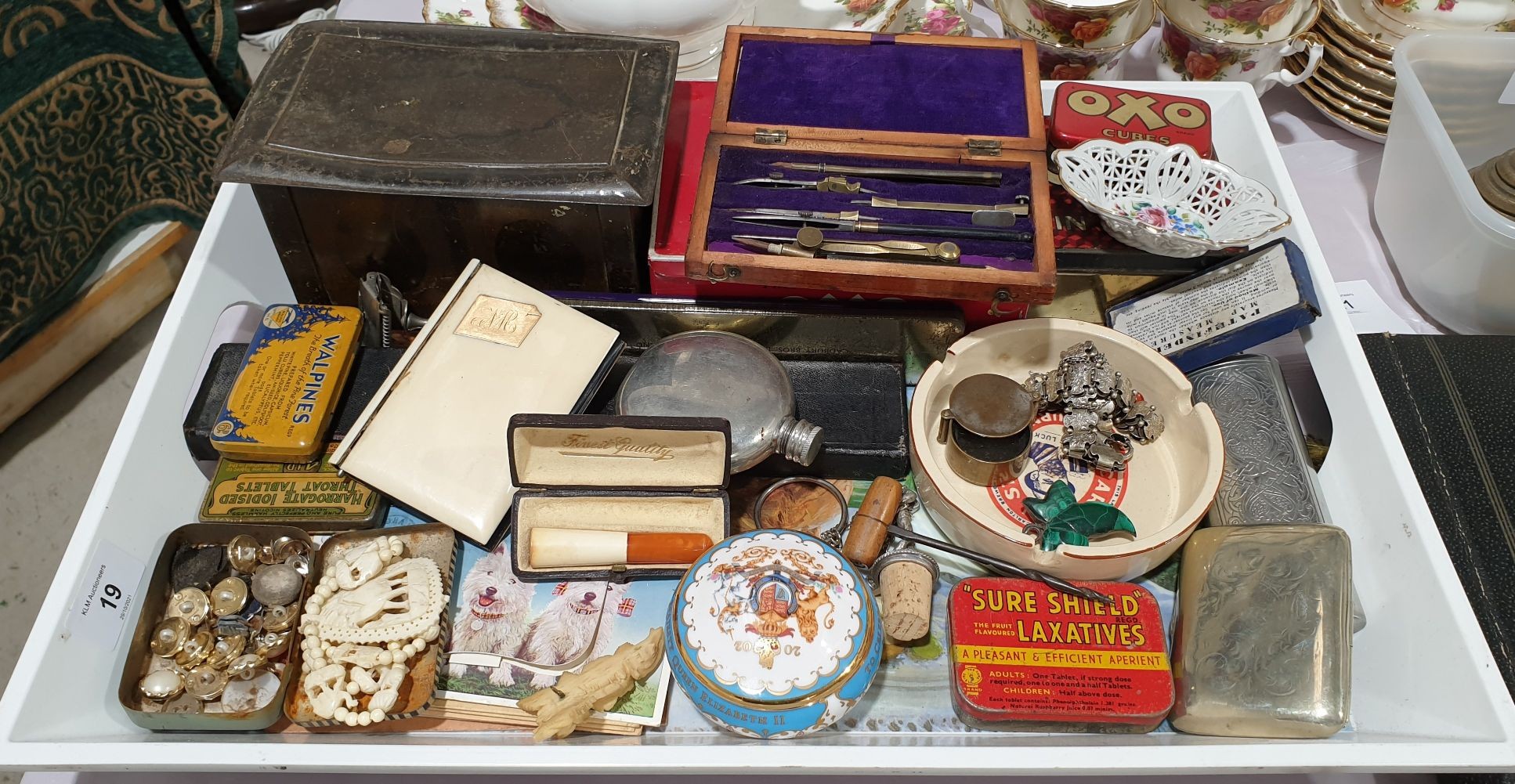A tray of assorted including vintage tins, cheroot holder and a draughtsman’s set.