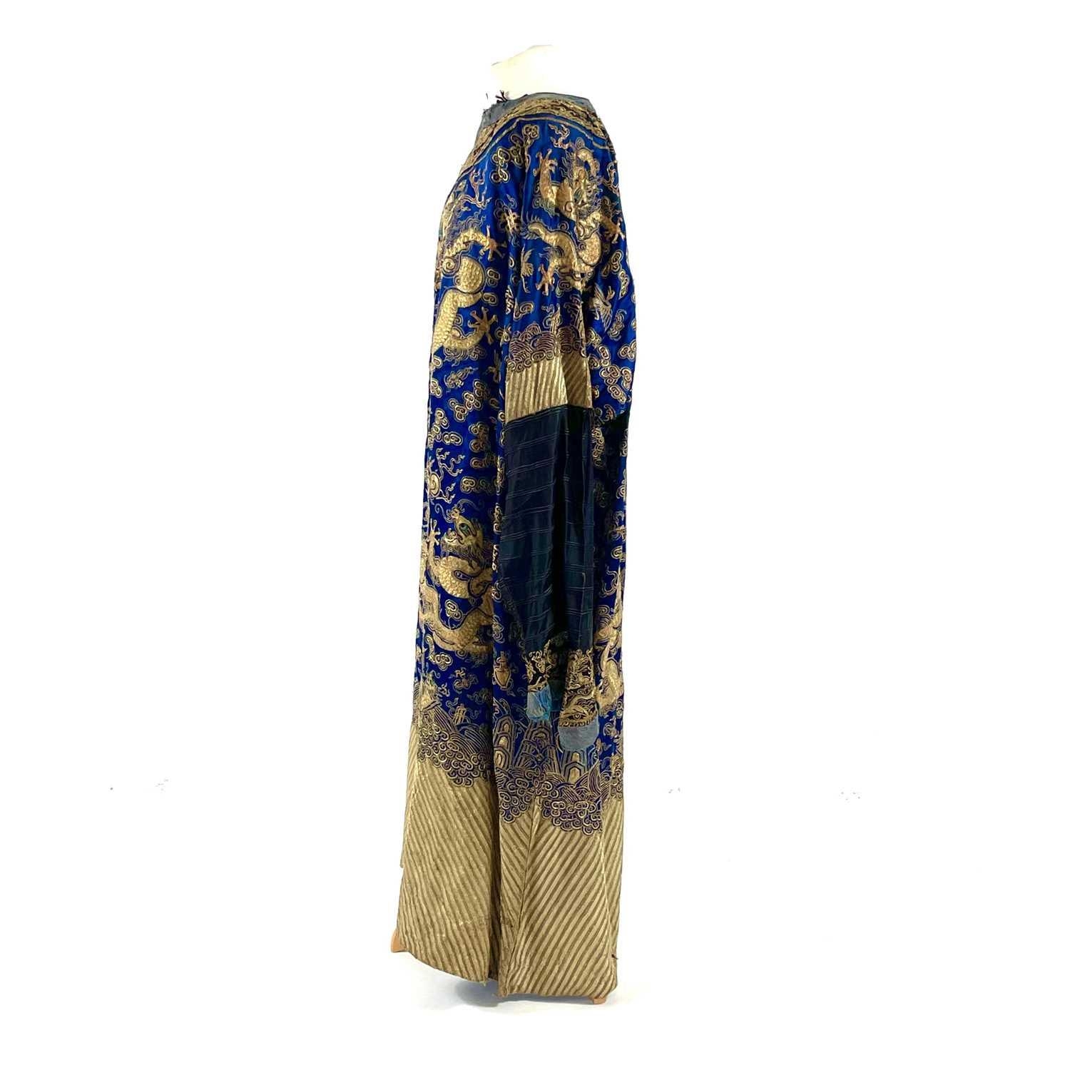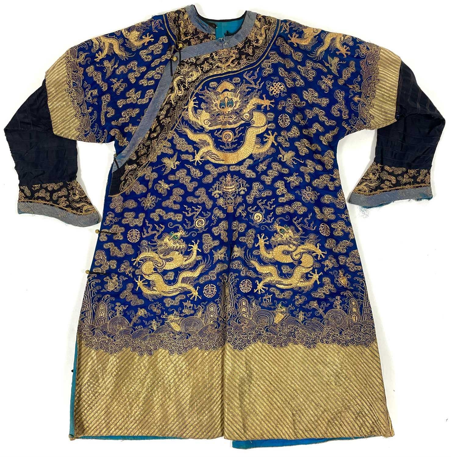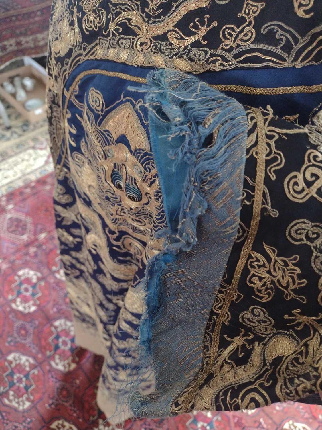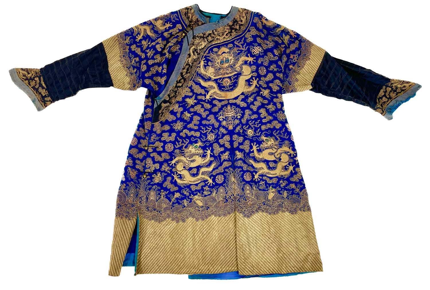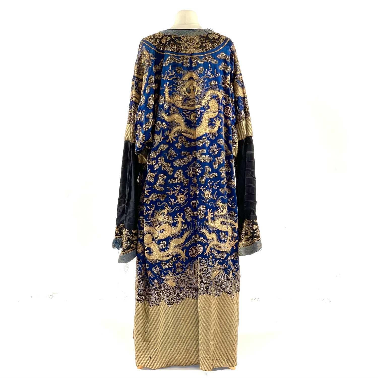 A Chinese embroidered dragon robe, late 19th century. The indigo silk robe embroidered with eight gold metal thread dragons chasing the flaming pearl, amongst clouds, pagodas and cranes, length 140cm.