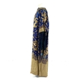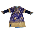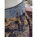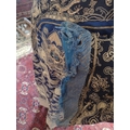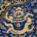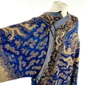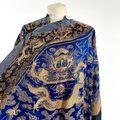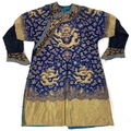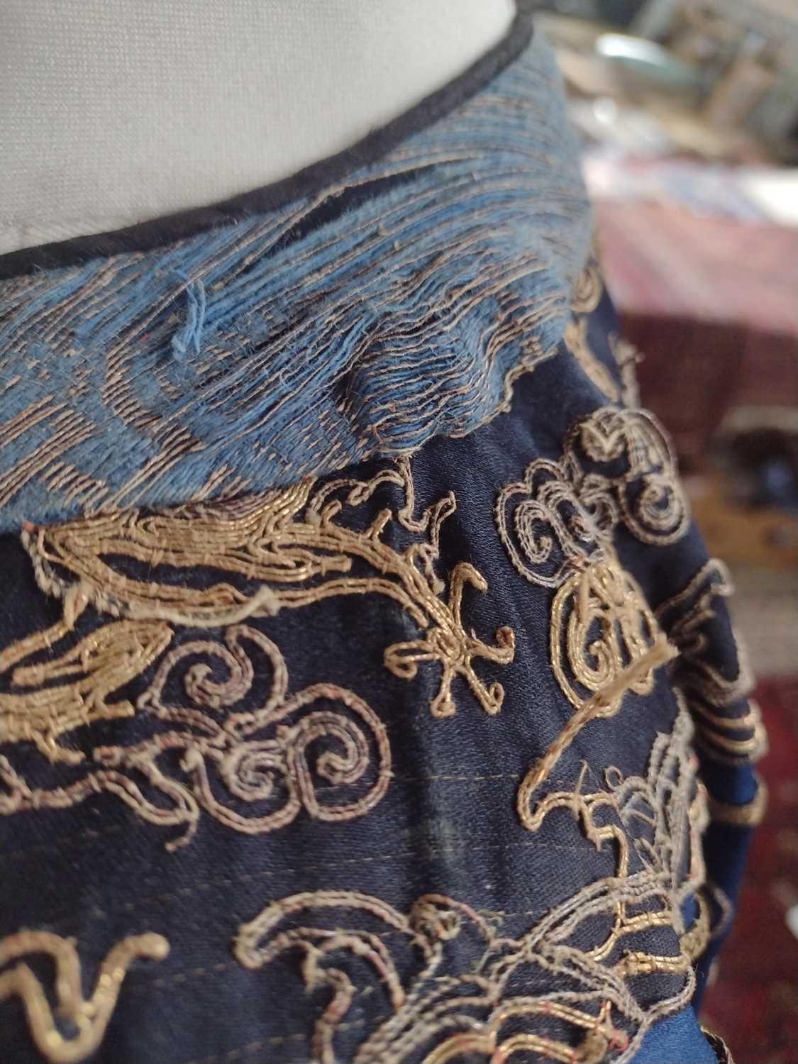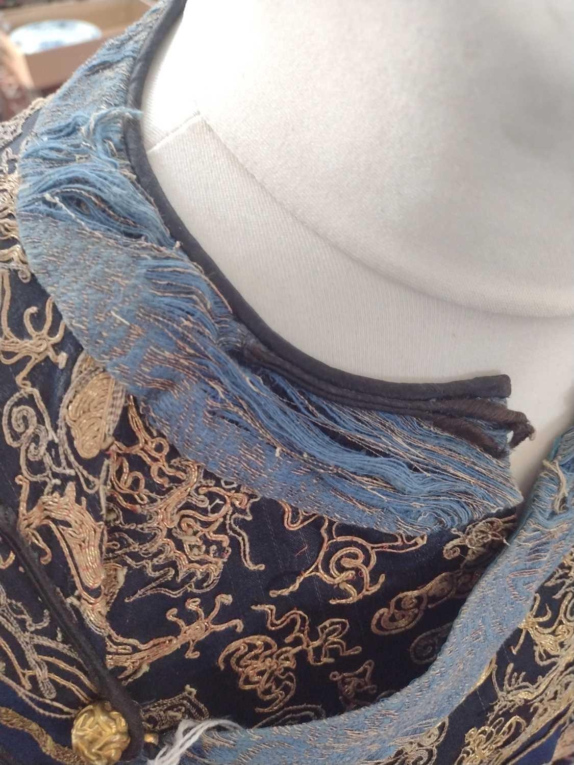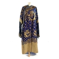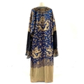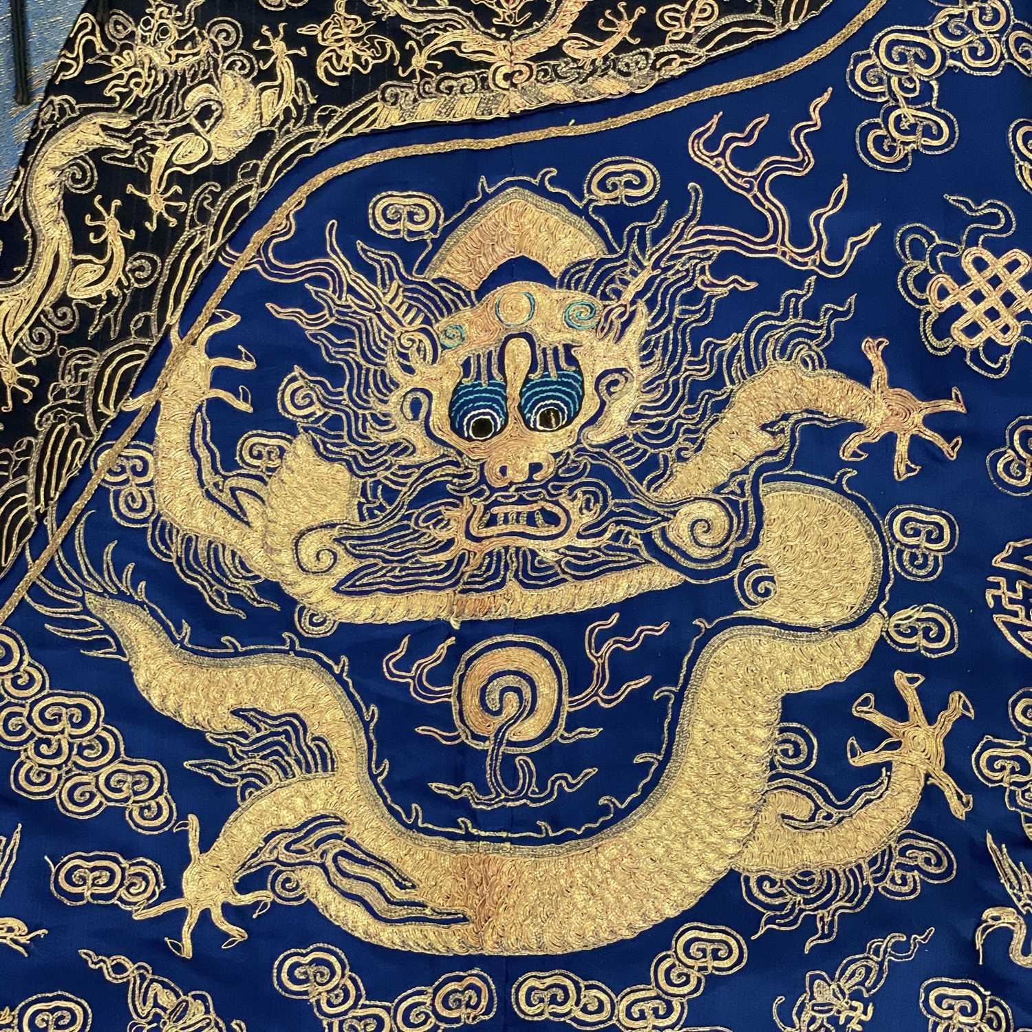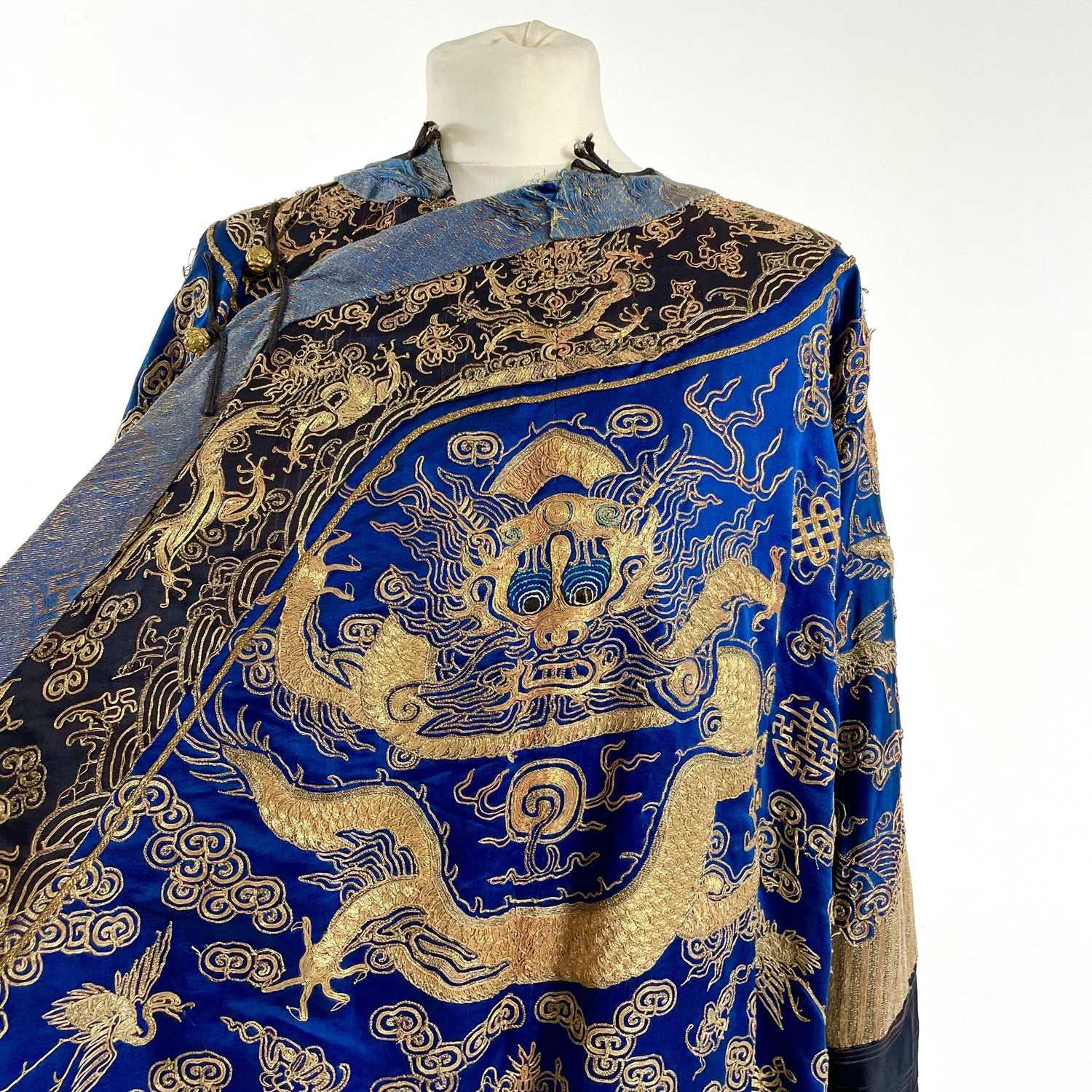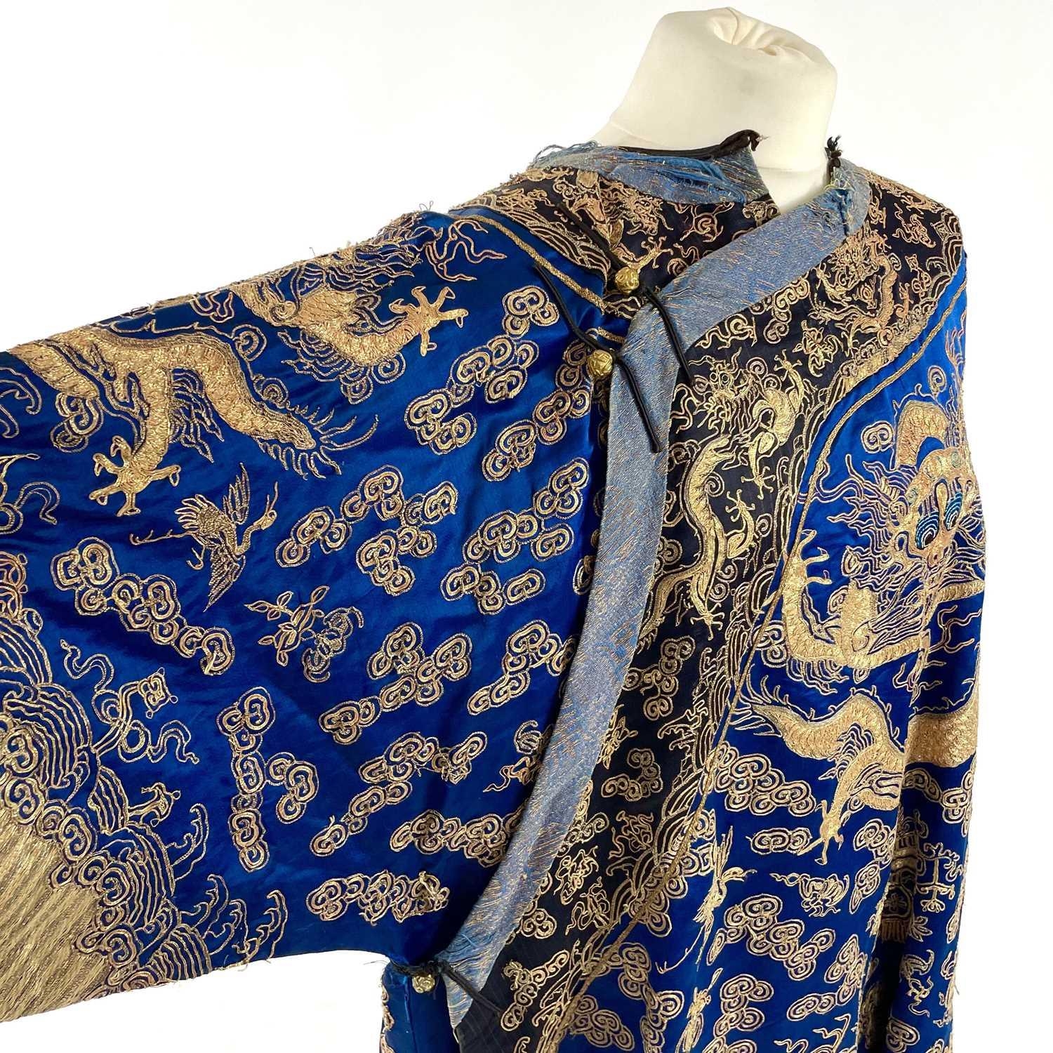 A Chinese embroidered dragon robe, late 19th century. The indigo silk robe embroidered with eight gold metal thread dragons chasing the flaming pearl, amongst clouds, pagodas and cranes, length 140cm.