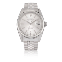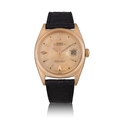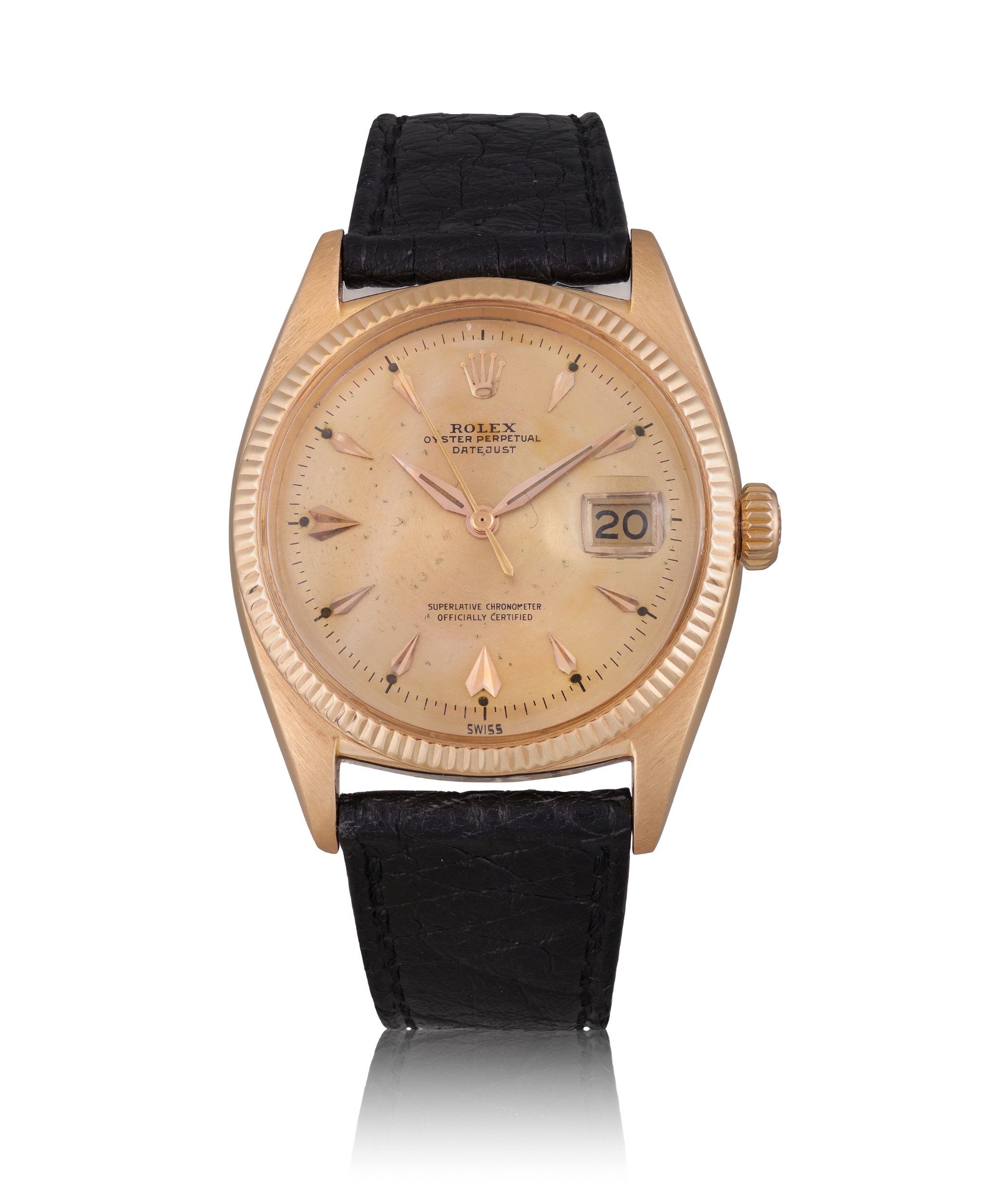 ROLEX OYSTER PERPETUAL DATEJUST, REF. 6605, 18K ROSE GOLD A fine and attractive 18K rose gold automatic wristwatch with date and fluted bezel. Year: Circa 1957–1958 Dial: Warm silvered dial with applied faceted triangular and baton indexes in rose gold, minute track with applied dot markers, date aperture at 3 with Cyclops magnifier, dauphine hands Calibre: Automatic, cal. 1065, numbered N716105, signed Rolex Case: 18K rose gold, fluted bezel, No. 309071 Dimensions: 36 mm Gross Weight: 53.27 g approx. Bracelet/Strap: Black leather strap with Rolex gold pin buckle Signature: Dial, case and movement signed