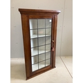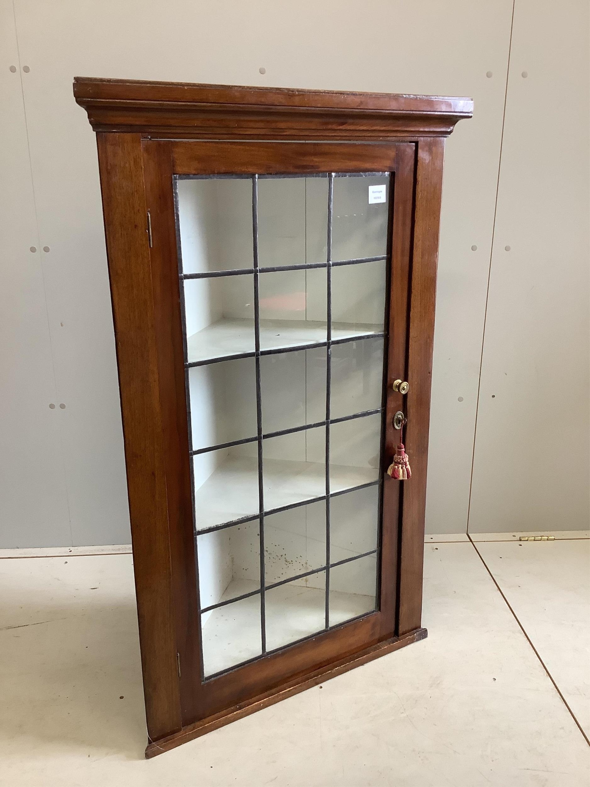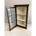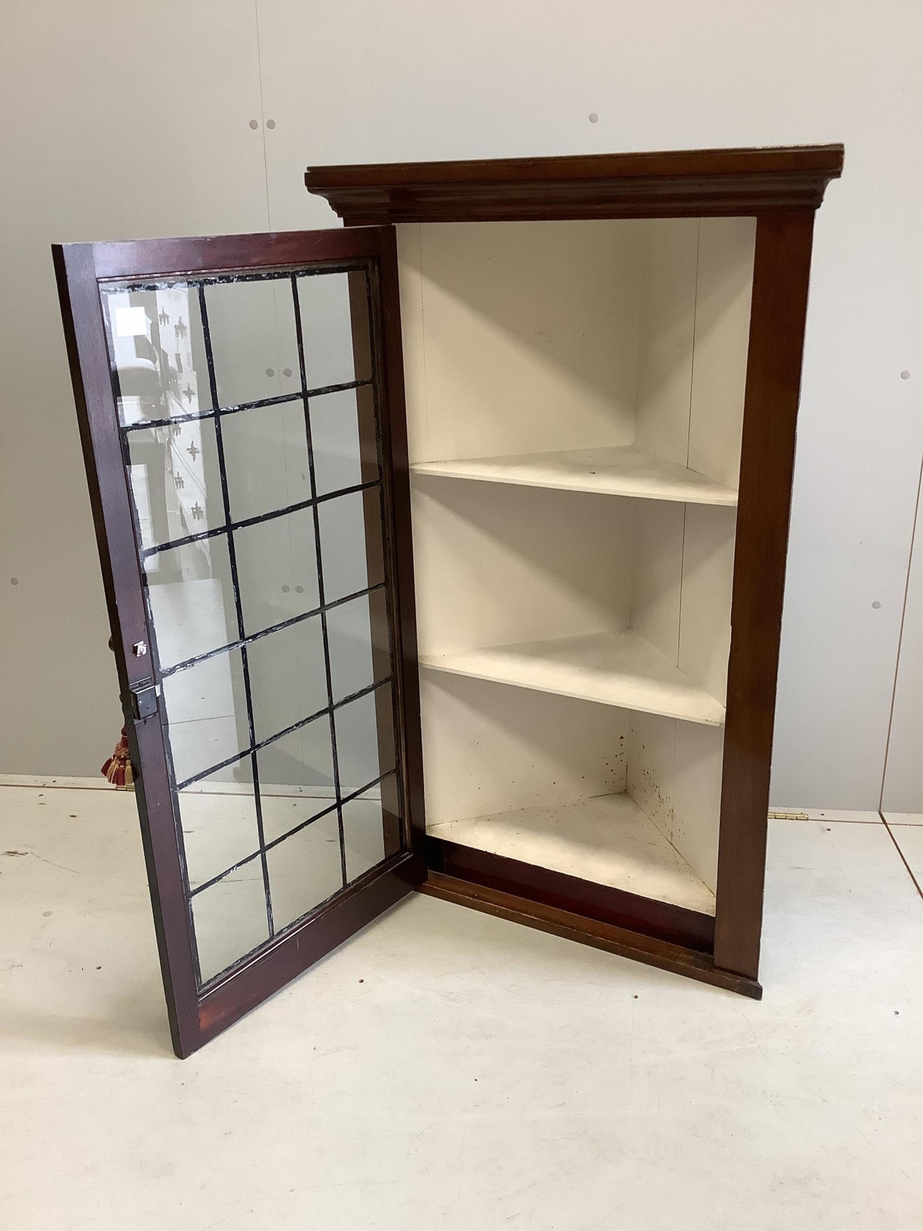 A George III style glazed mahogany hanging corner cabinet, with leaded glazing bars, width 77cm, depth 38cm, height 124cm. Condition - fair