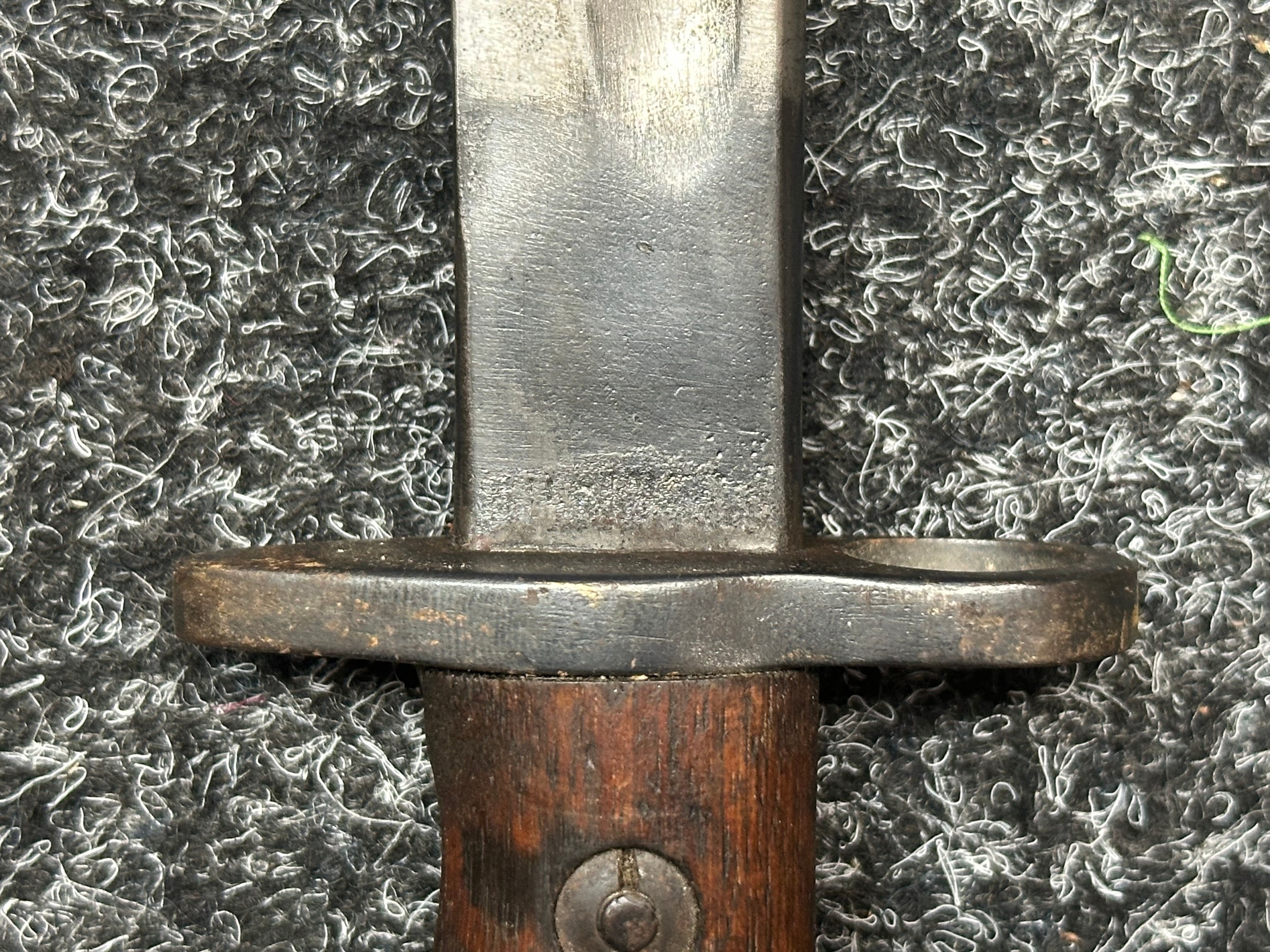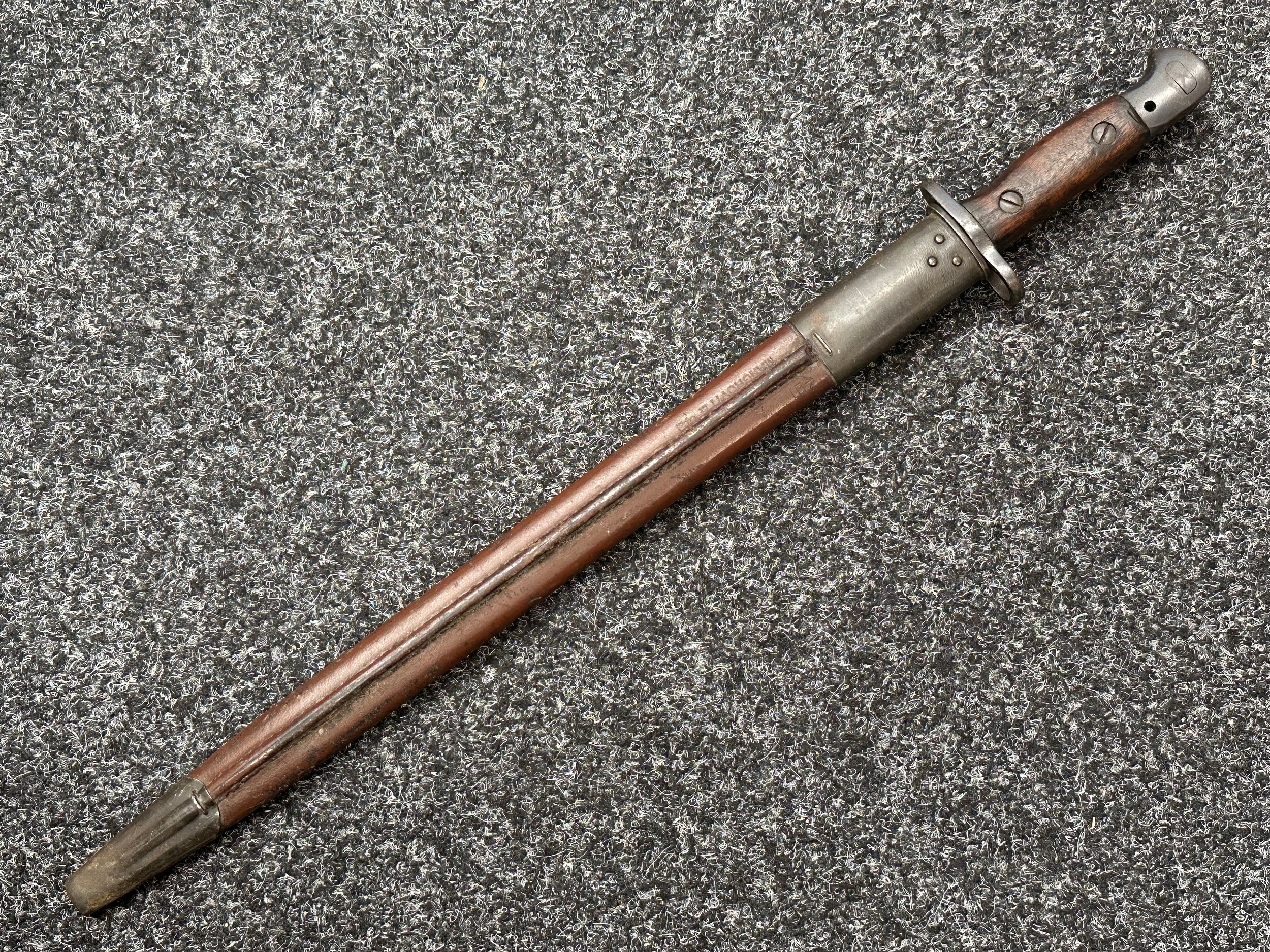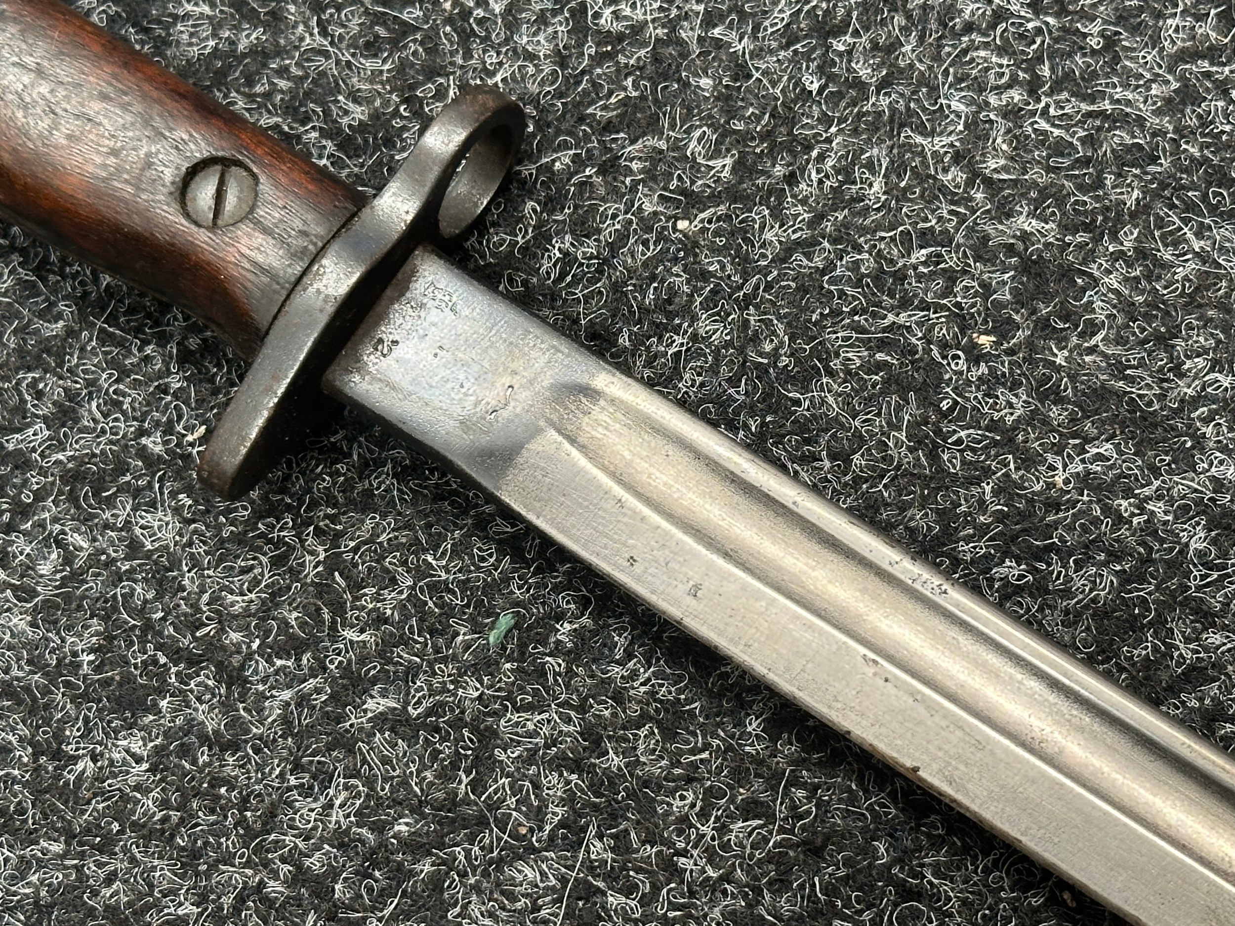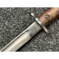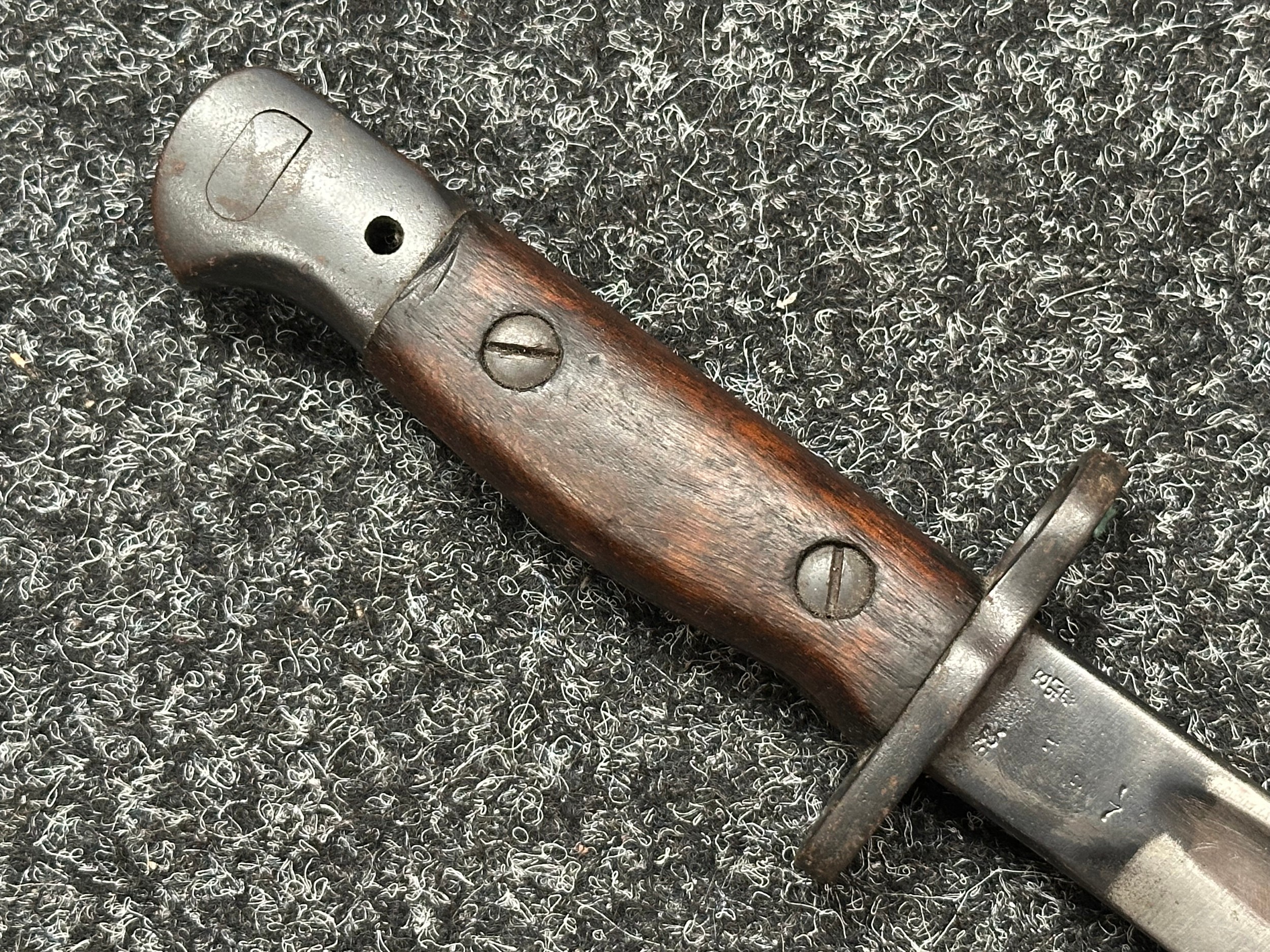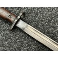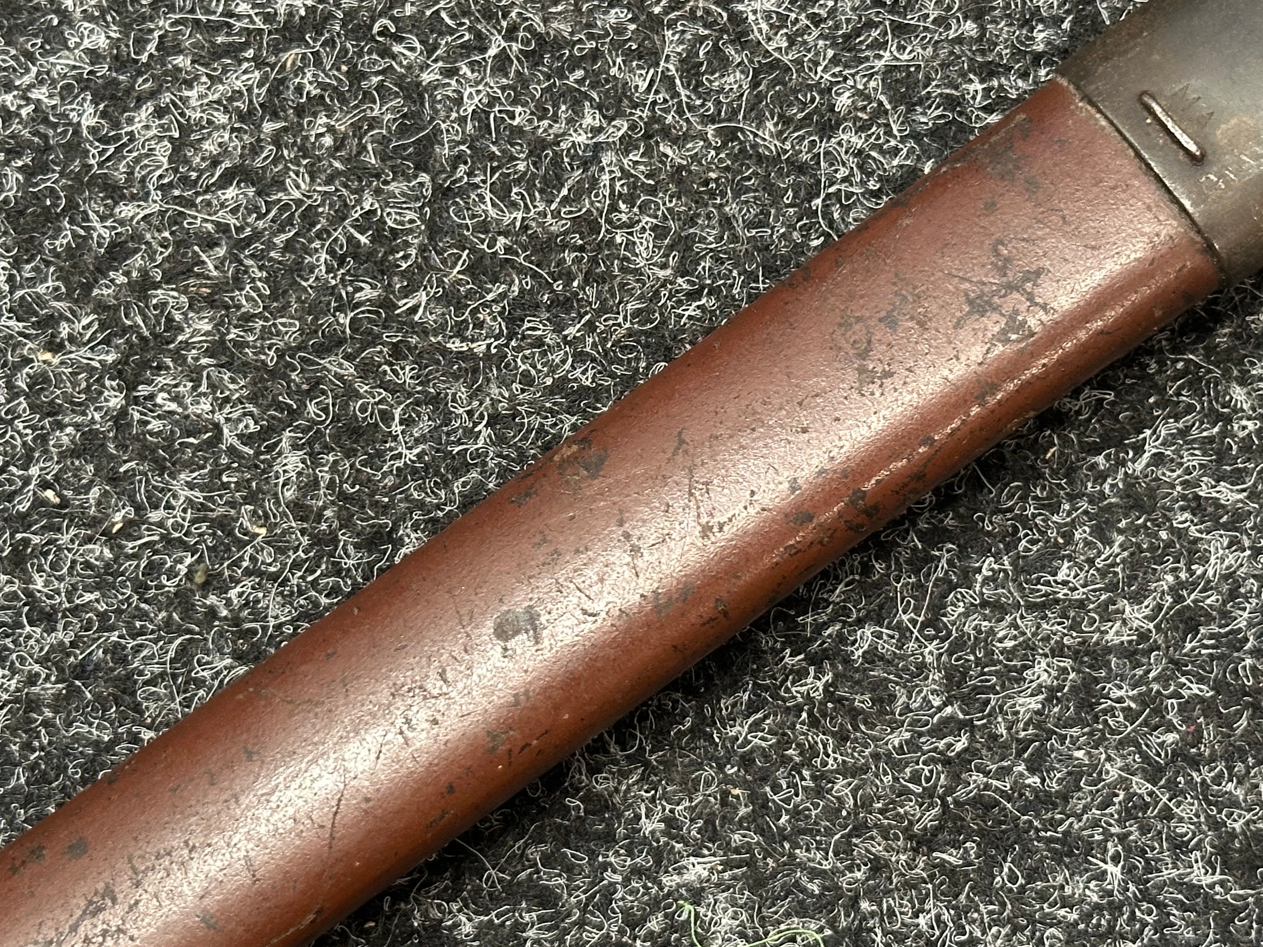 British 1907 Pattern Bayonet with single edged fullered blade 434mm in length, Enfield inspection marked with WD Broad Arrow, dated '23. Wooden grips, working release catch. Overall length 557mm. Complete with in Australian made scabbard, marked "Mangrovite 42"