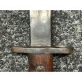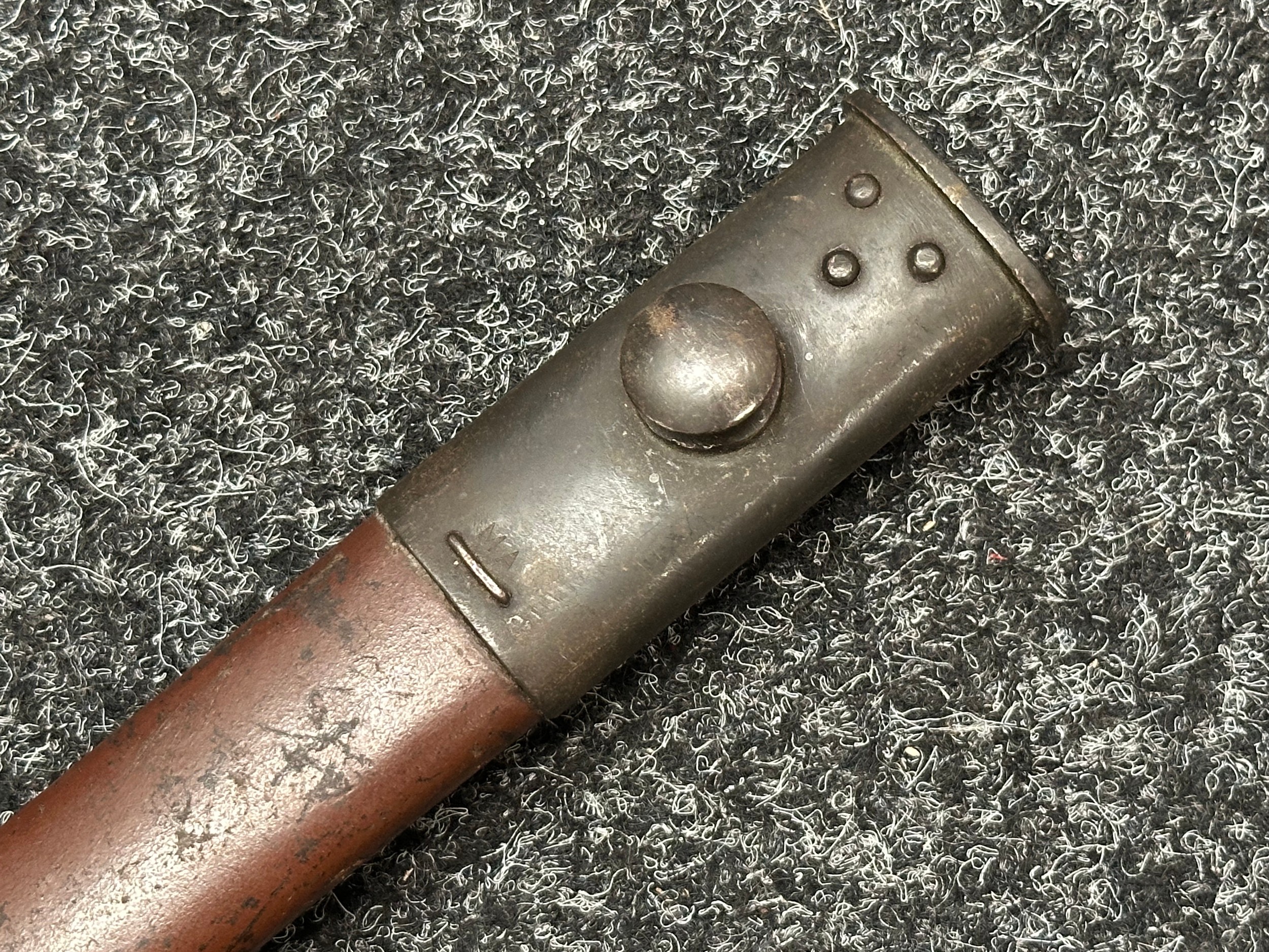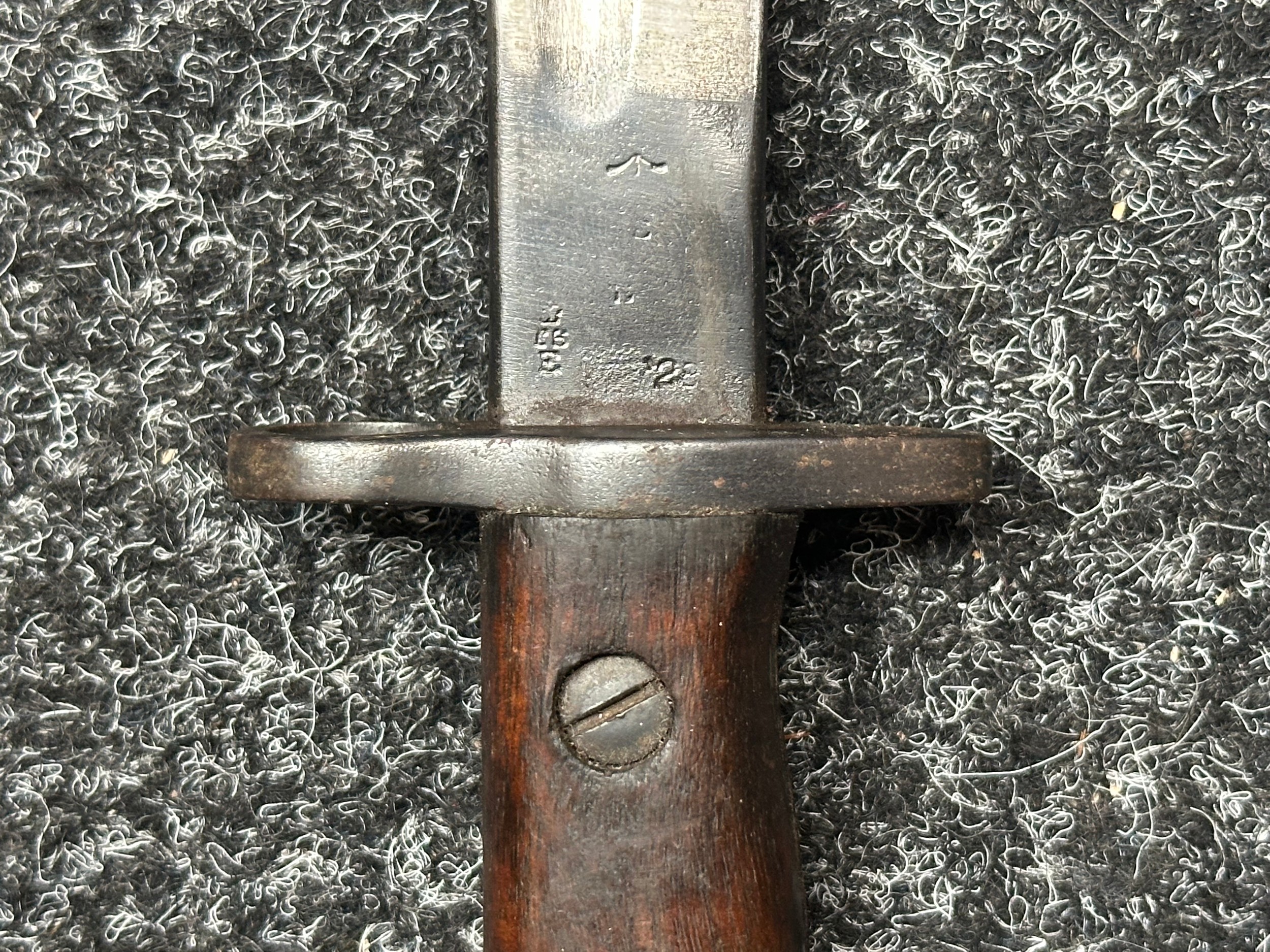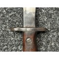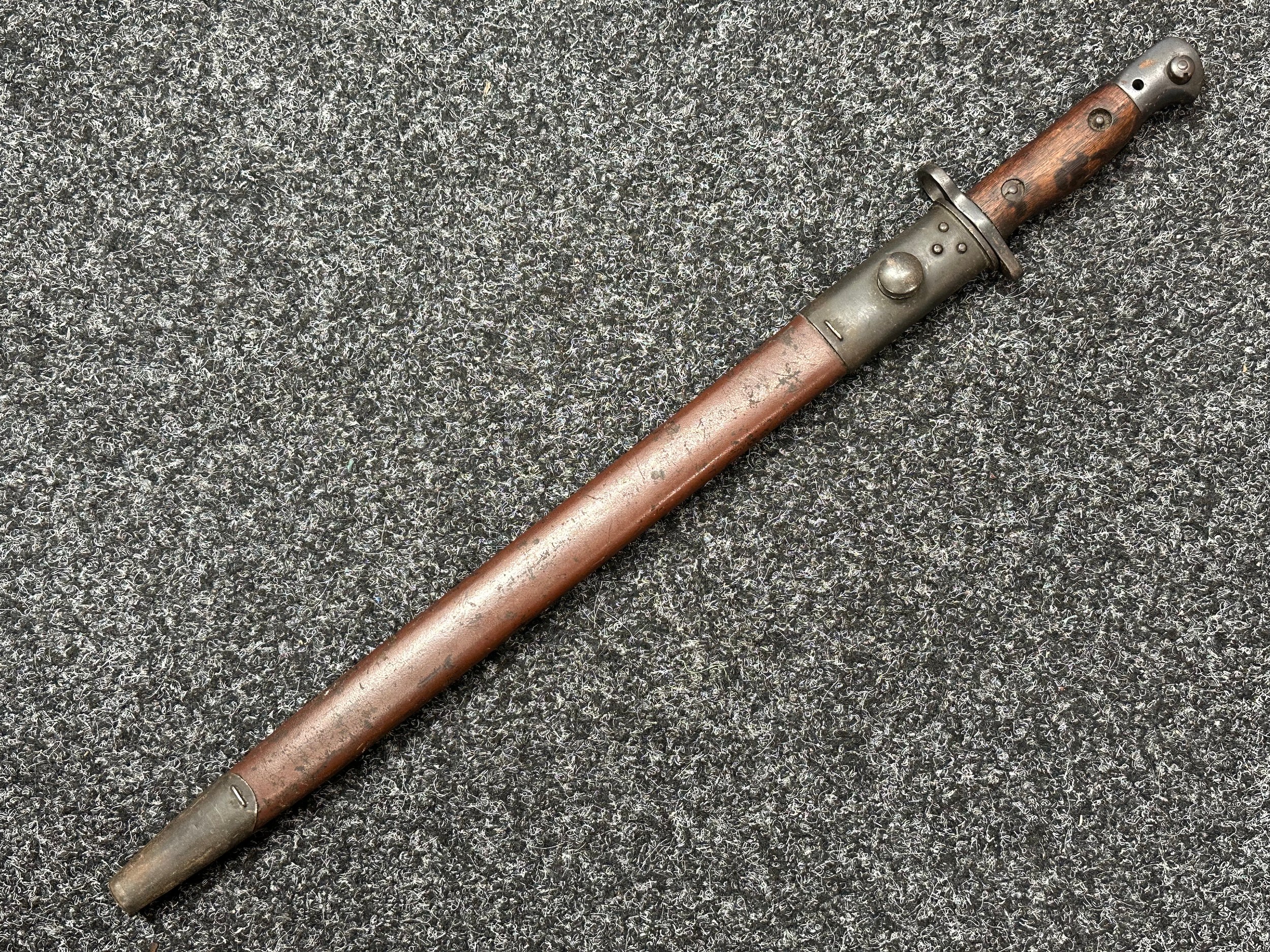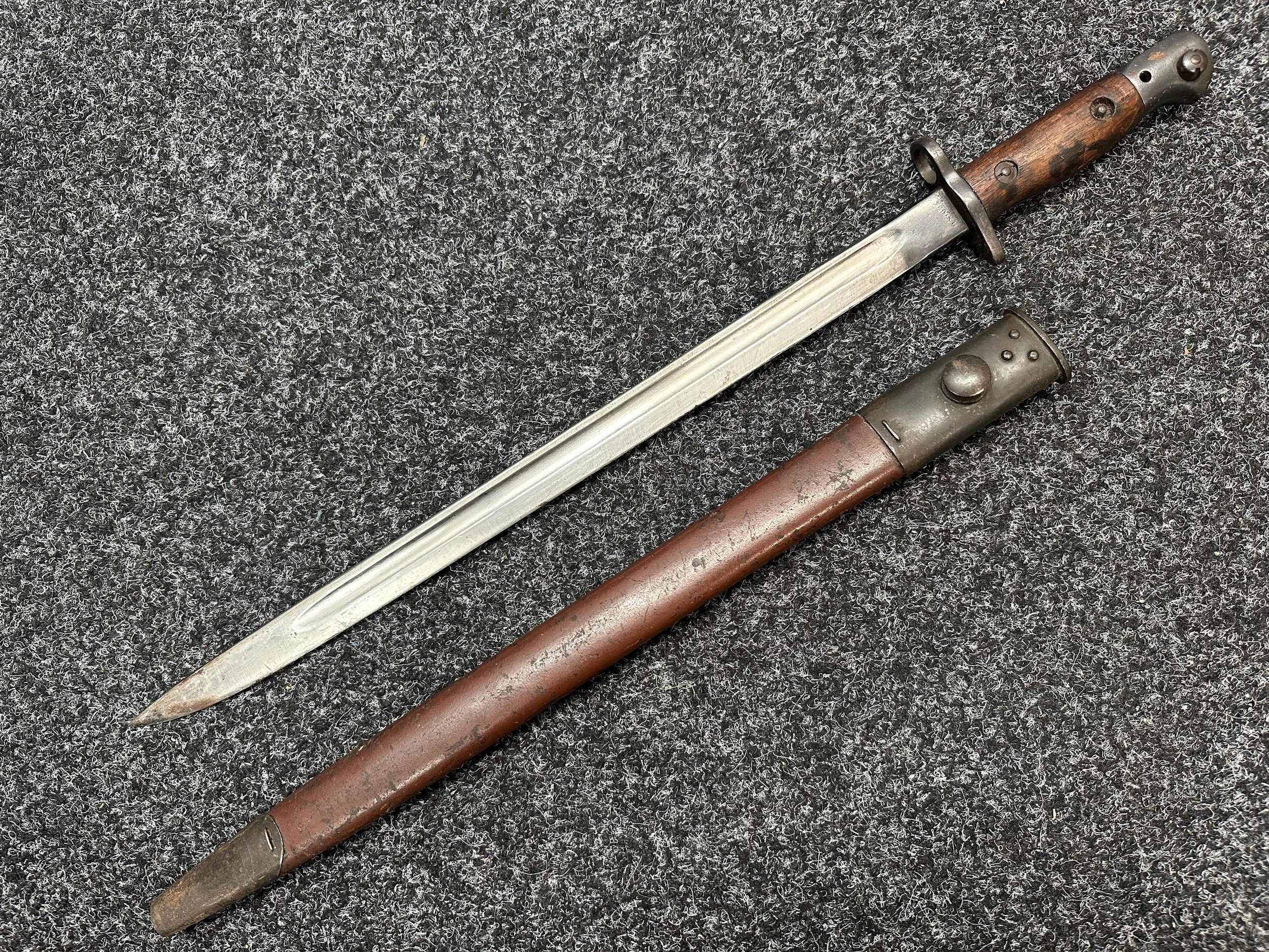 British 1907 Pattern Bayonet with single edged fullered blade 434mm in length, Enfield inspection marked with WD Broad Arrow, dated '23. Wooden grips, working release catch. Overall length 557mm. Complete with in Australian made scabbard, marked "Mangrovite 42"
