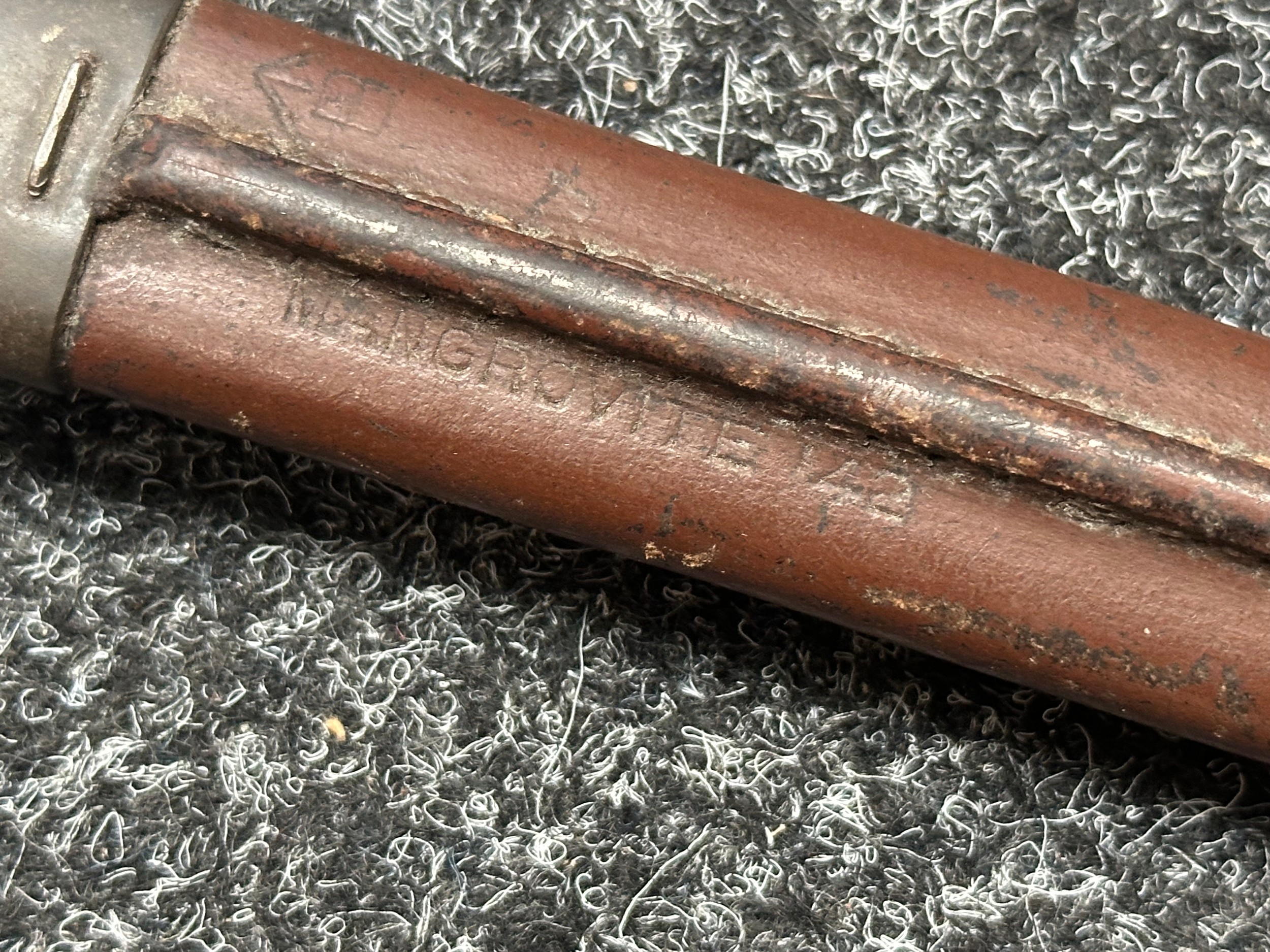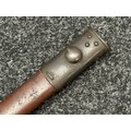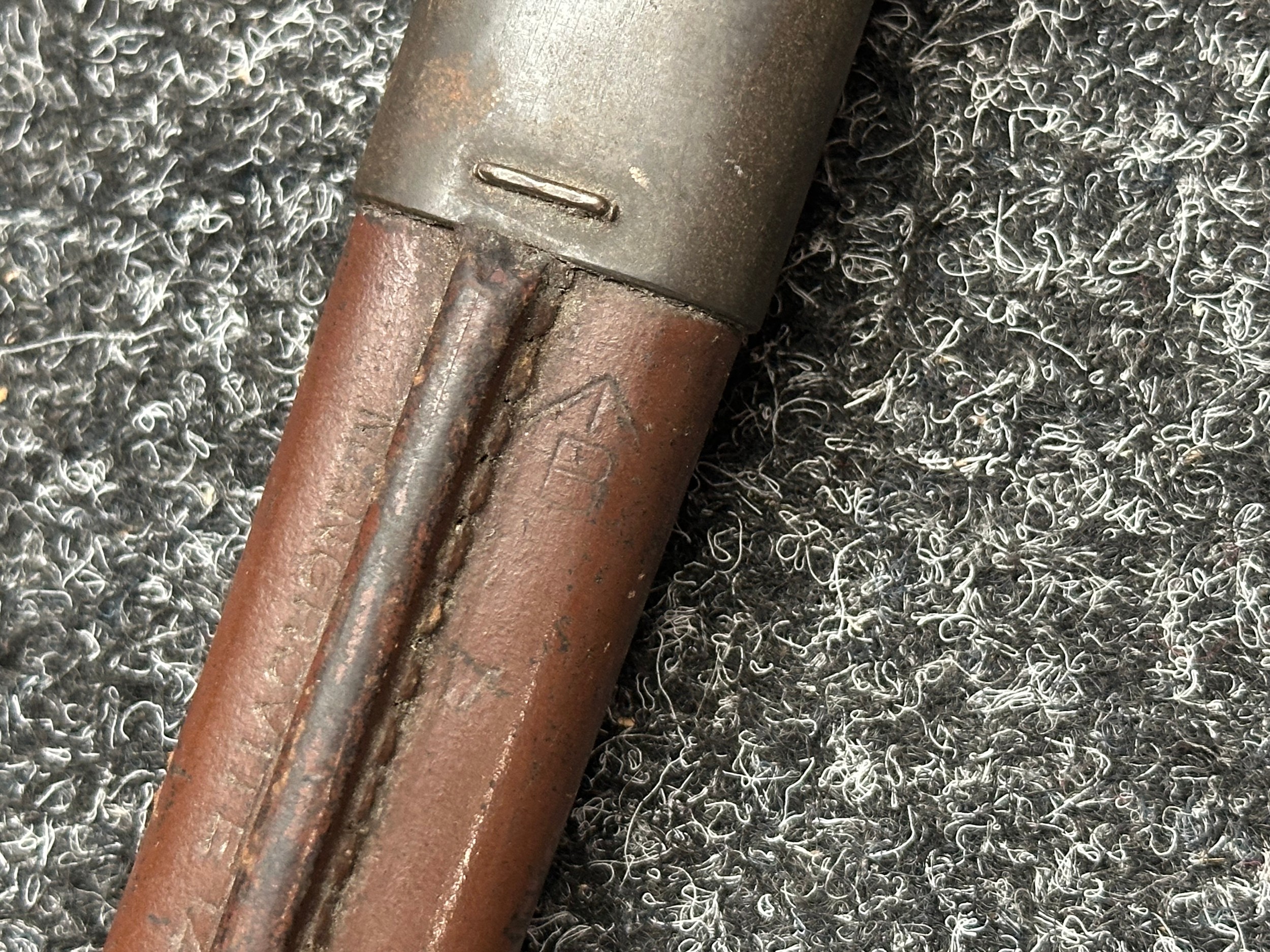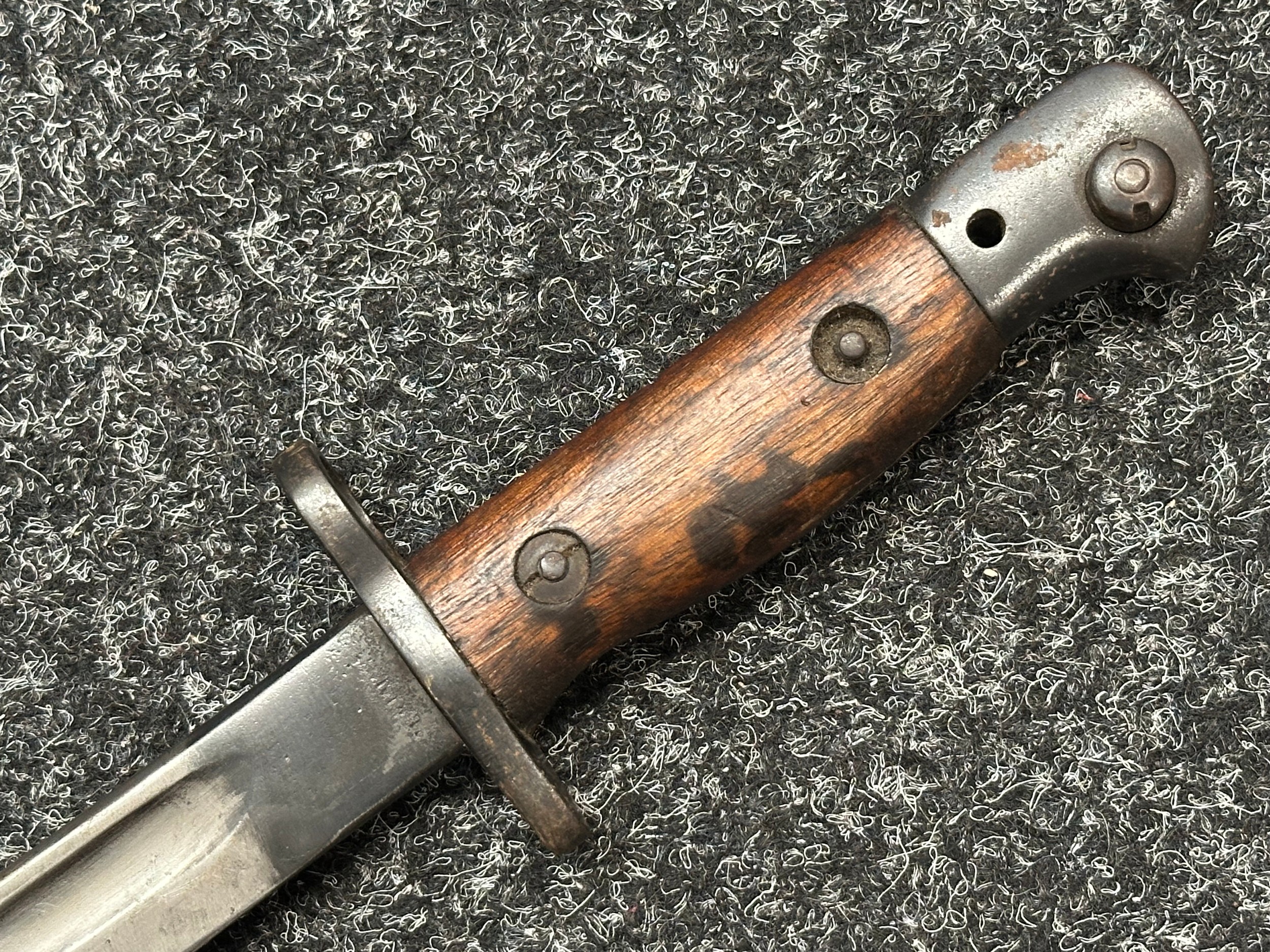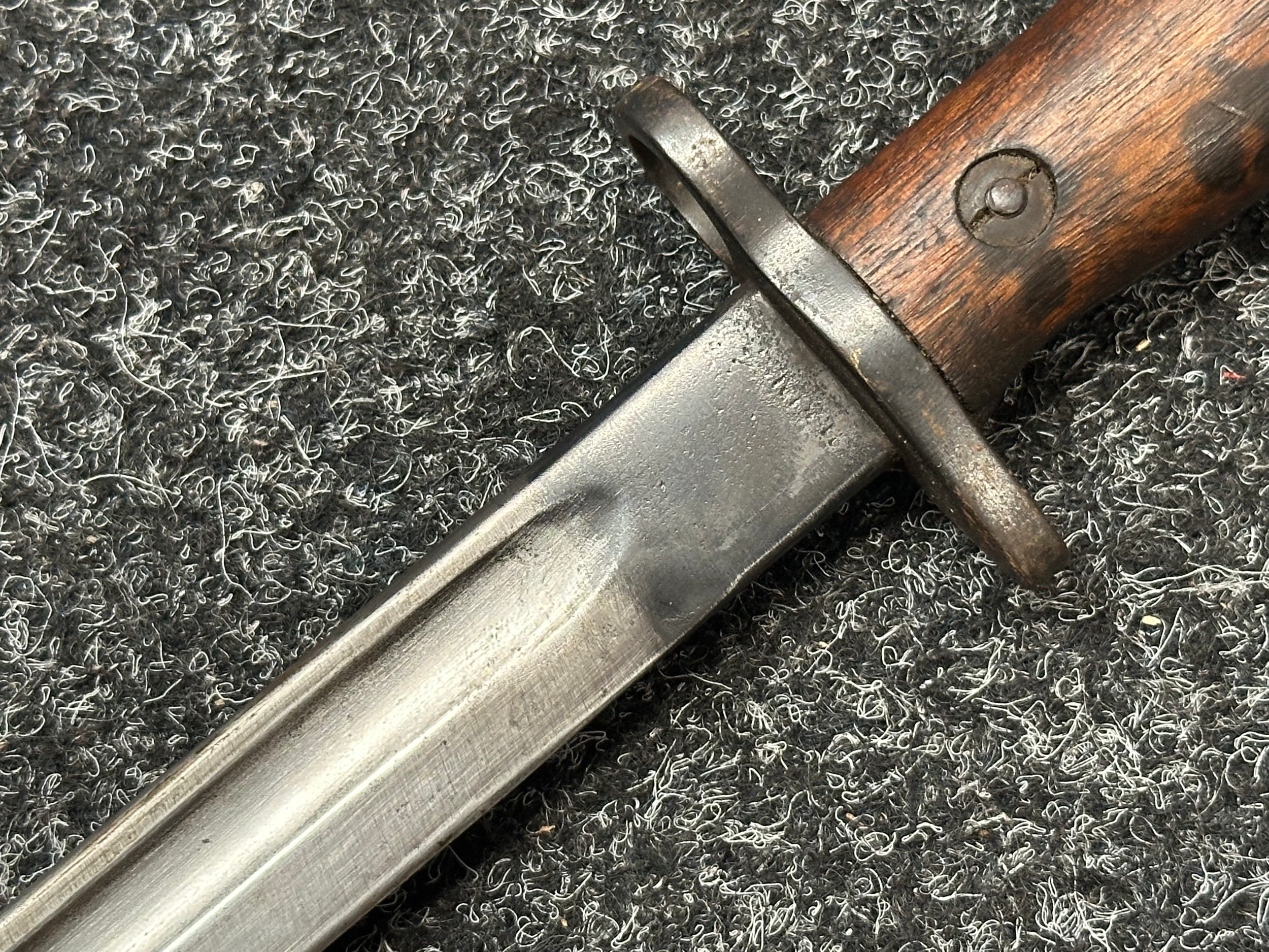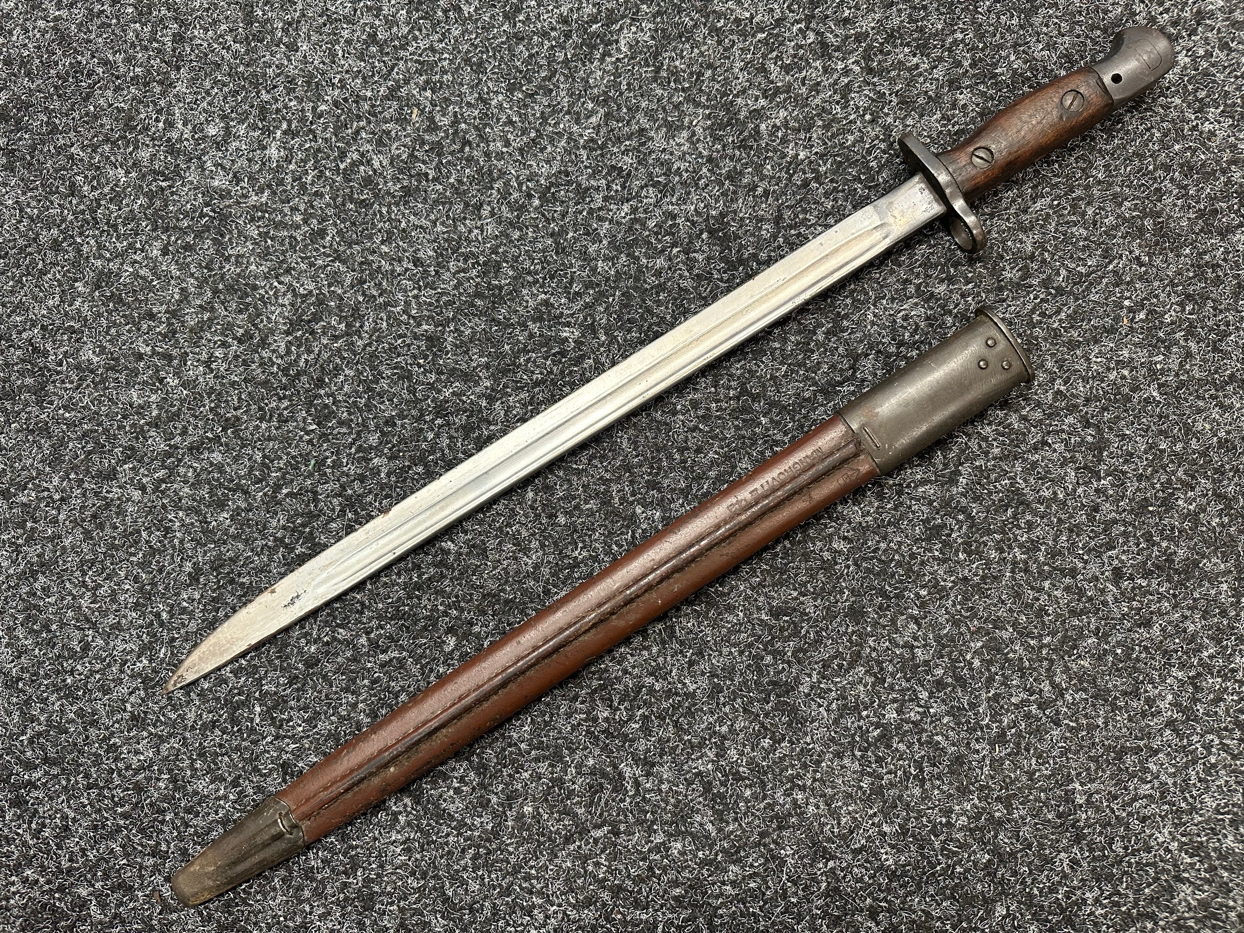 British 1907 Pattern Bayonet with single edged fullered blade 434mm in length, Enfield inspection marked with WD Broad Arrow, dated '23. Wooden grips, working release catch. Overall length 557mm. Complete with in Australian made scabbard, marked "Mangrovite 42"