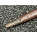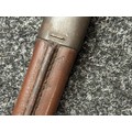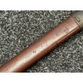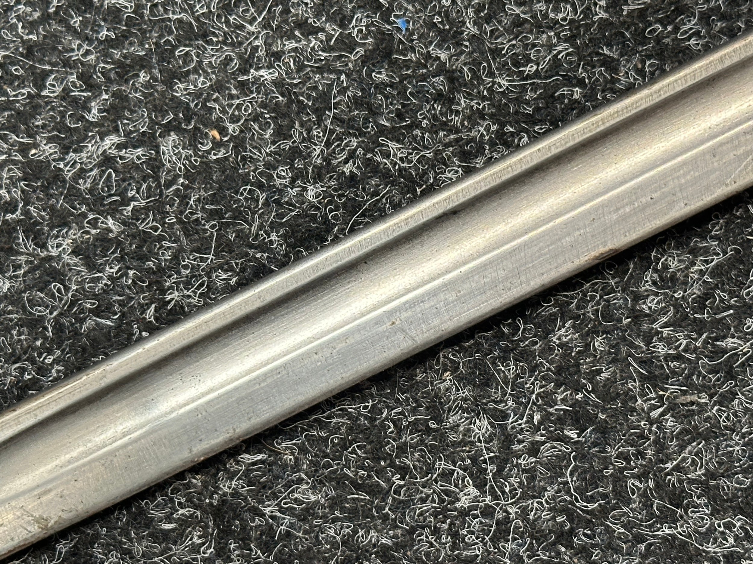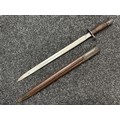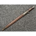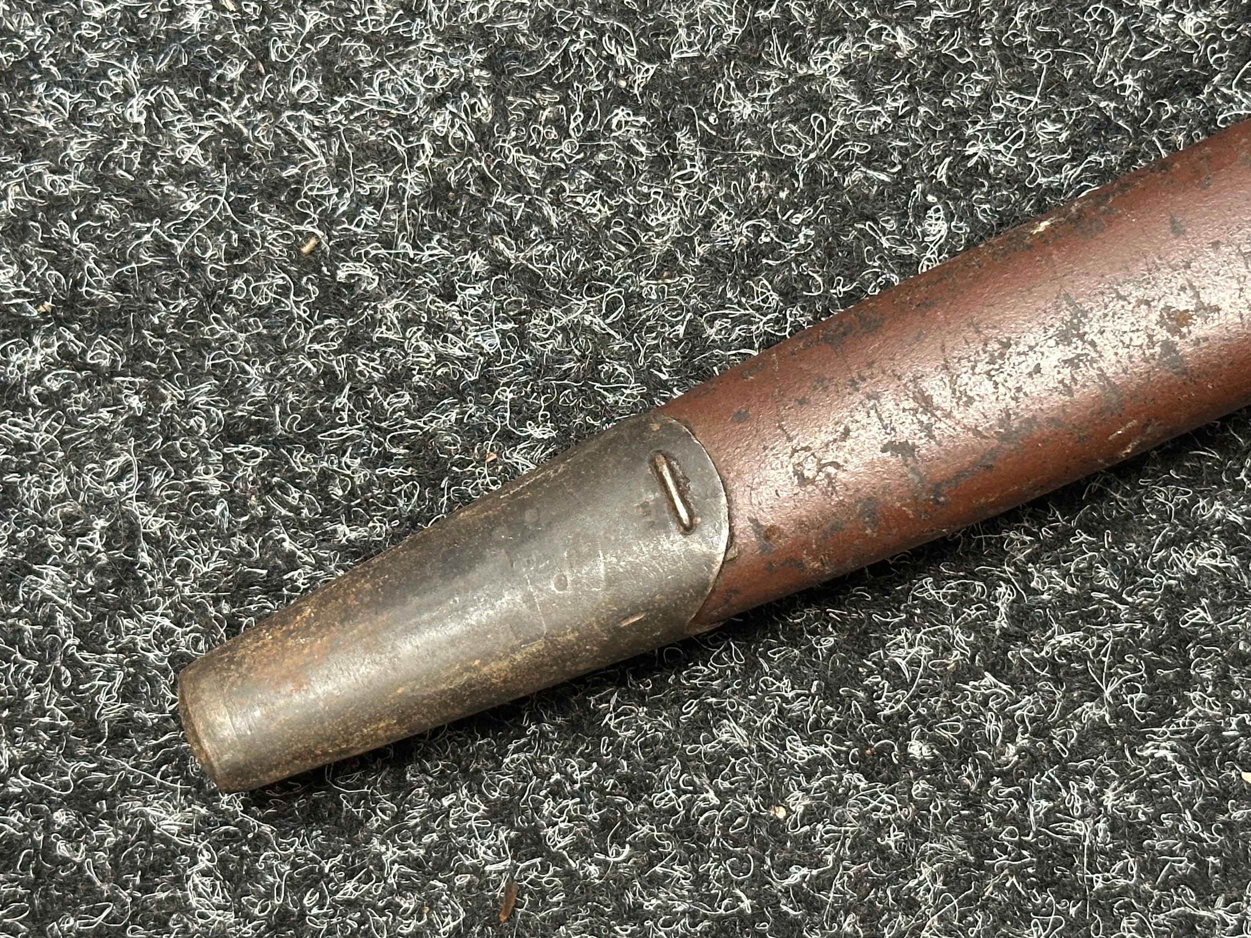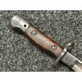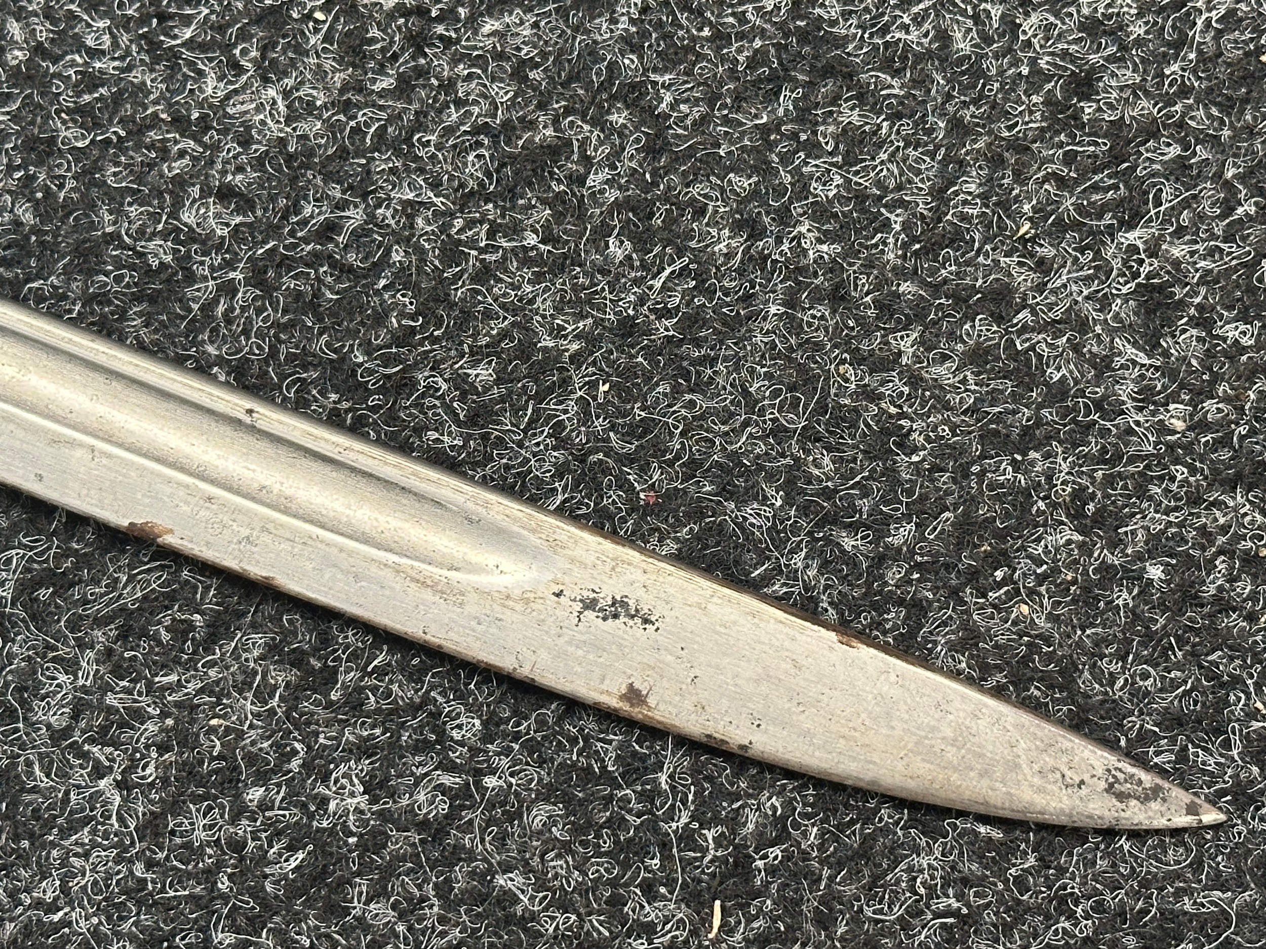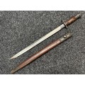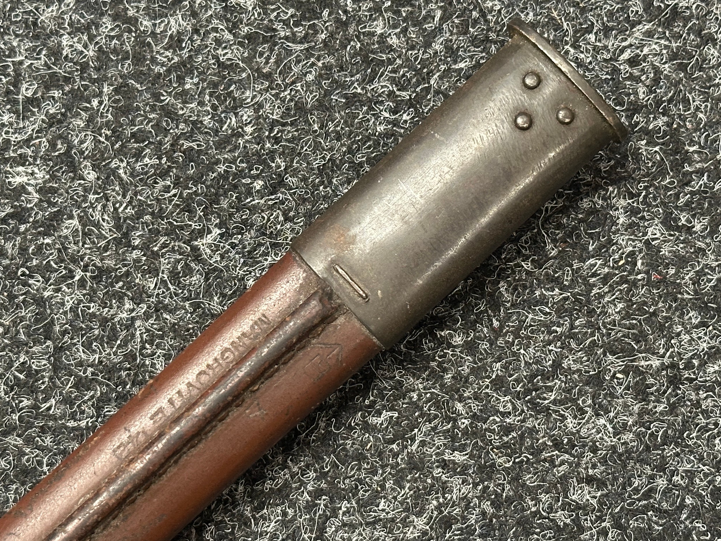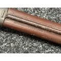 British 1907 Pattern Bayonet with single edged fullered blade 434mm in length, Enfield inspection marked with WD Broad Arrow, dated '23. Wooden grips, working release catch. Overall length 557mm. Complete with in Australian made scabbard, marked "Mangrovite 42"