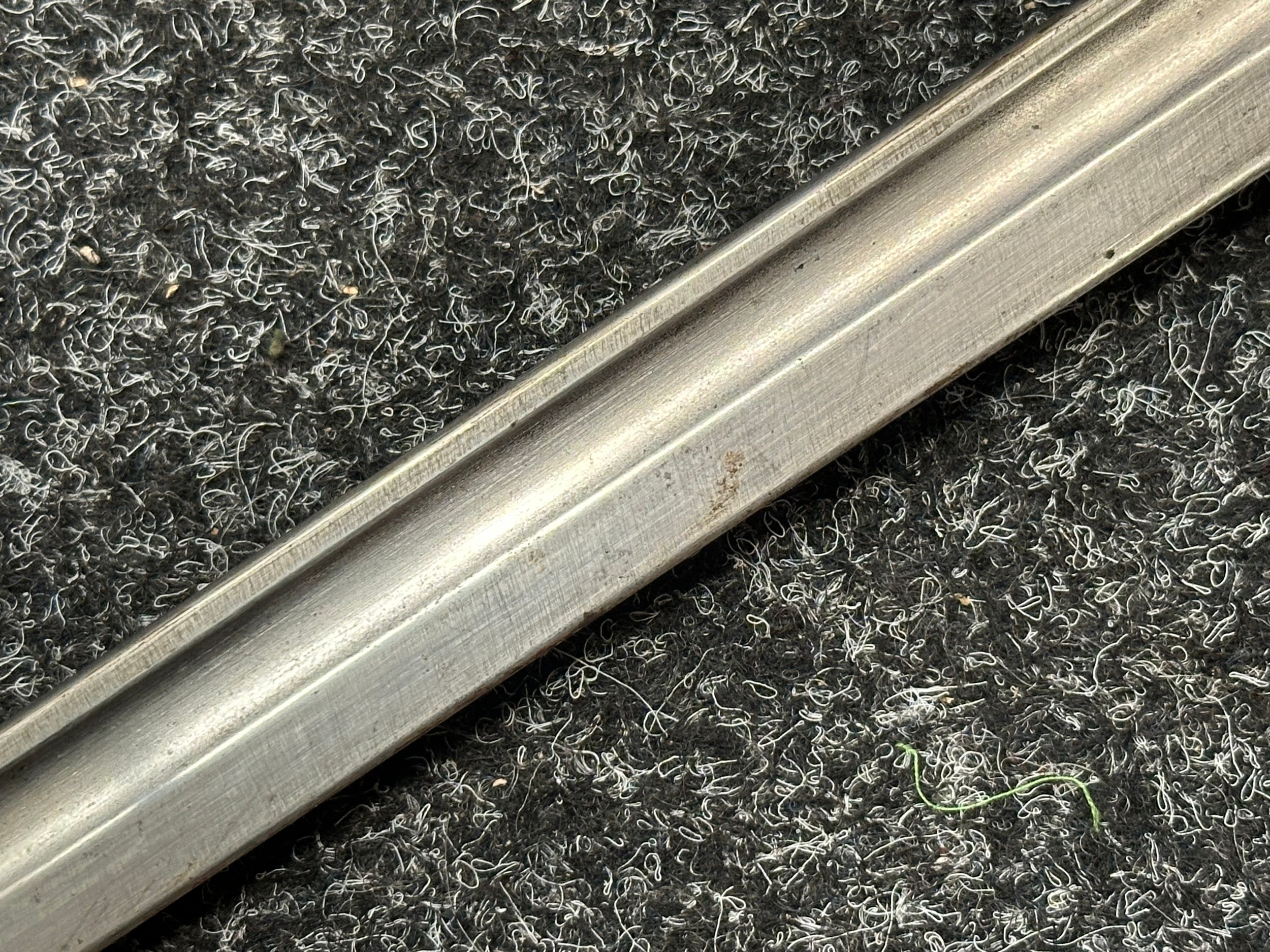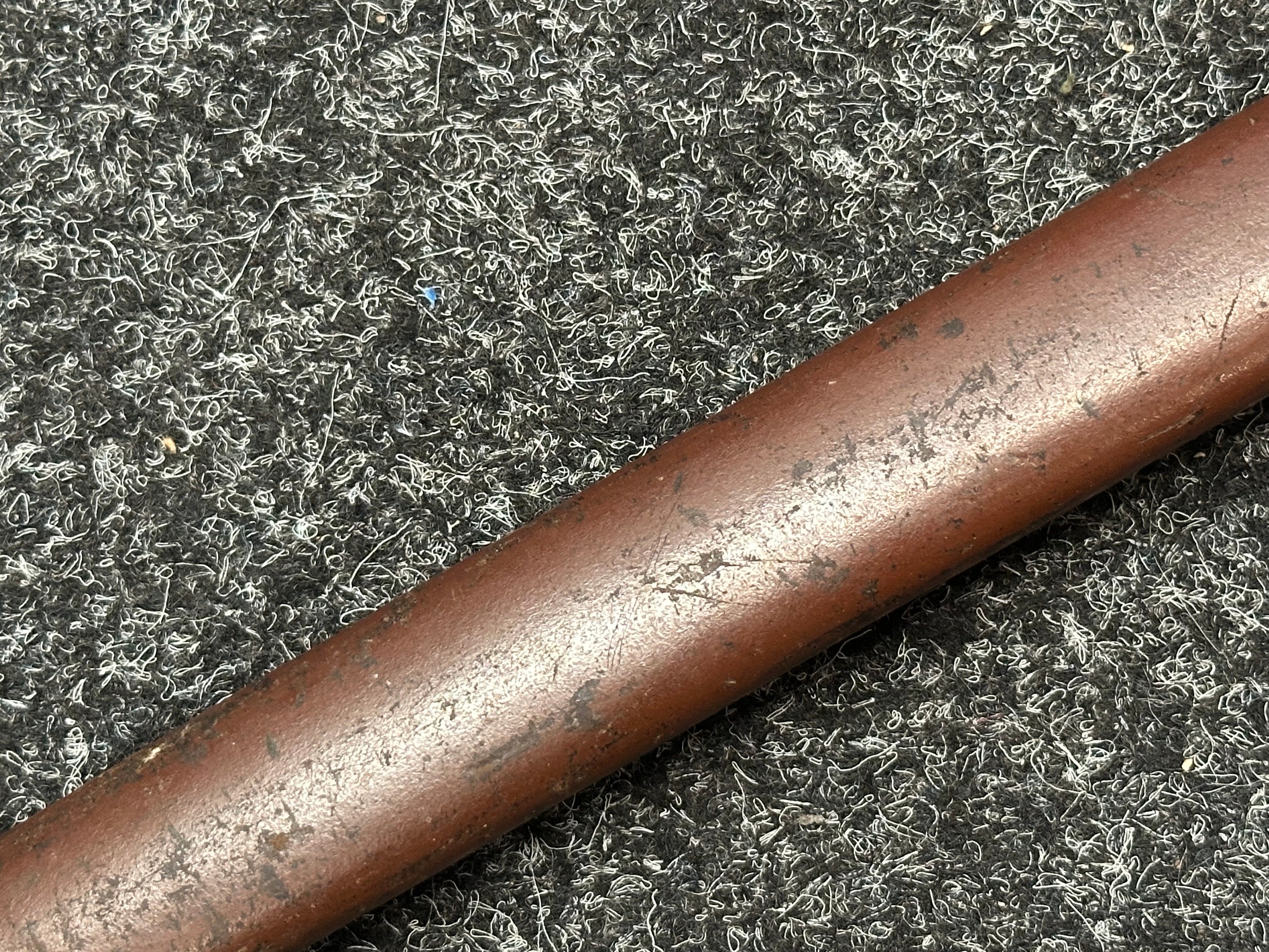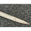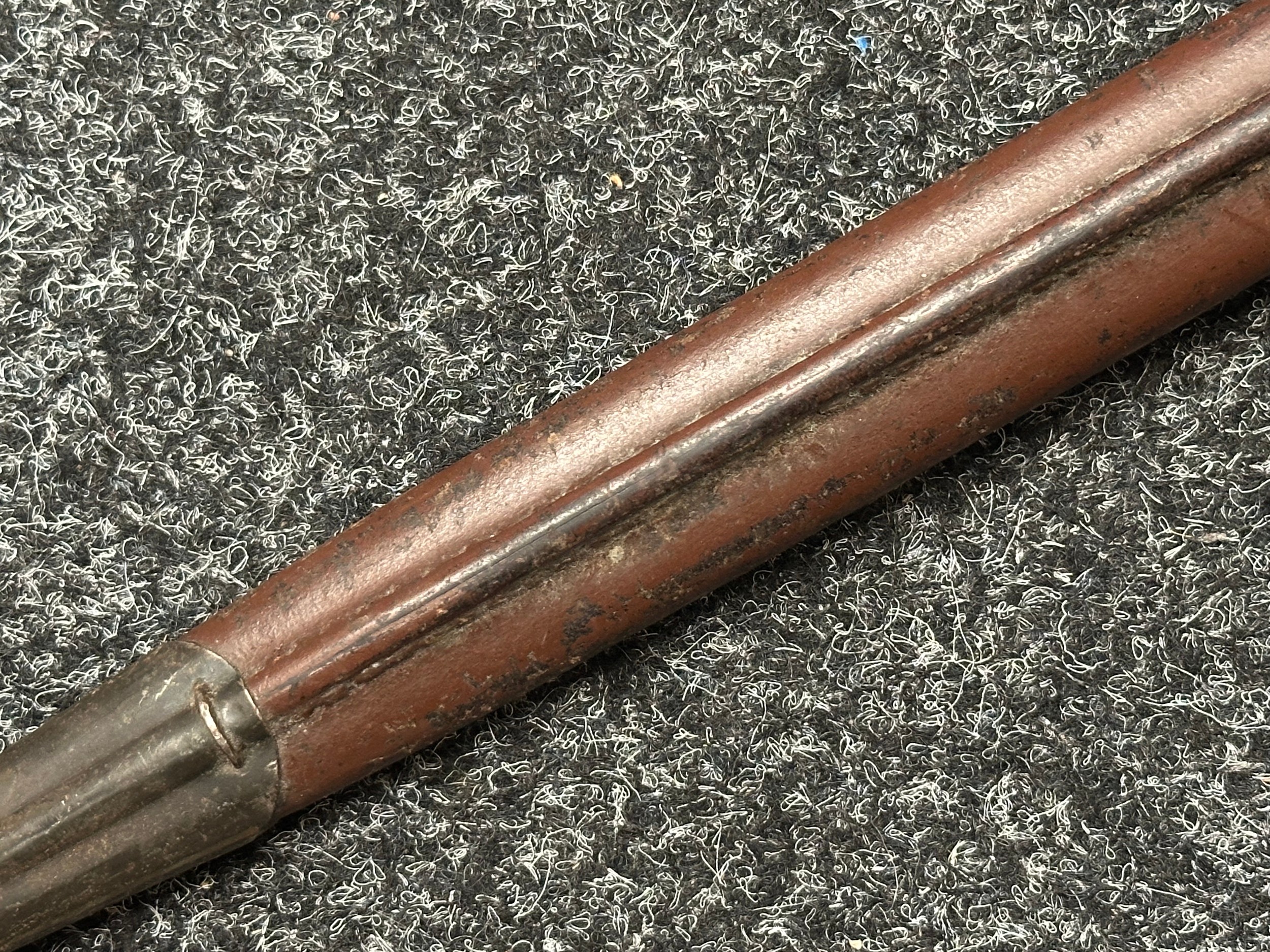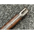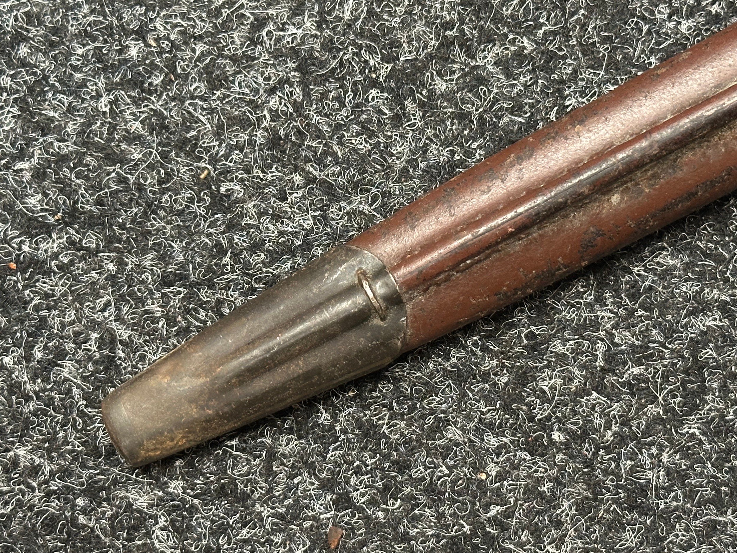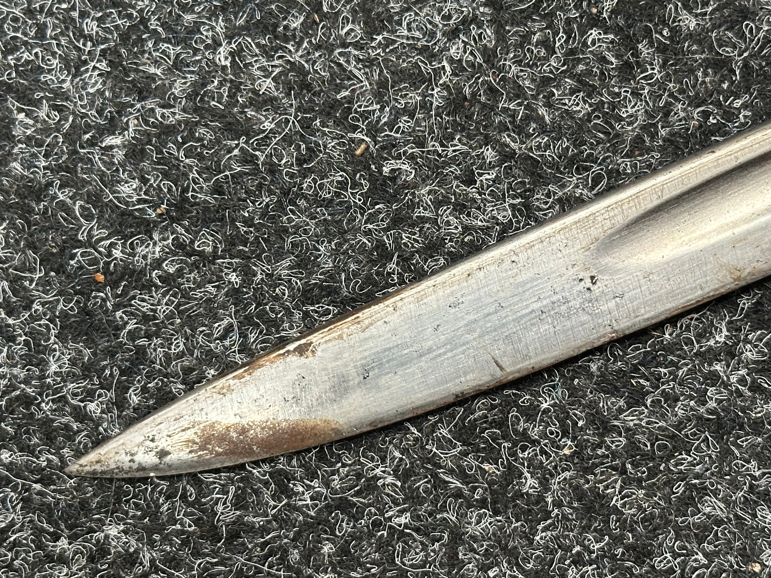 British 1907 Pattern Bayonet with single edged fullered blade 434mm in length, Enfield inspection marked with WD Broad Arrow, dated '23. Wooden grips, working release catch. Overall length 557mm. Complete with in Australian made scabbard, marked "Mangrovite 42"