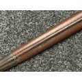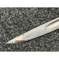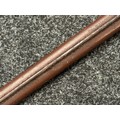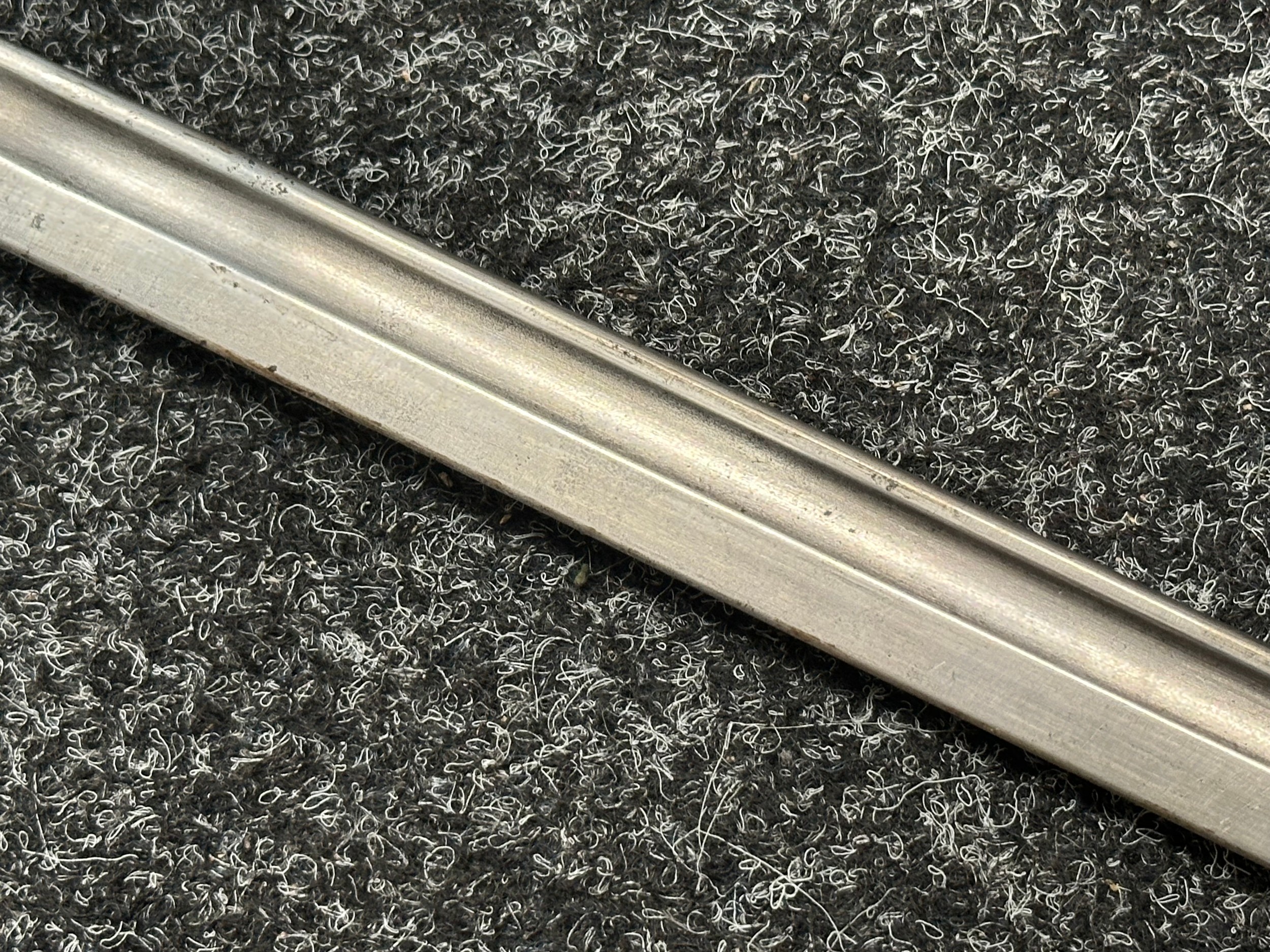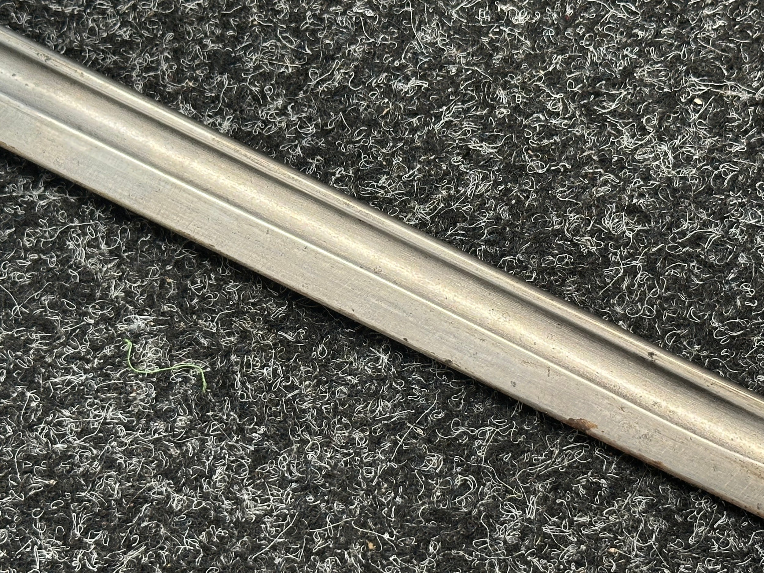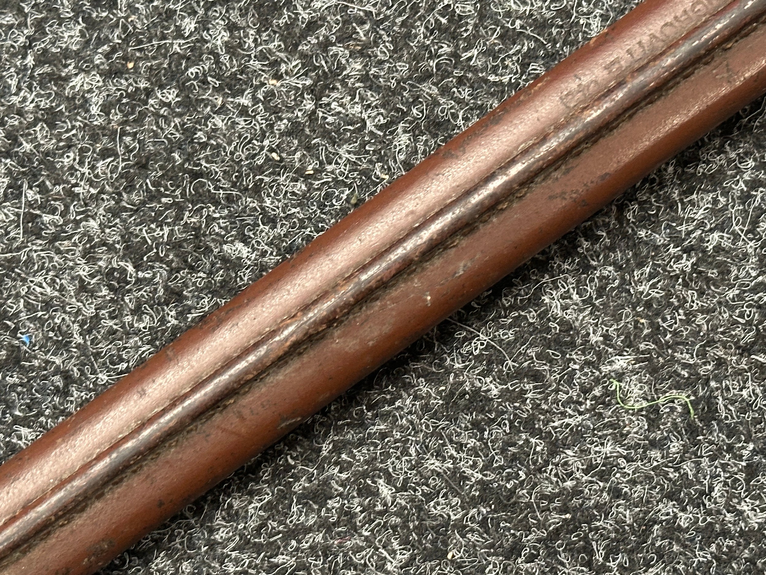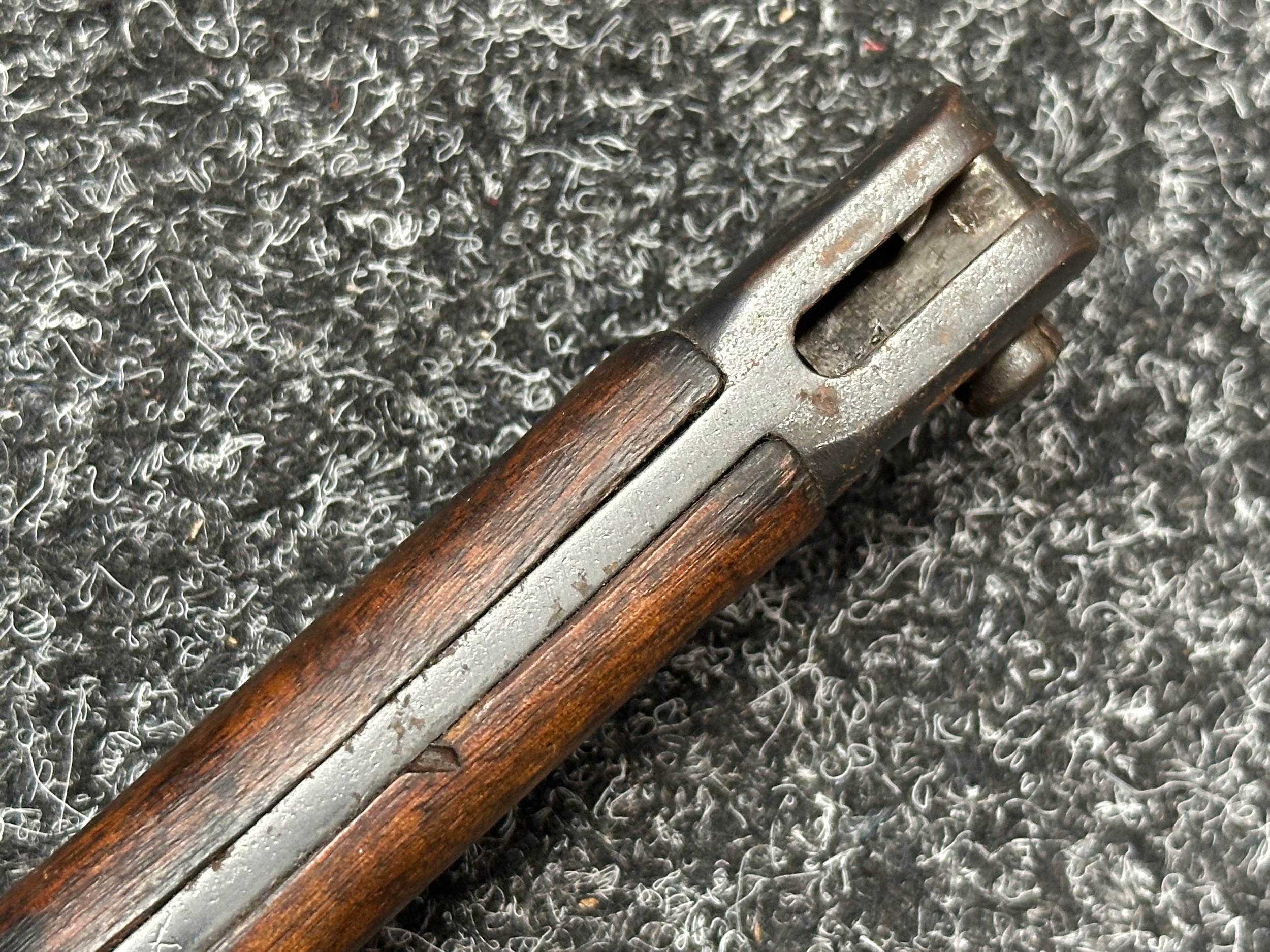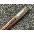 British 1907 Pattern Bayonet with single edged fullered blade 434mm in length, Enfield inspection marked with WD Broad Arrow, dated '23. Wooden grips, working release catch. Overall length 557mm. Complete with in Australian made scabbard, marked "Mangrovite 42"