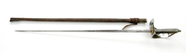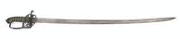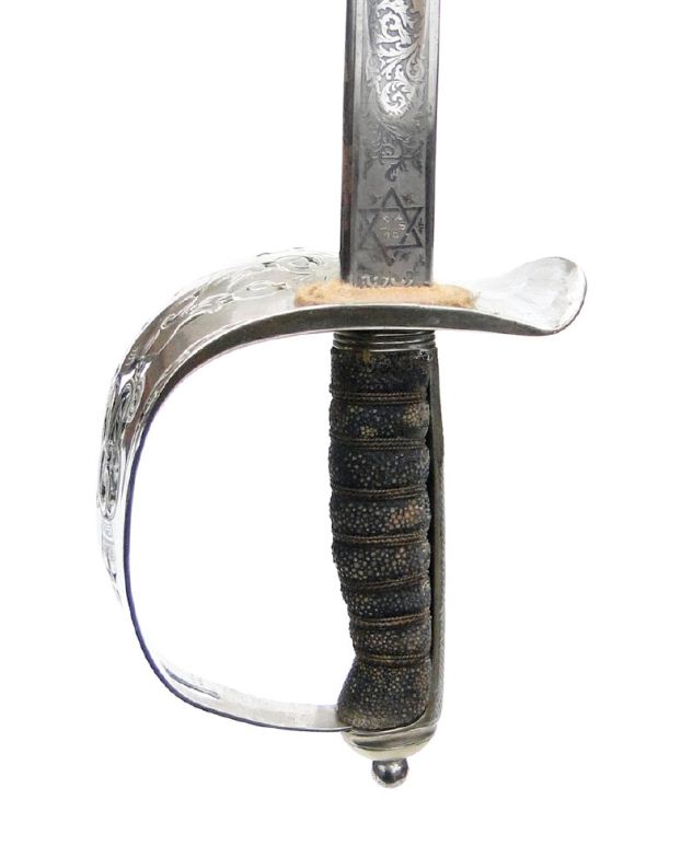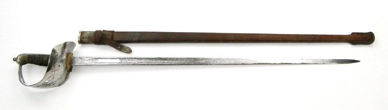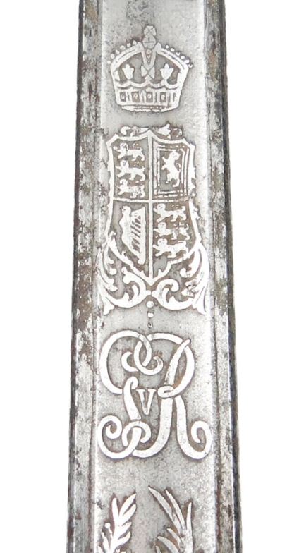 George V British military steel bladed sword with etched blade, wire bound simulated shagreen handle and leather mounted sheath, 103cm in length