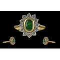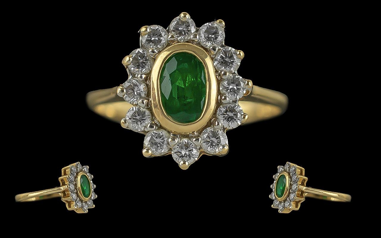 Ladies - Attractive 18ct Gold Emerald and Diamond Set Cluster Ring, Full Hallmark to Interior of Shank, The Central Emerald of Pleasing Colour, Surrounded by 12 Small Brilliant Cut Diamonds of Good Colour / Clarity. Est Diamond Weight 0.60 pts. Ring Size L. Weight 3.3 grams.