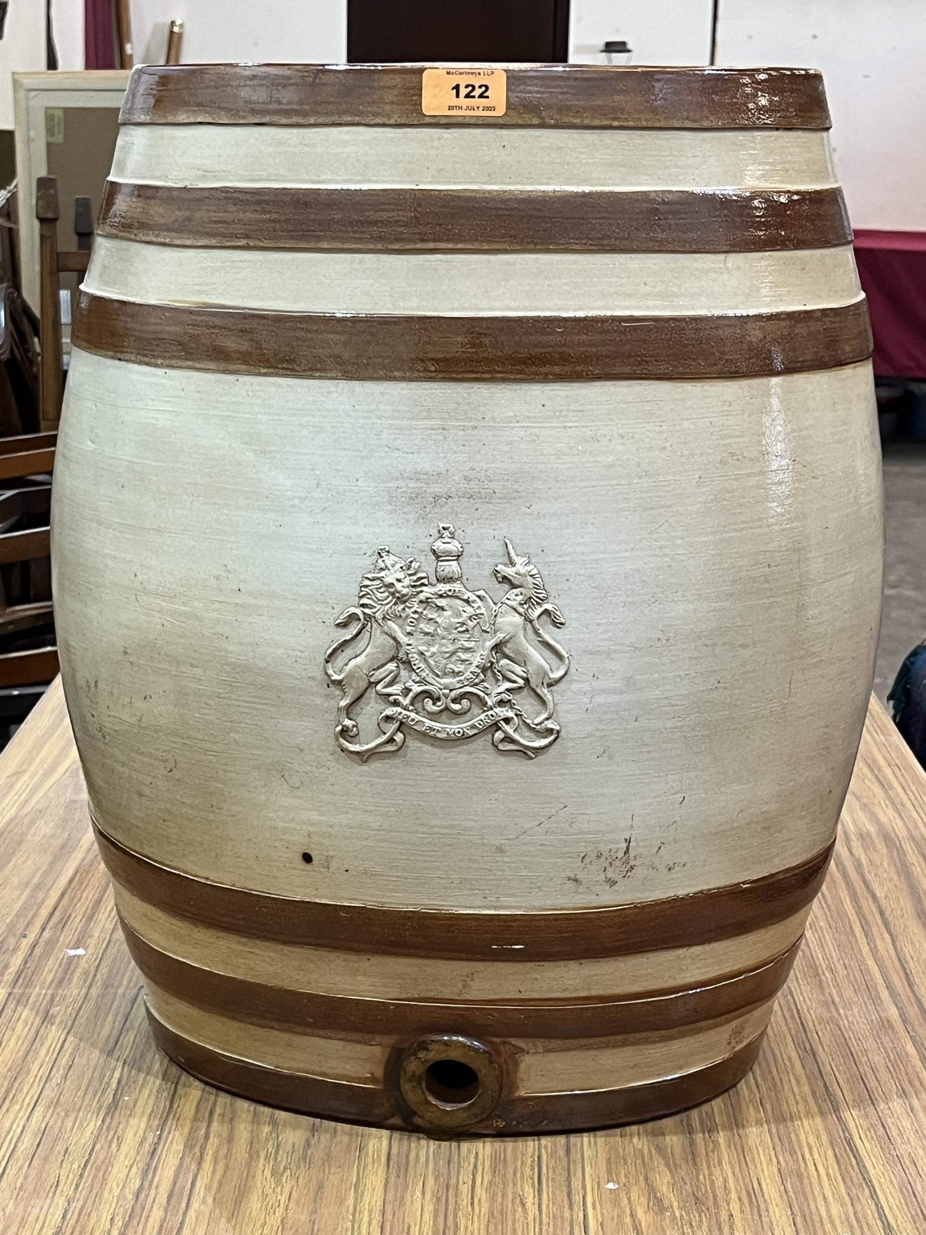 A Doulton & Watts stoneware 10 gallon barrel with royal armorial in relief. 21¼' high