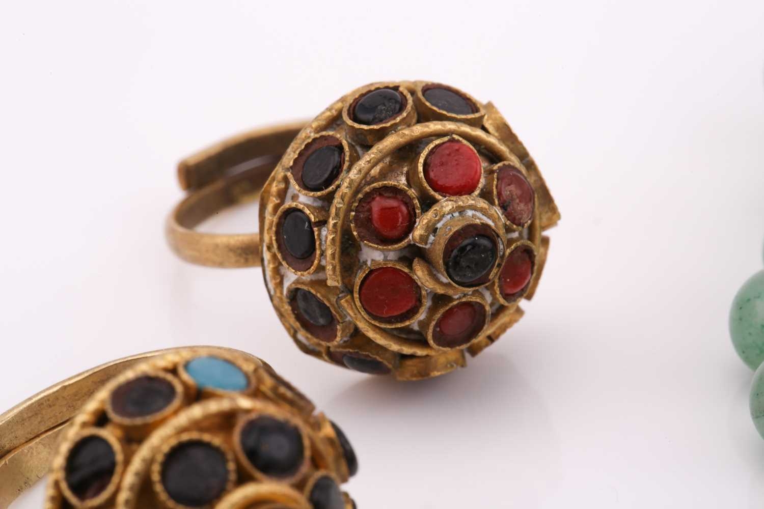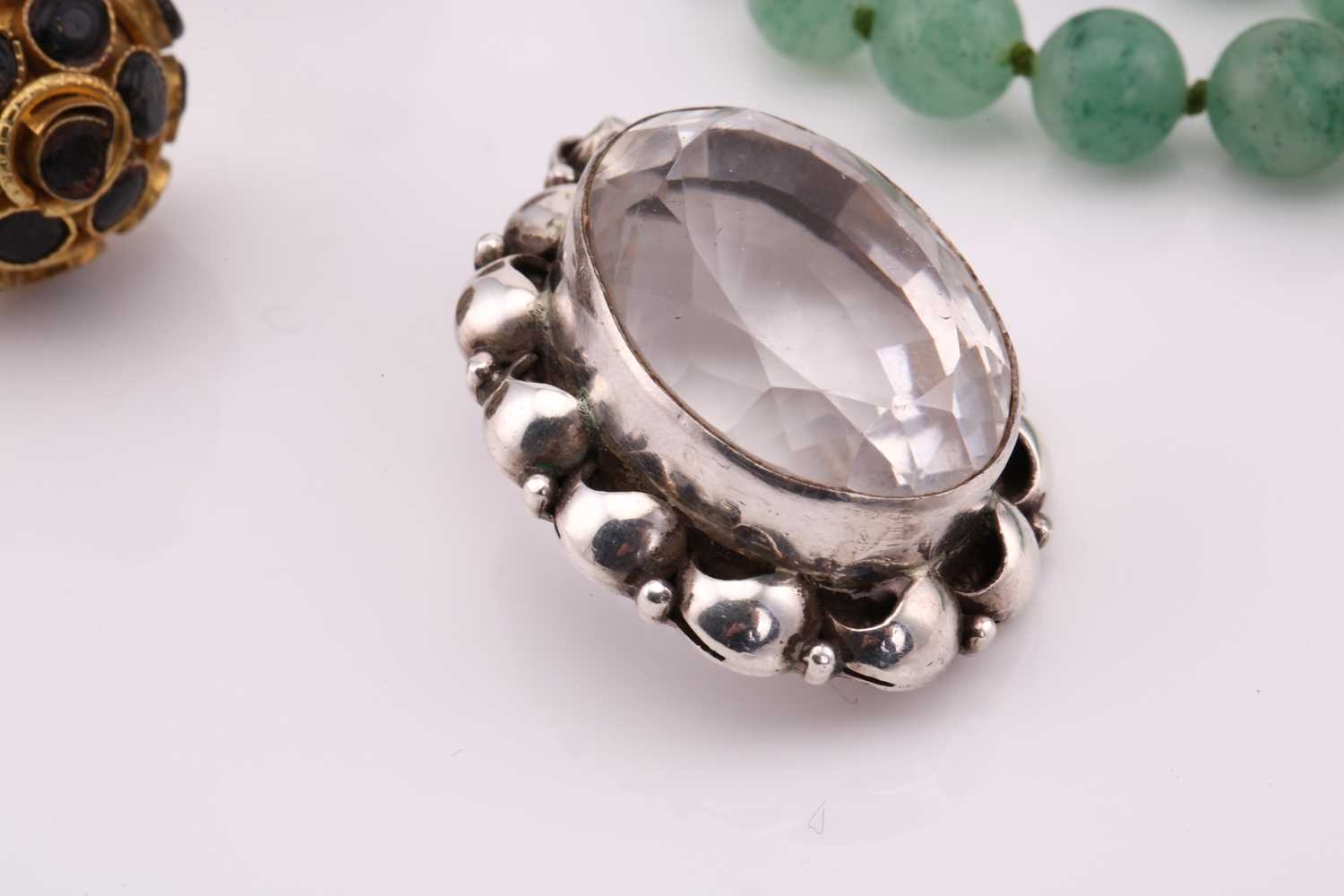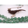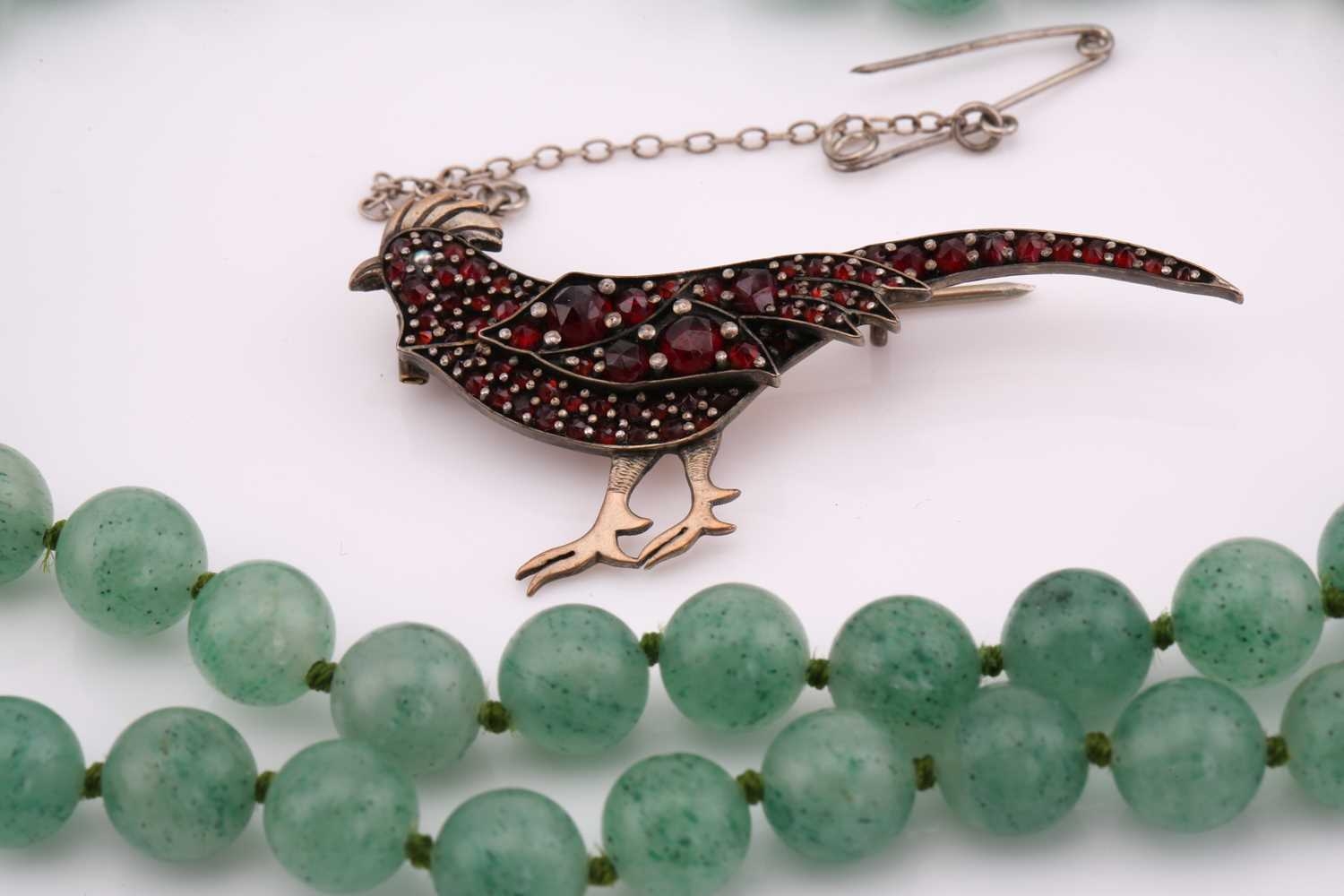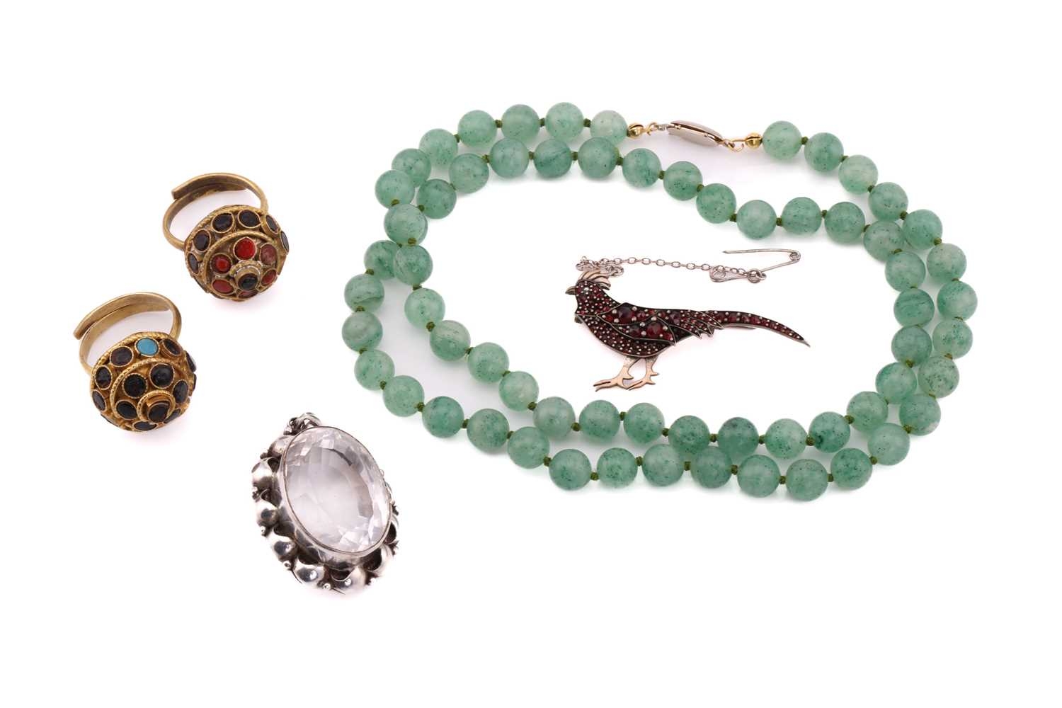 A lot consisting of miscellaneous jewellery items, two domed Turkman style scarf rings in yellow metal with adjustable bands; an Aventurine quartz beaded necklace with base metal clasp, approximately measuring 60 cm in length; a pheasant brooch bead-set with rose-cut red stones, with pin stem and catch also with a safety chain; a quartz pendant where an oval faceted rock crystal collet set in a sterling silver scalloped surround, measuring 4.8 x 2.9 cm in dimensions. Total weight of items 80.4 grams.