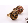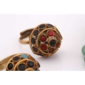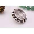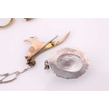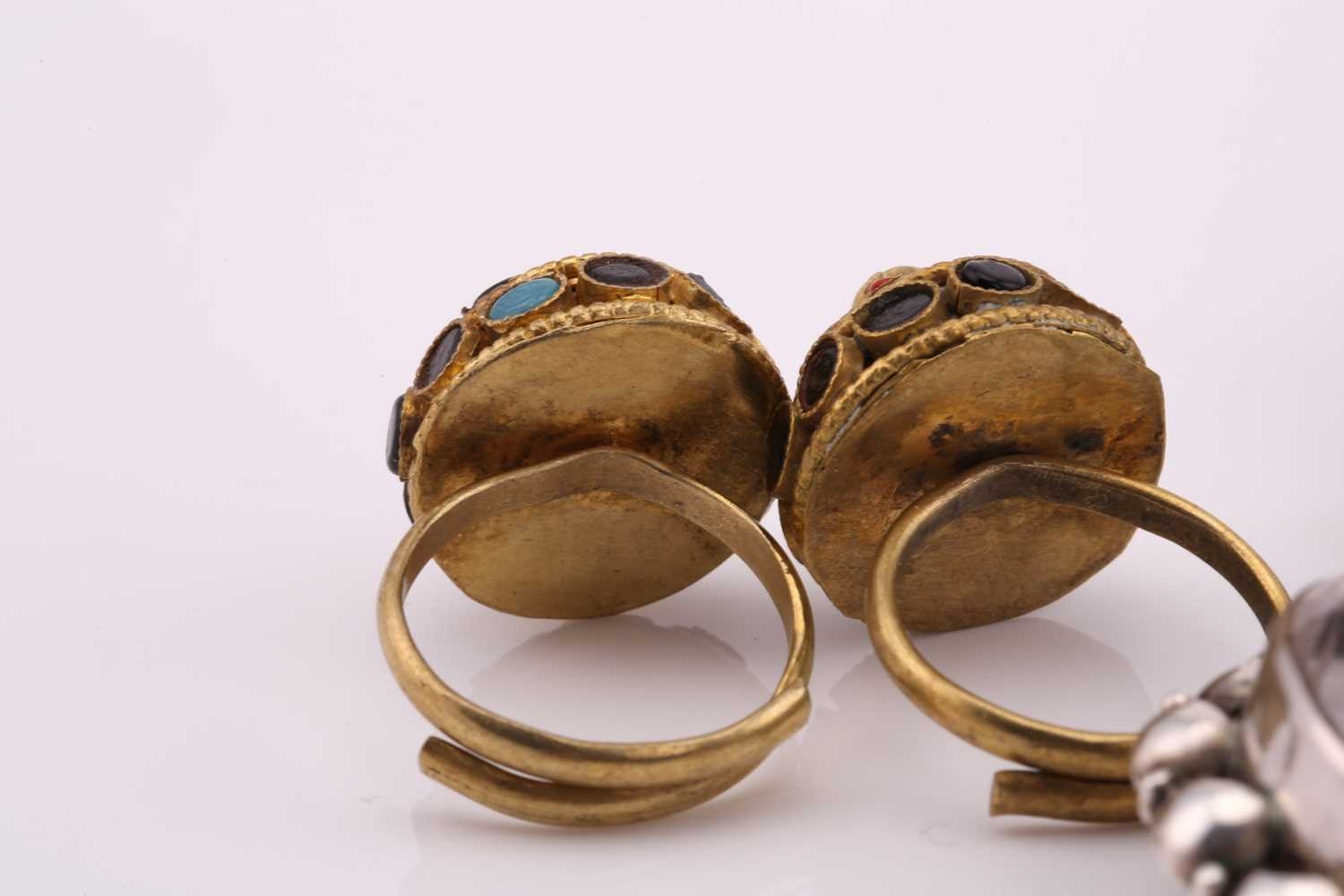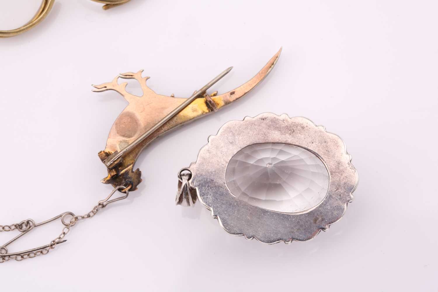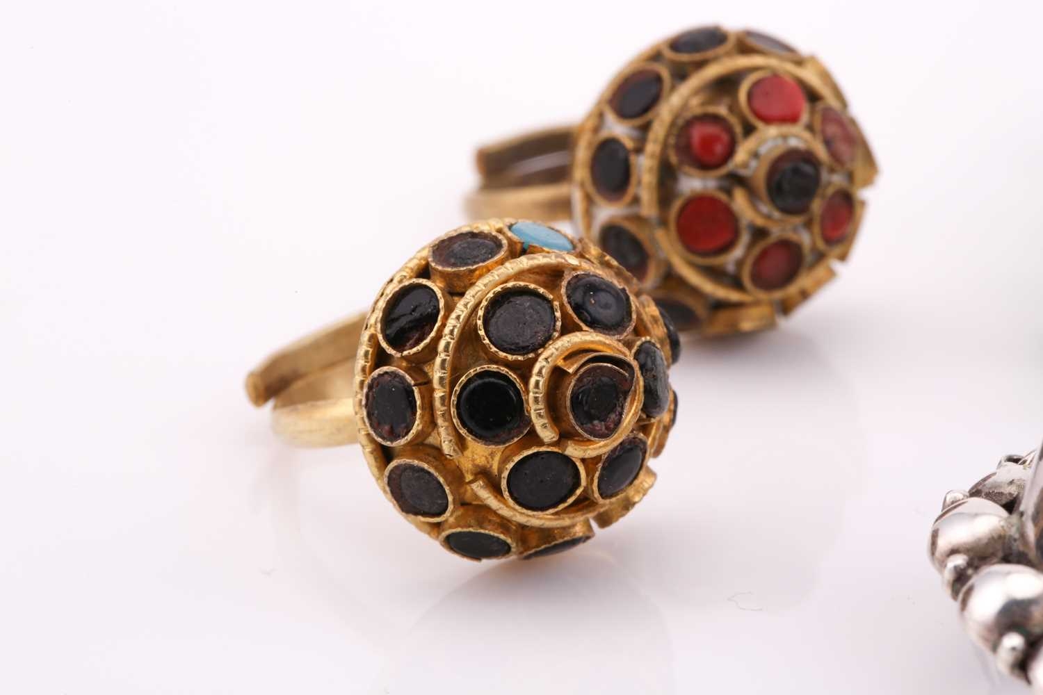 A lot consisting of miscellaneous jewellery items, two domed Turkman style scarf rings in yellow metal with adjustable bands; an Aventurine quartz beaded necklace with base metal clasp, approximately measuring 60 cm in length; a pheasant brooch bead-set with rose-cut red stones, with pin stem and catch also with a safety chain; a quartz pendant where an oval faceted rock crystal collet set in a sterling silver scalloped surround, measuring 4.8 x 2.9 cm in dimensions. Total weight of items 80.4 grams.