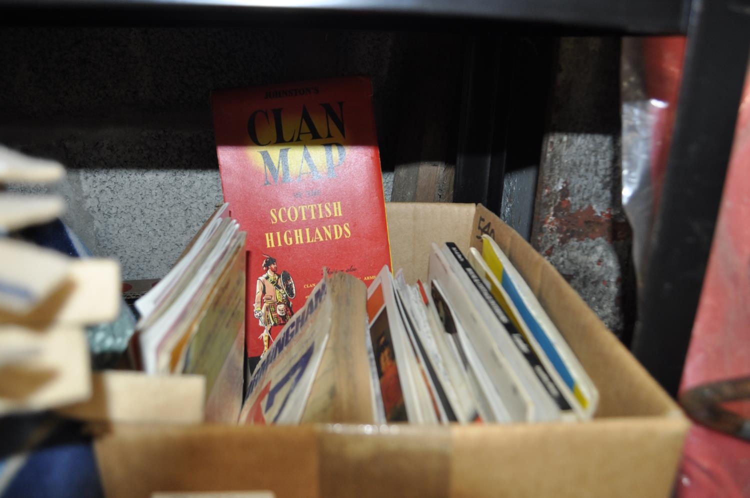 BOX OF BOOKS, MAPS ETC AND A BOX OF 9 X NEW MULTI COLOURED GLASS TUMBLERS