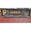 A large vintage Titanic themed wooden display case including hand carved wooden model of the ship, photographs of the interior and historical facts. A very interesting display piece, measuring H33cm x W106cm x D6cm