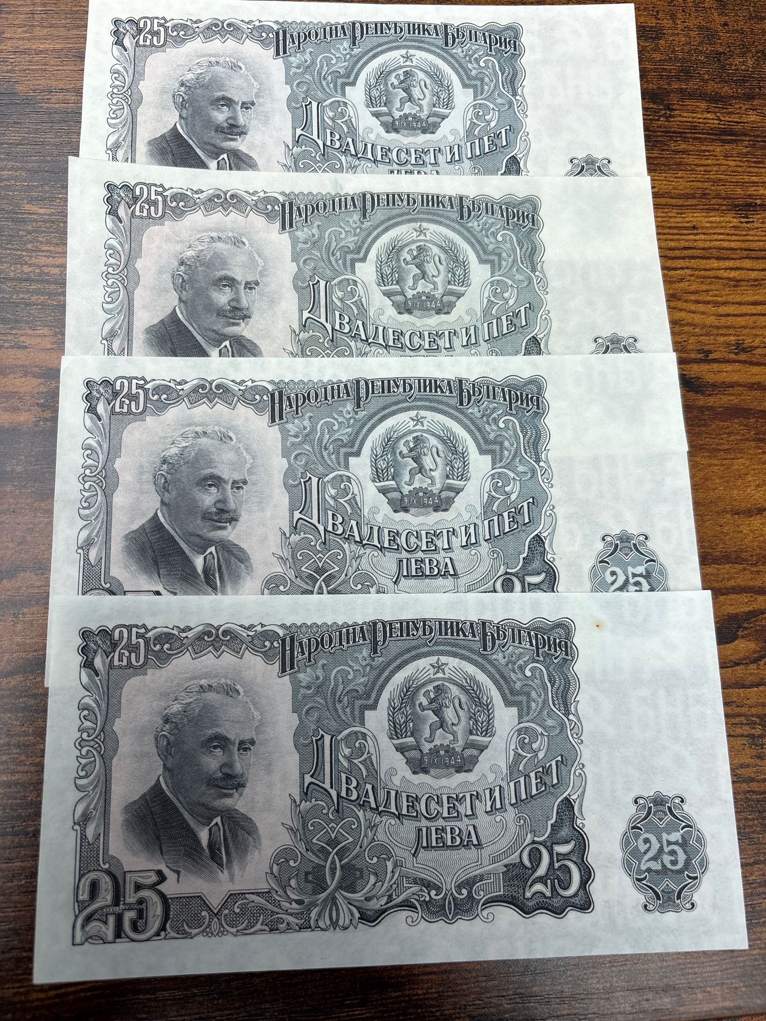 Bulgaria 1951 Banknotes – 25 Leva (x4) – Crisp UNC – Communist Era / Cold War Issue Group of four 25 Leva banknotes issued in 1951 during the People’s Republic of Bulgaria. Features classic socialist-era design with state emblem and portrait. Crisp, clean examples with excellent paper quality and strong detail. A striking Cold War set ideal for collectors.