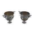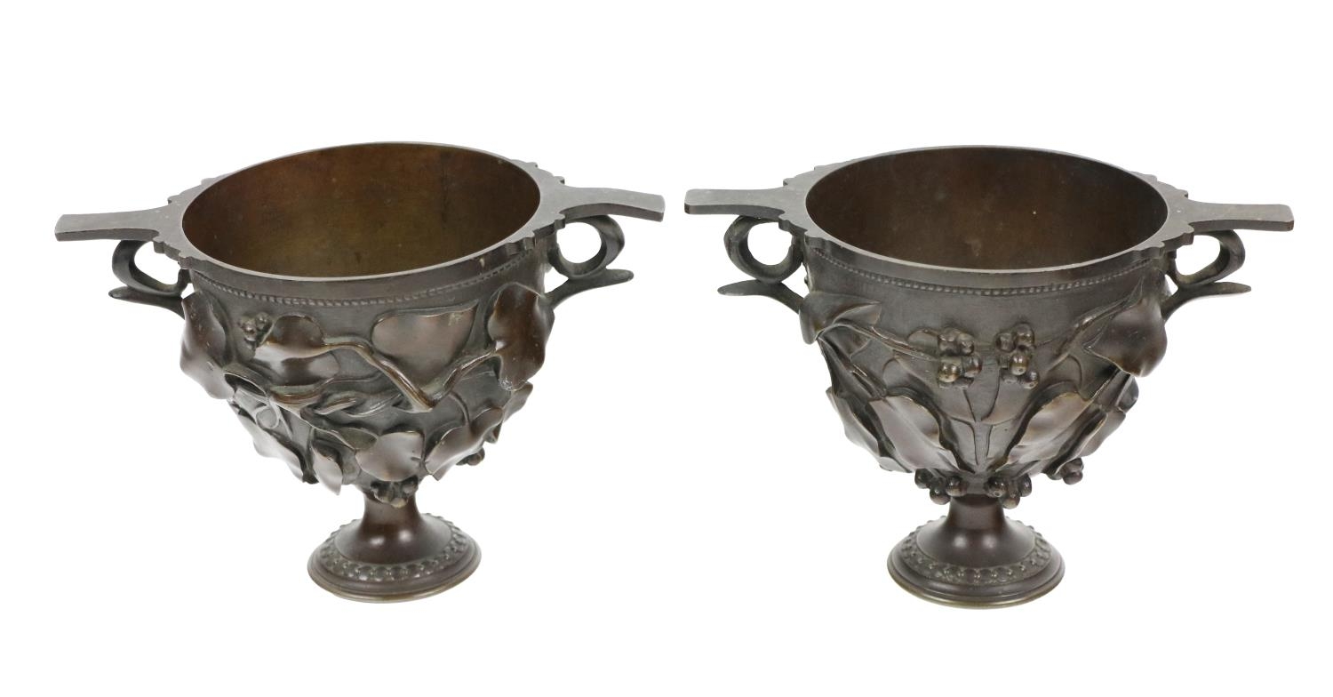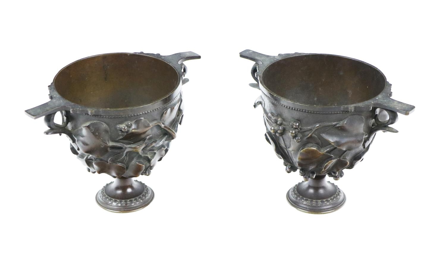 A pair of attractive bronze Roman inspired twin handled cup "Skyphos" modelled with ivy leaves and pods, each approx. 12cms (5") high. (2)