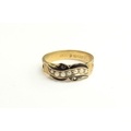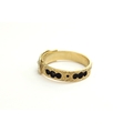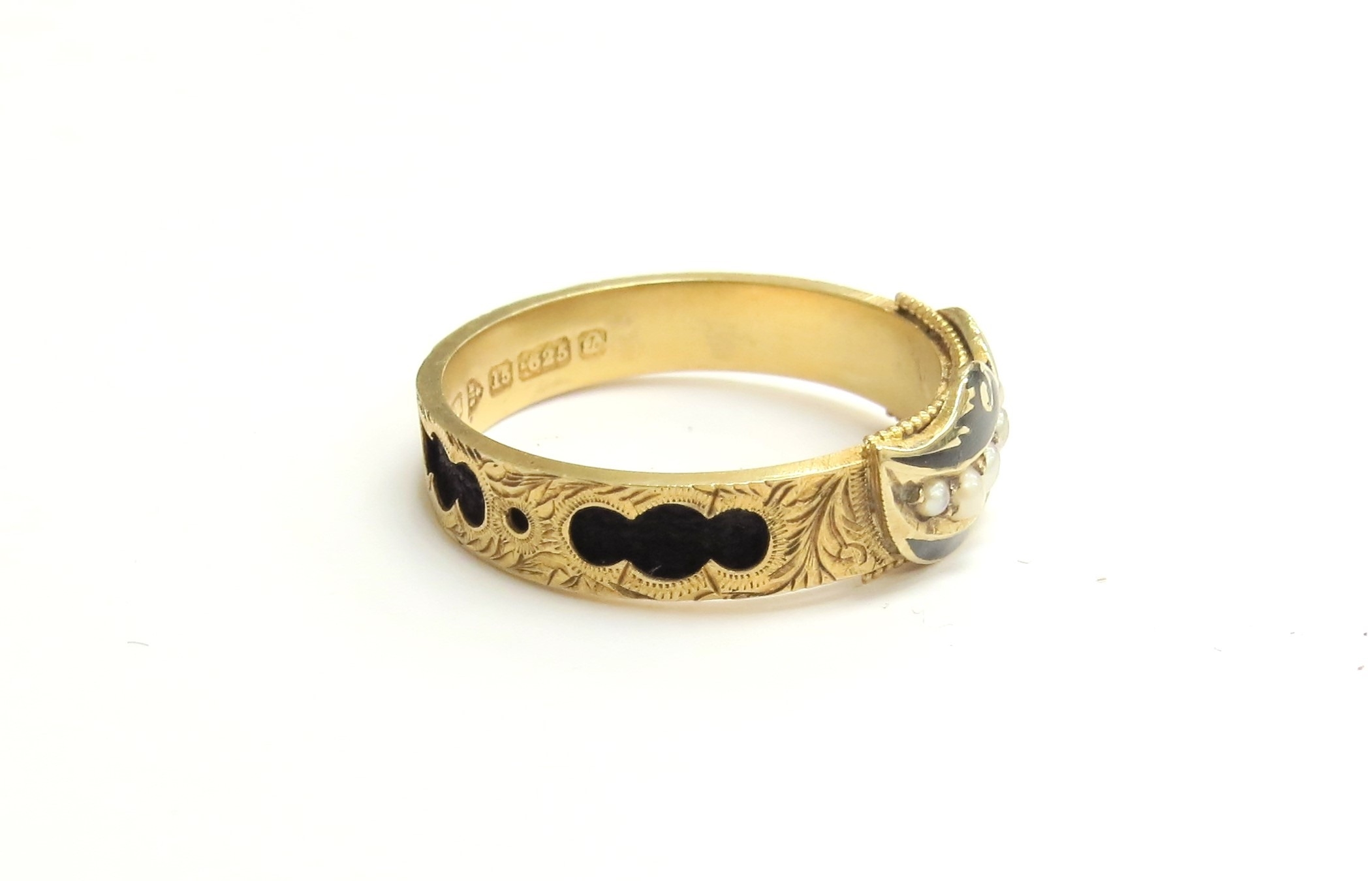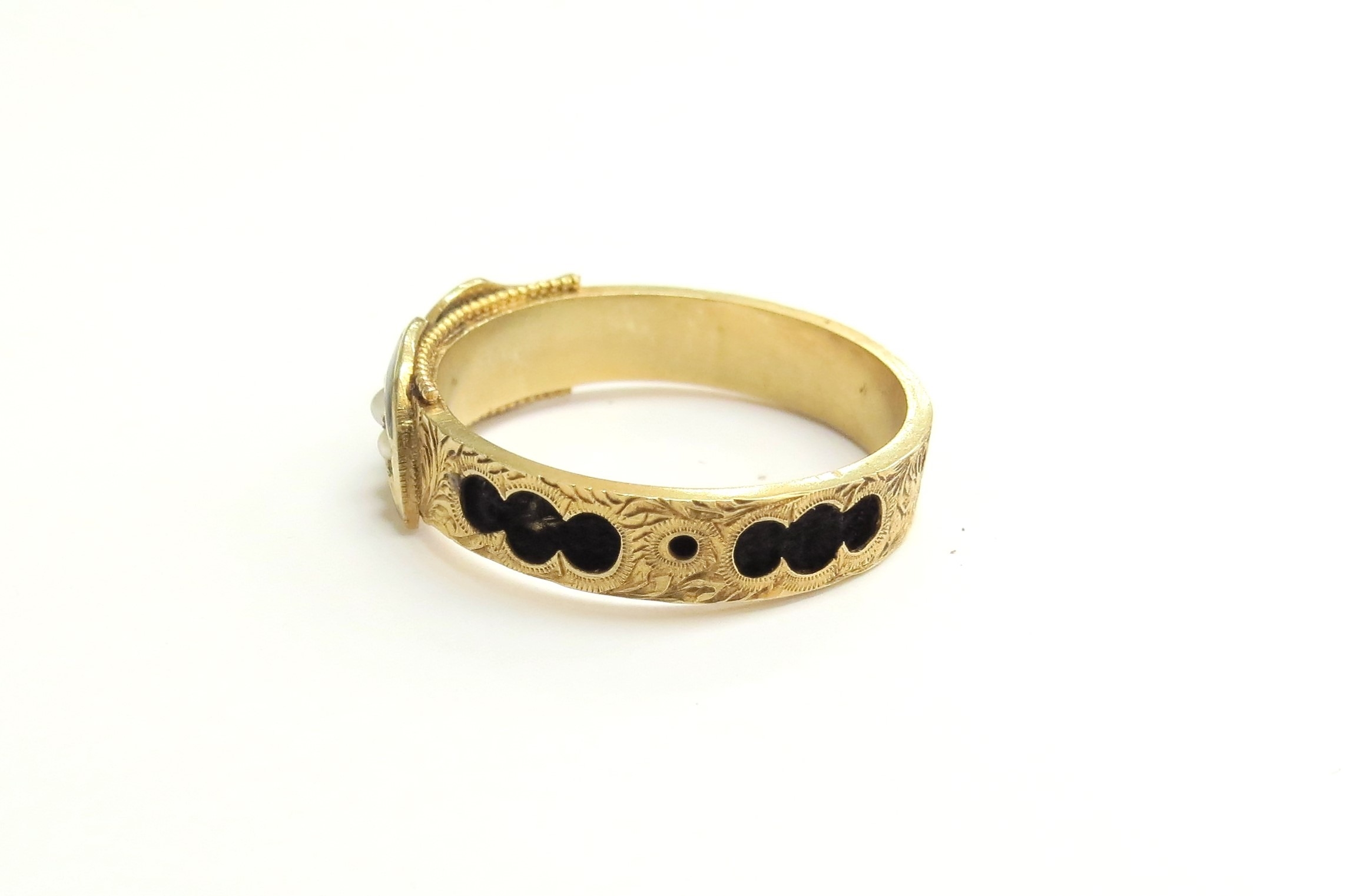 A 15ct gold memorial ring with hair threaded through entire shank, seed pearl and black enamel to front, Chester 1904. Size S/T, 2.8g