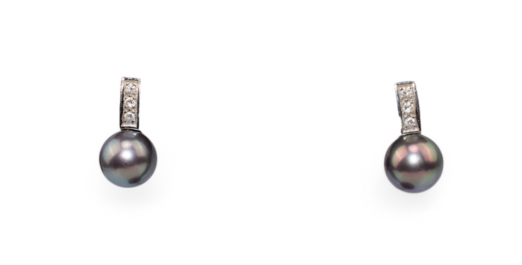A pair of Tahitian black cultured pearl and diamond earrings. Each set with a Tahitian pearl measuring 8.6mm. With three stone diamond tops