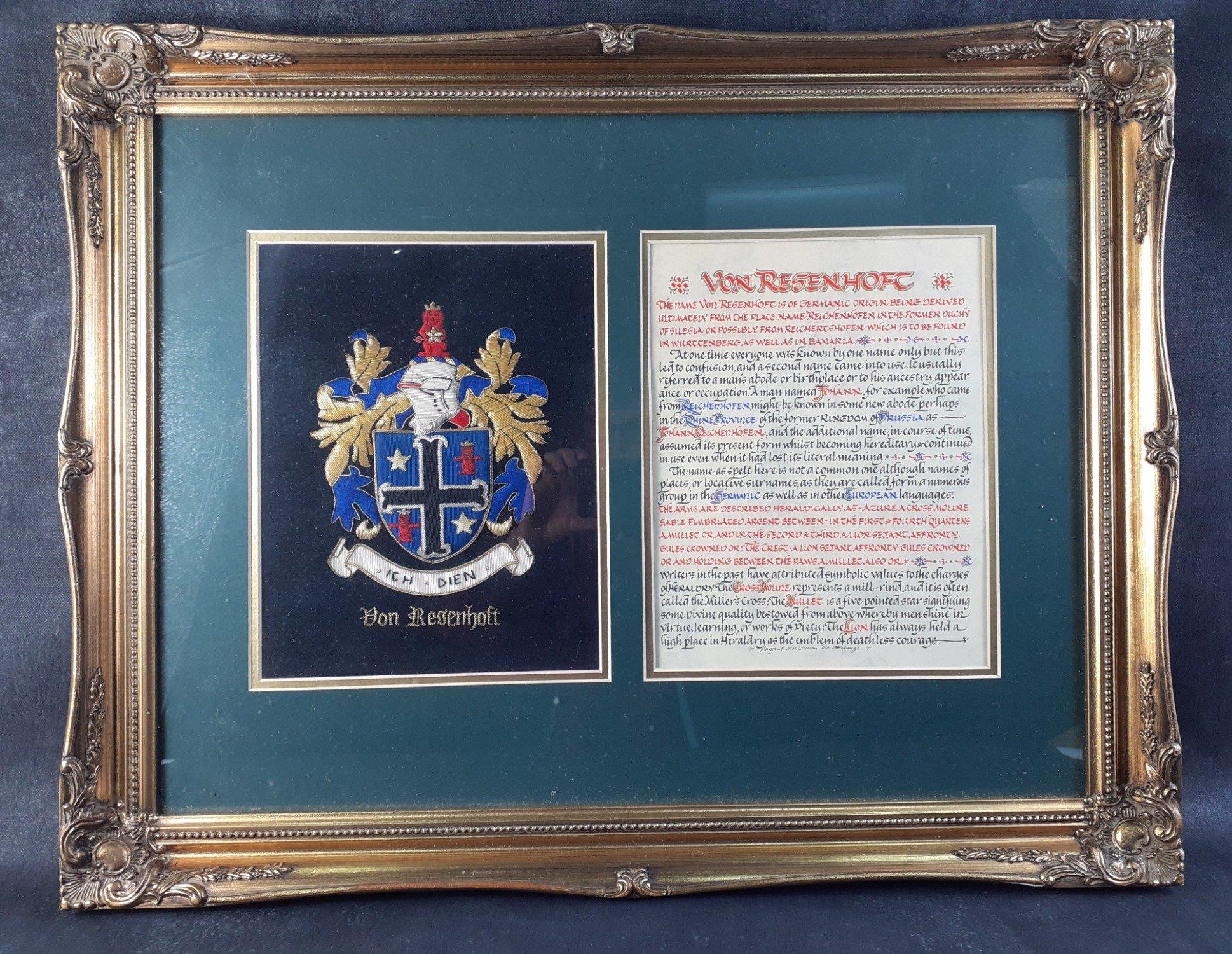 A large framed heraldic family crest, for the von RESENHOFT family, frame size 69x54cm