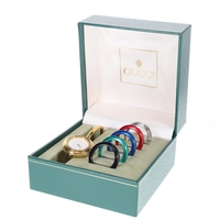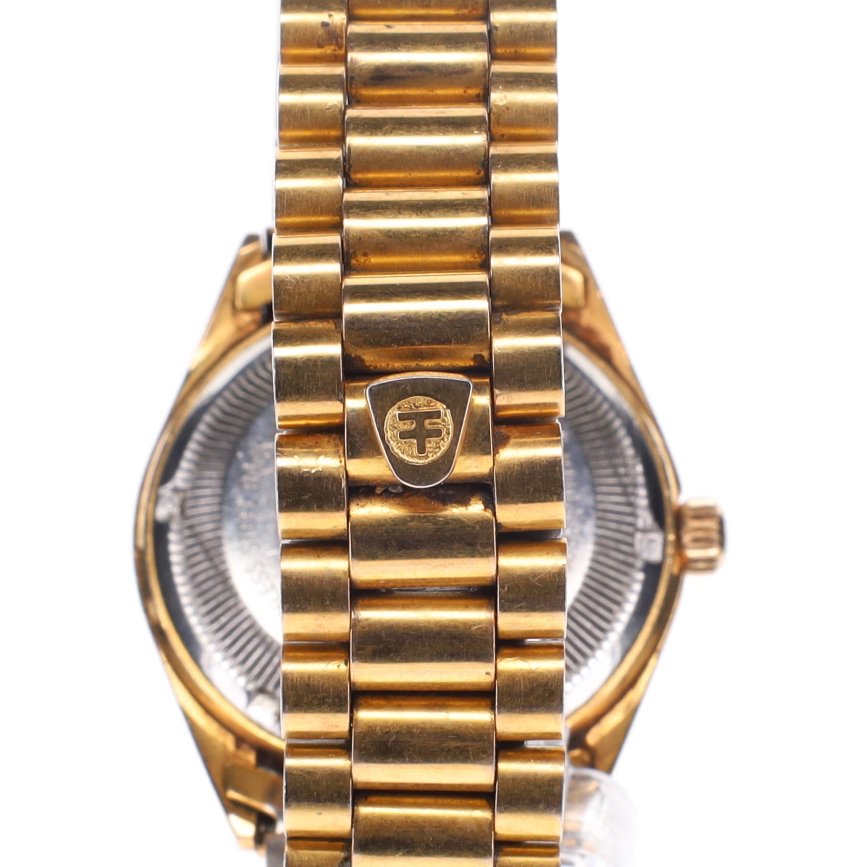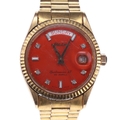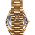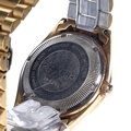 Case and bracelet made from gold tone stainless steel. Acrylic crystal. Orange dial with gold tone hands, silver & diamond set hour markers, magnified date window at 3 o'clock and day window at 12 o'clock.