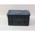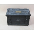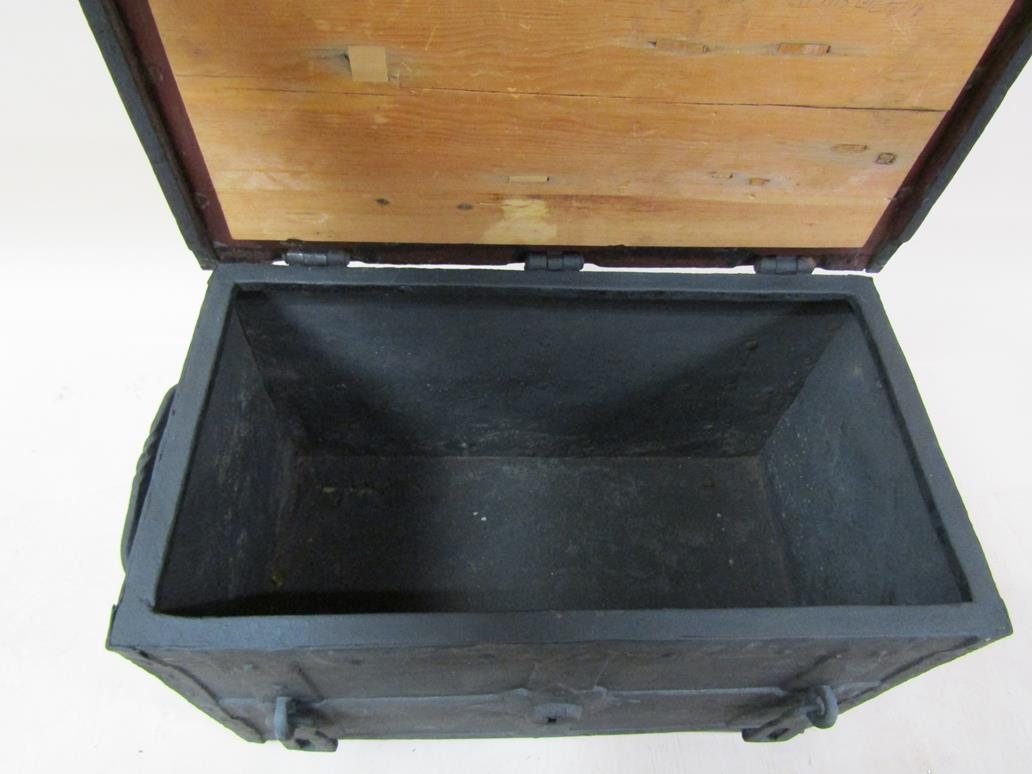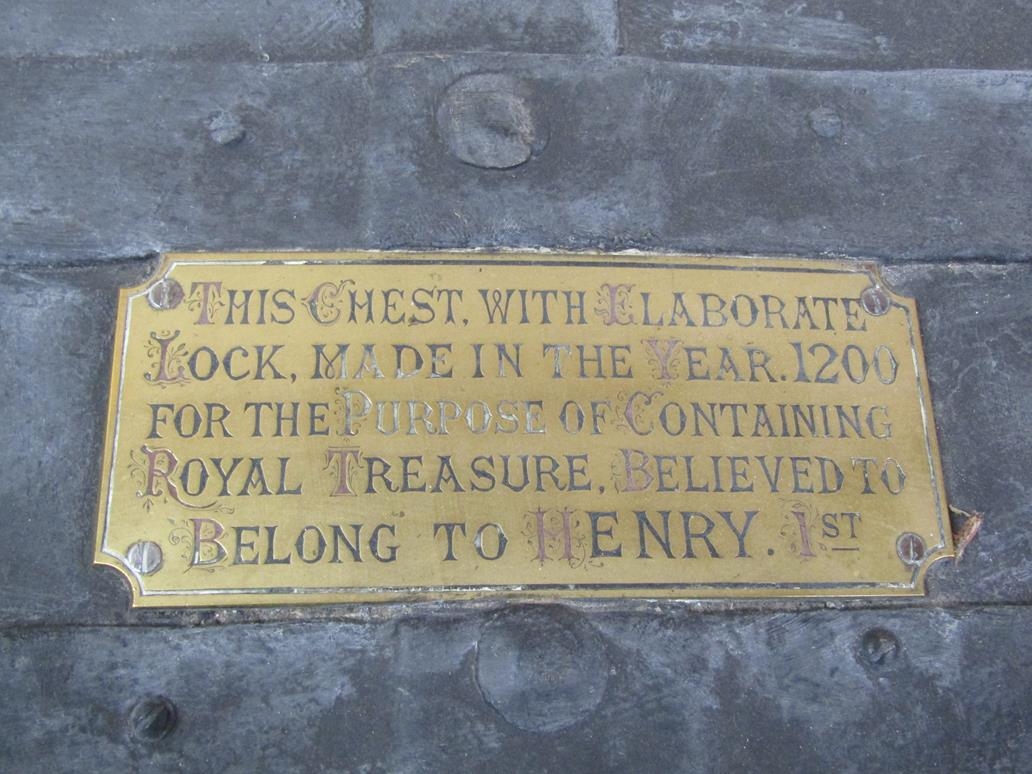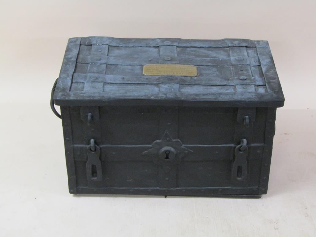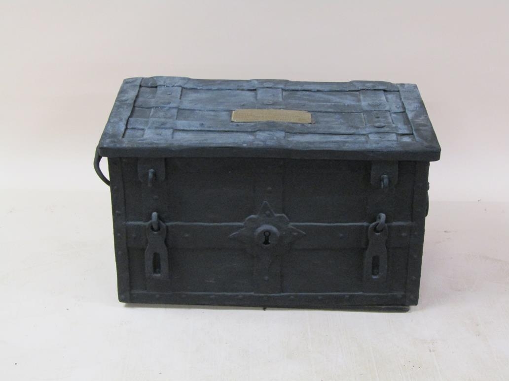 A metal chest, being a replica of a chest made in the year 1200 for the purpose of containing Royal treasure believed to belong to Henry I, 77cm w, 44cm h.