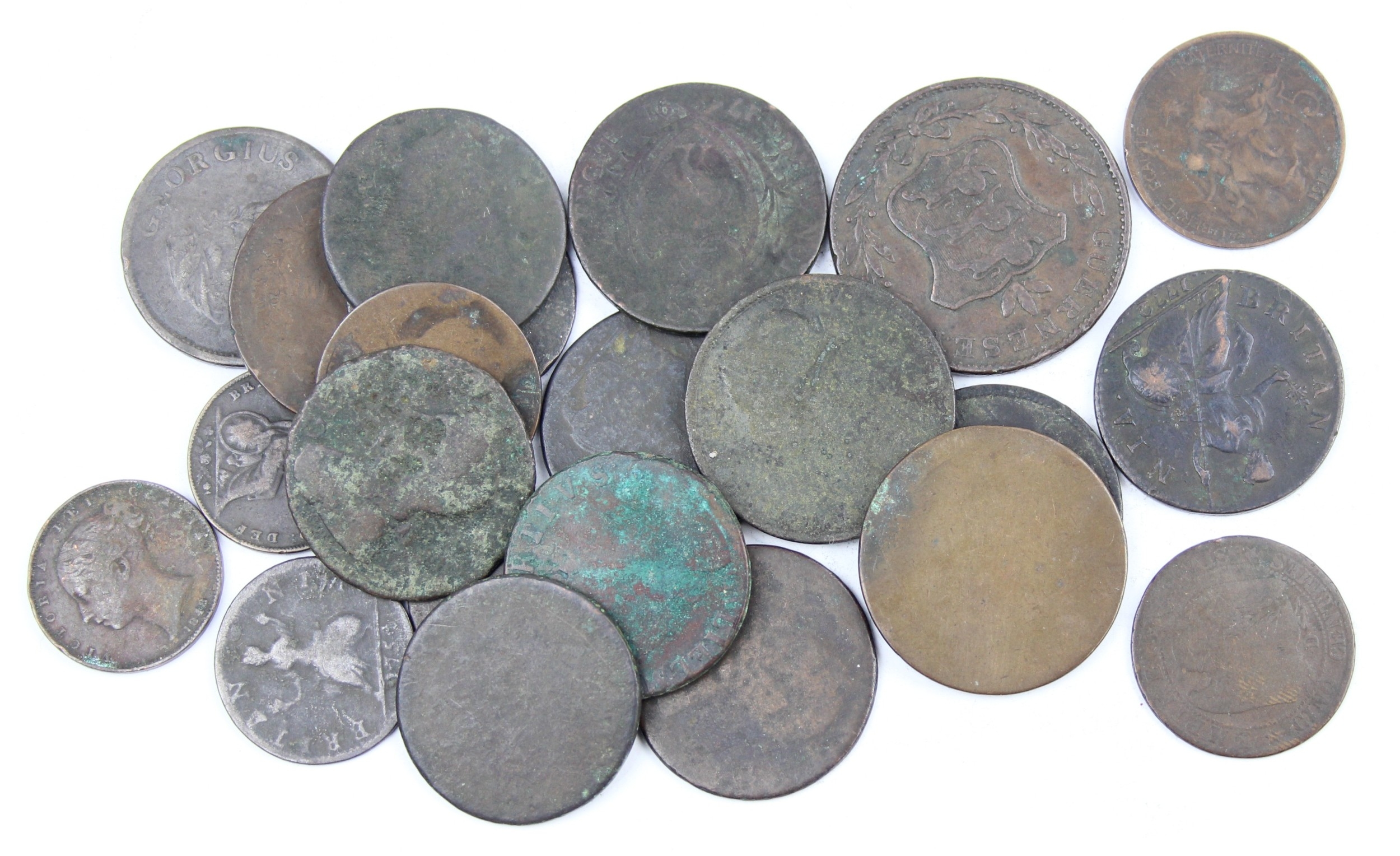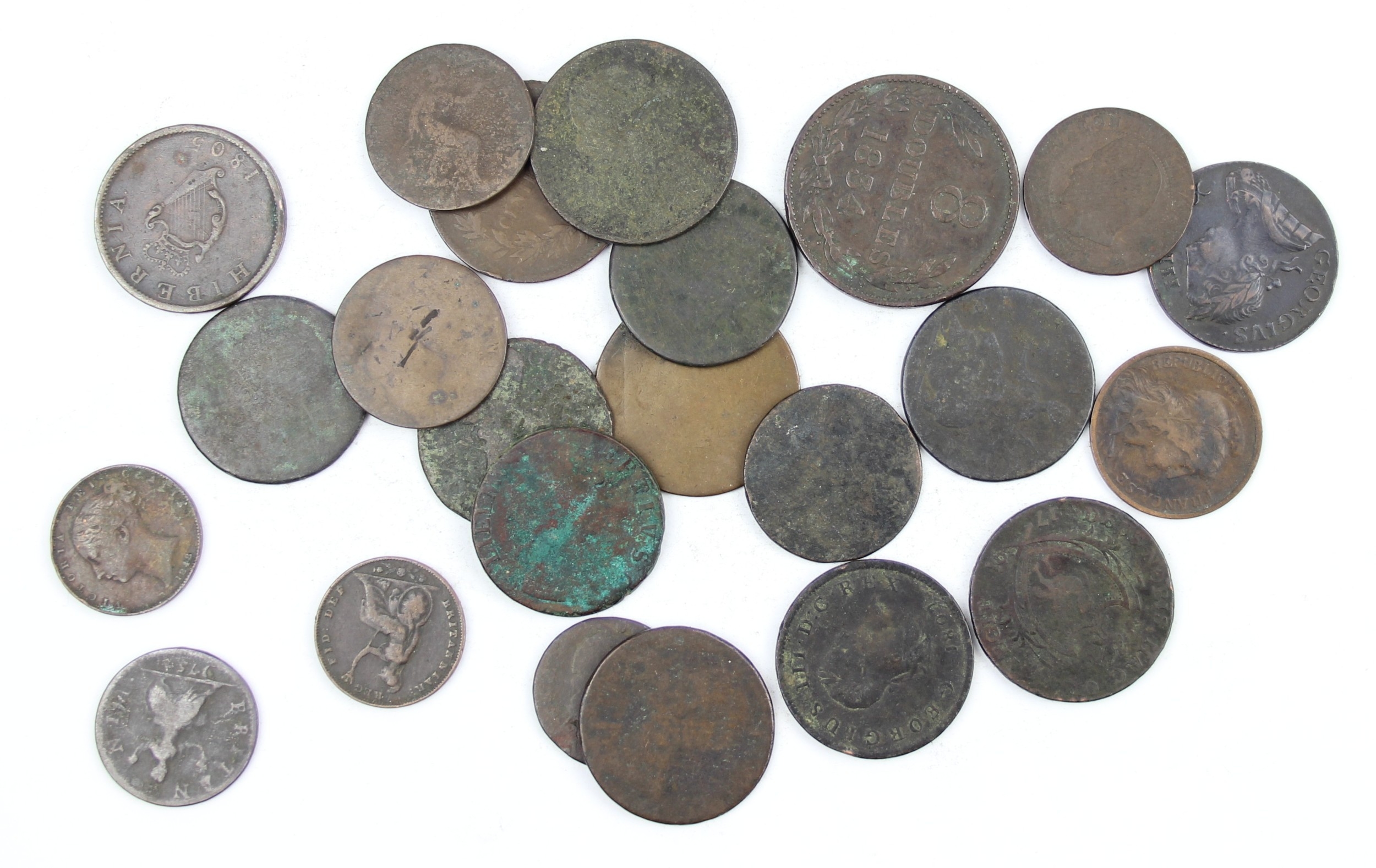 A qty of assorted antique coppers coins and tokens, mainly British to inc a high grade 1772 half penny