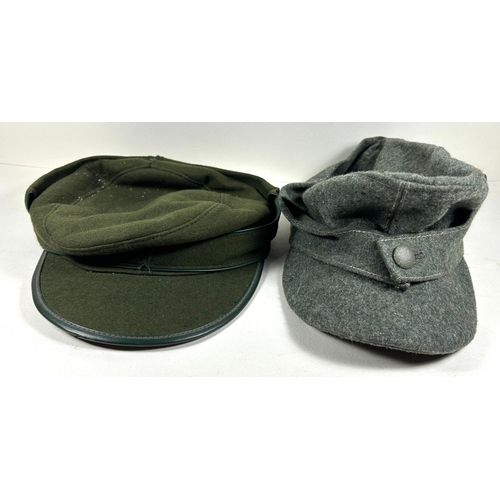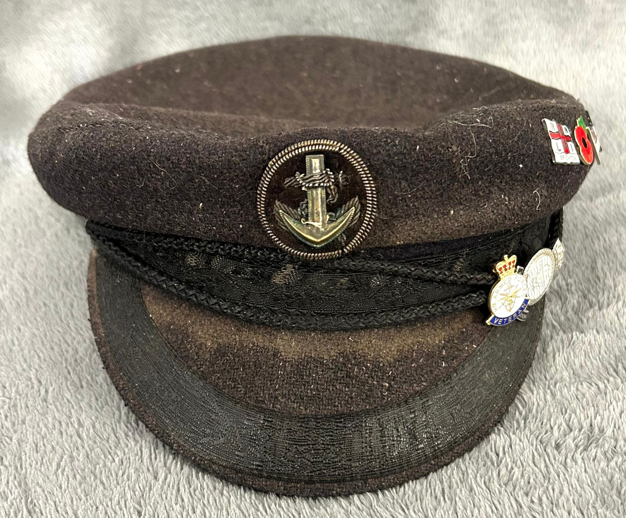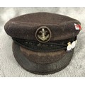 A Naval Nautical Training Corps officer's cap with bullion badge; and a blue wool yachting cap with several small Association badges, GC. (2)