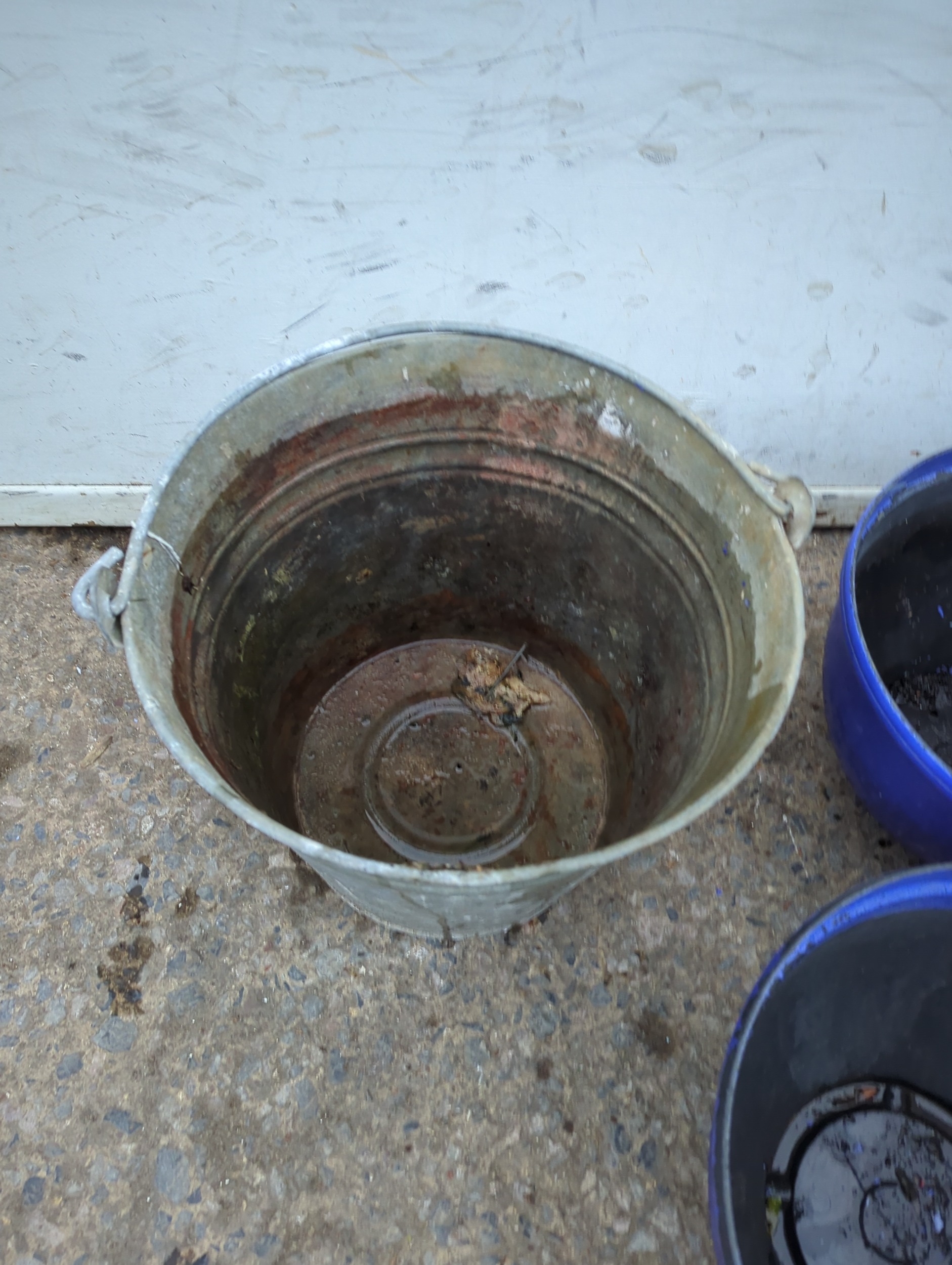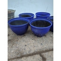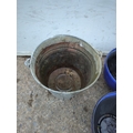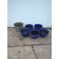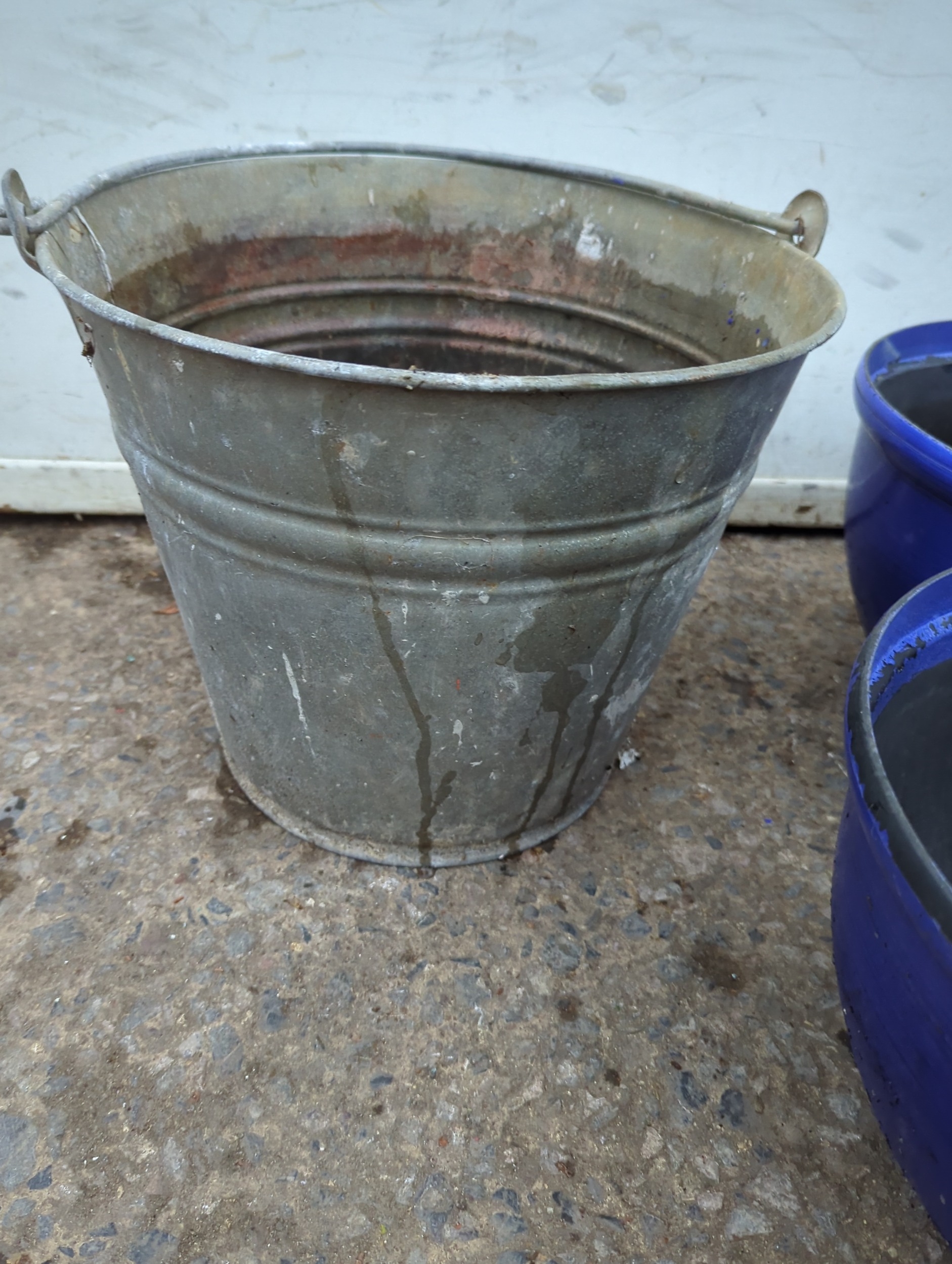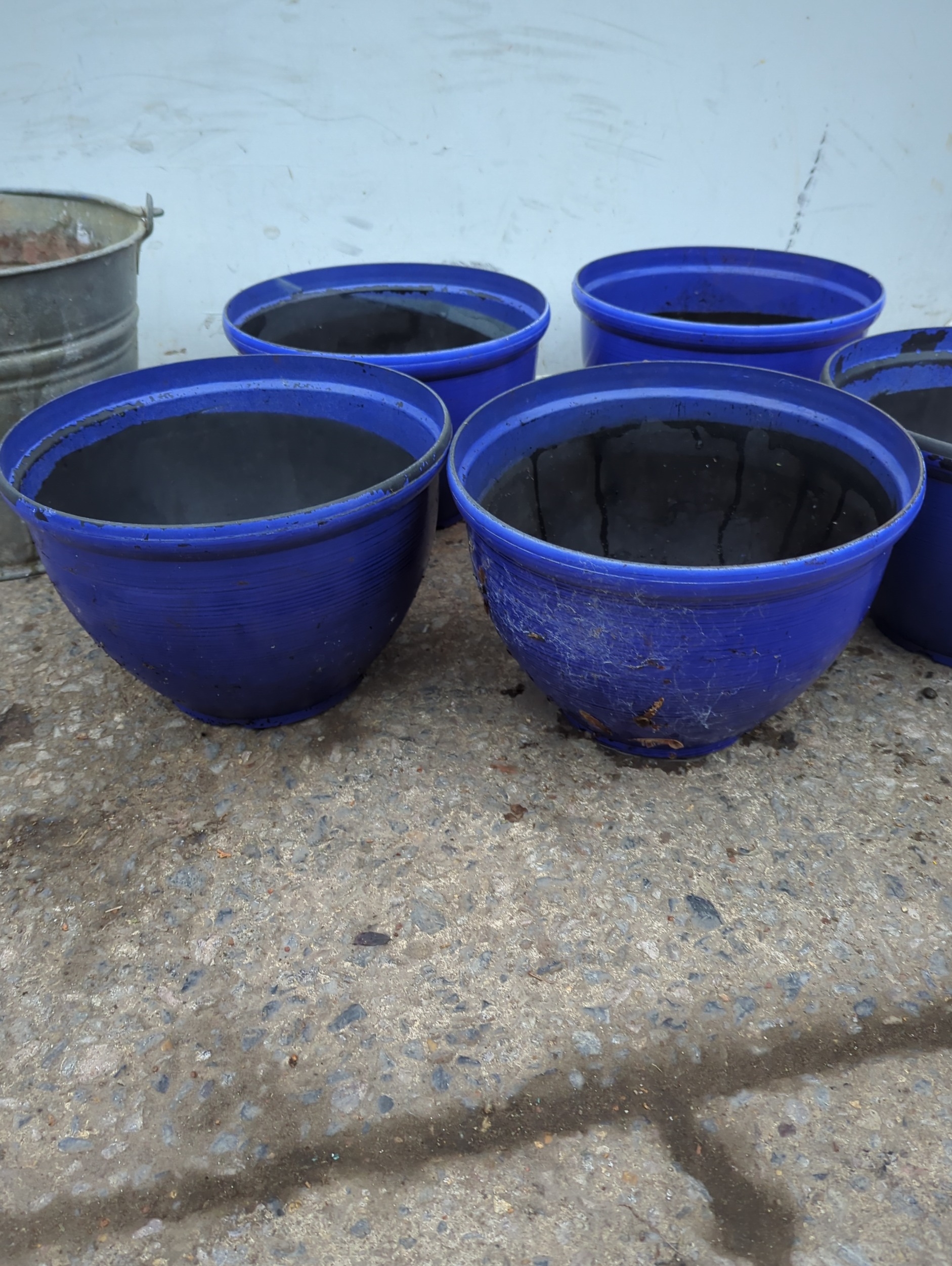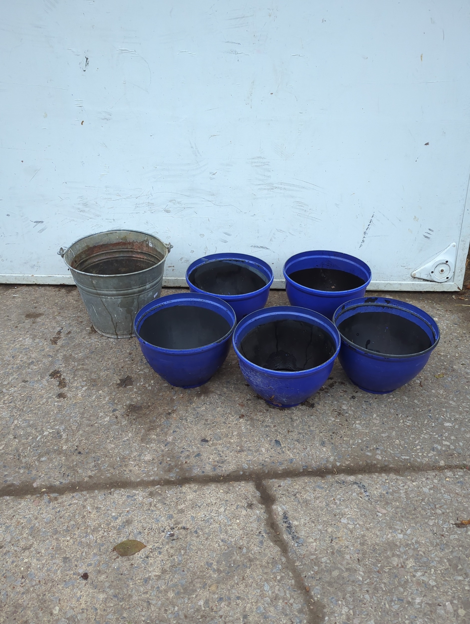 Lot of 5 Blue Plastic Plant Pots and Metal Bucket