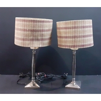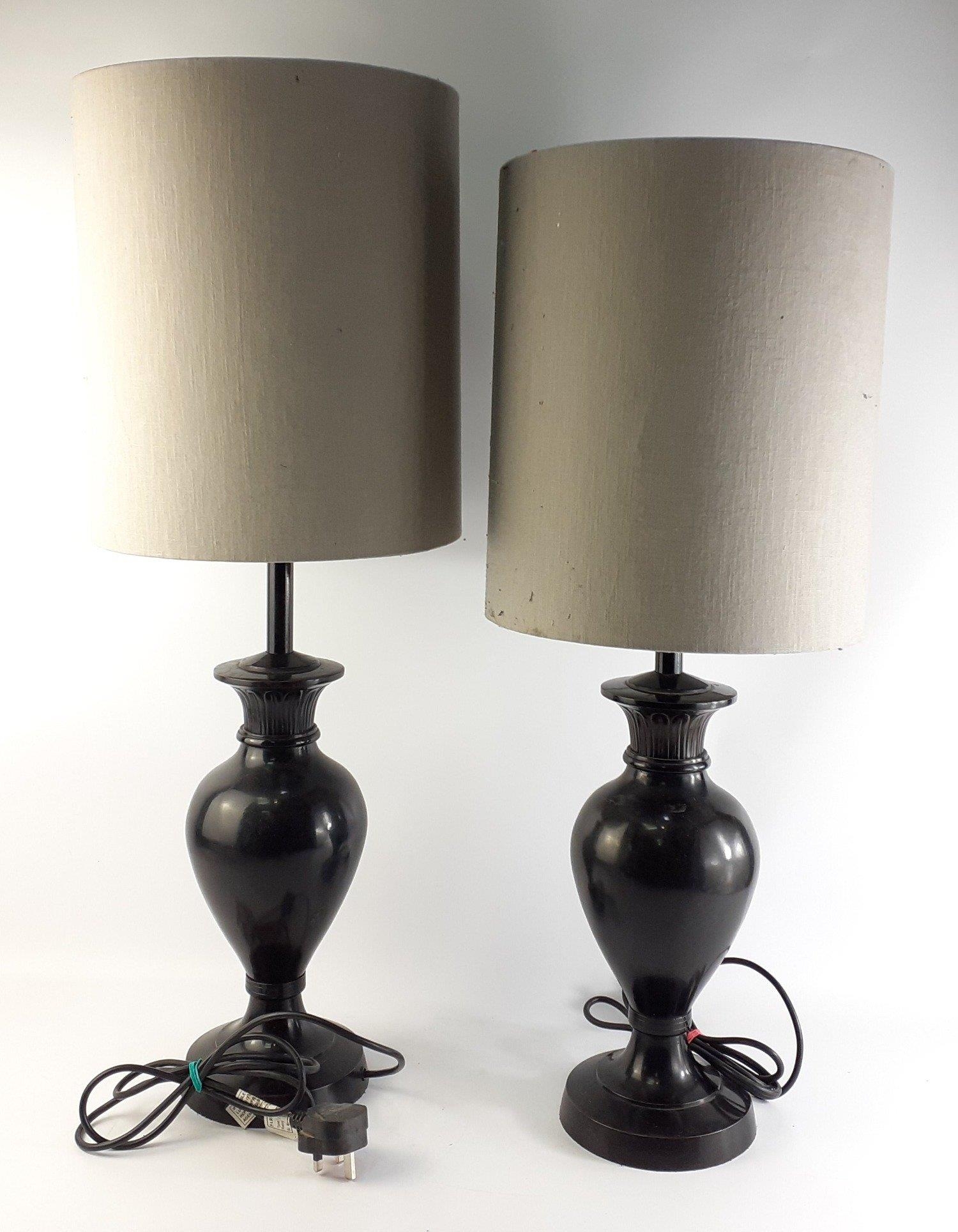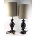 A pair of black STYLISH metal based stylish table lamps with shades. Lamps approx 50cm without shades. 75cm inc. shades.