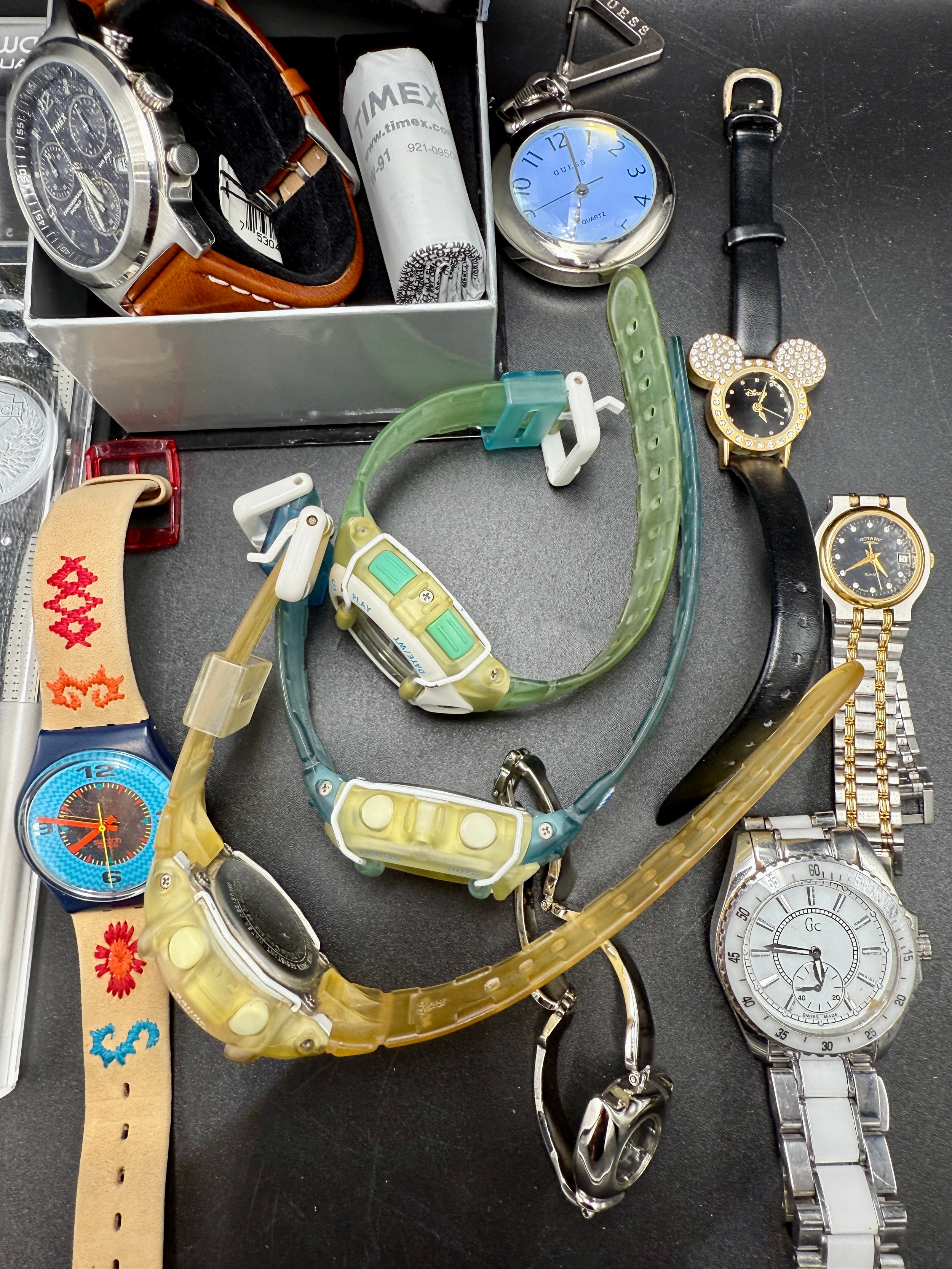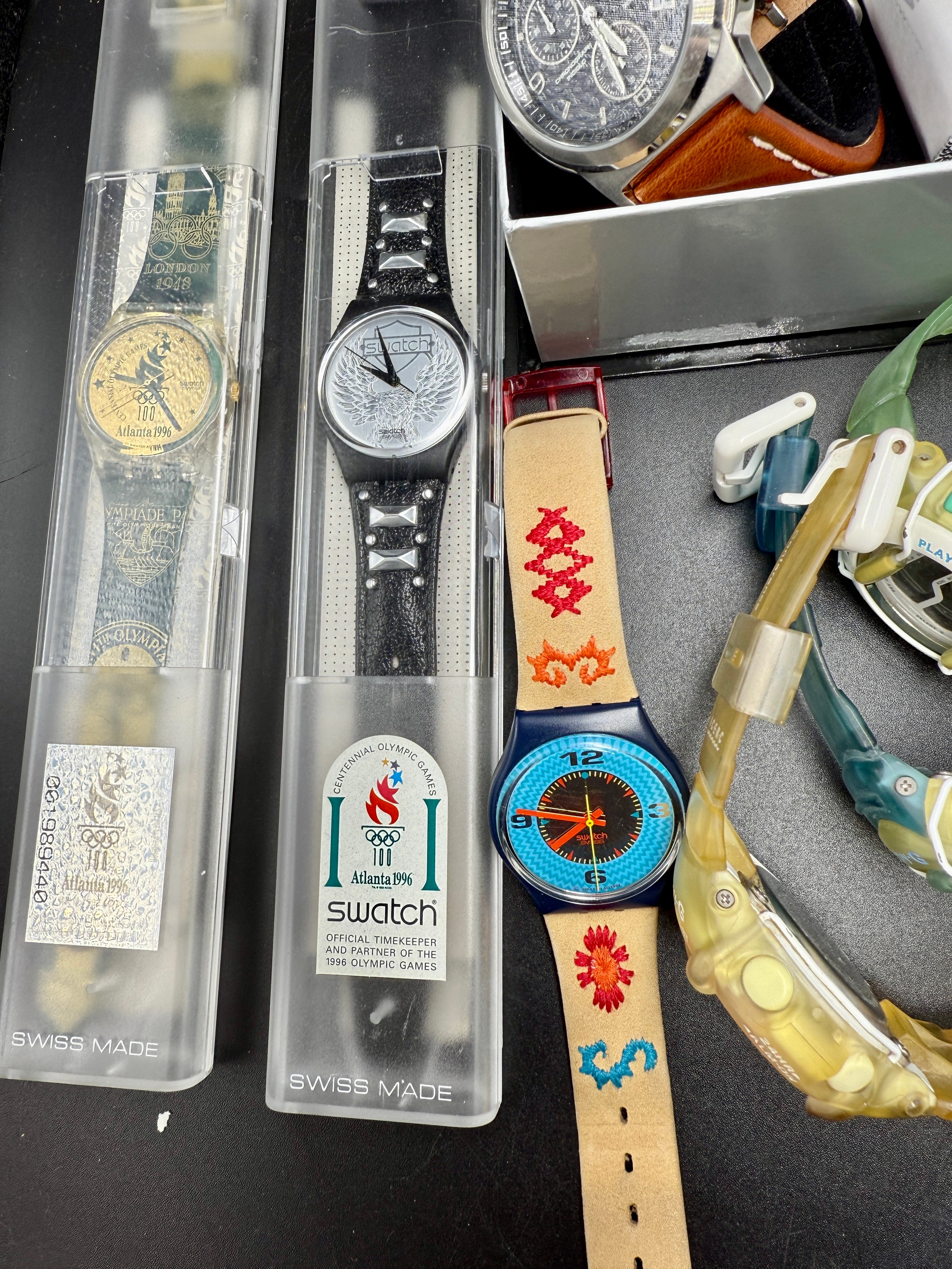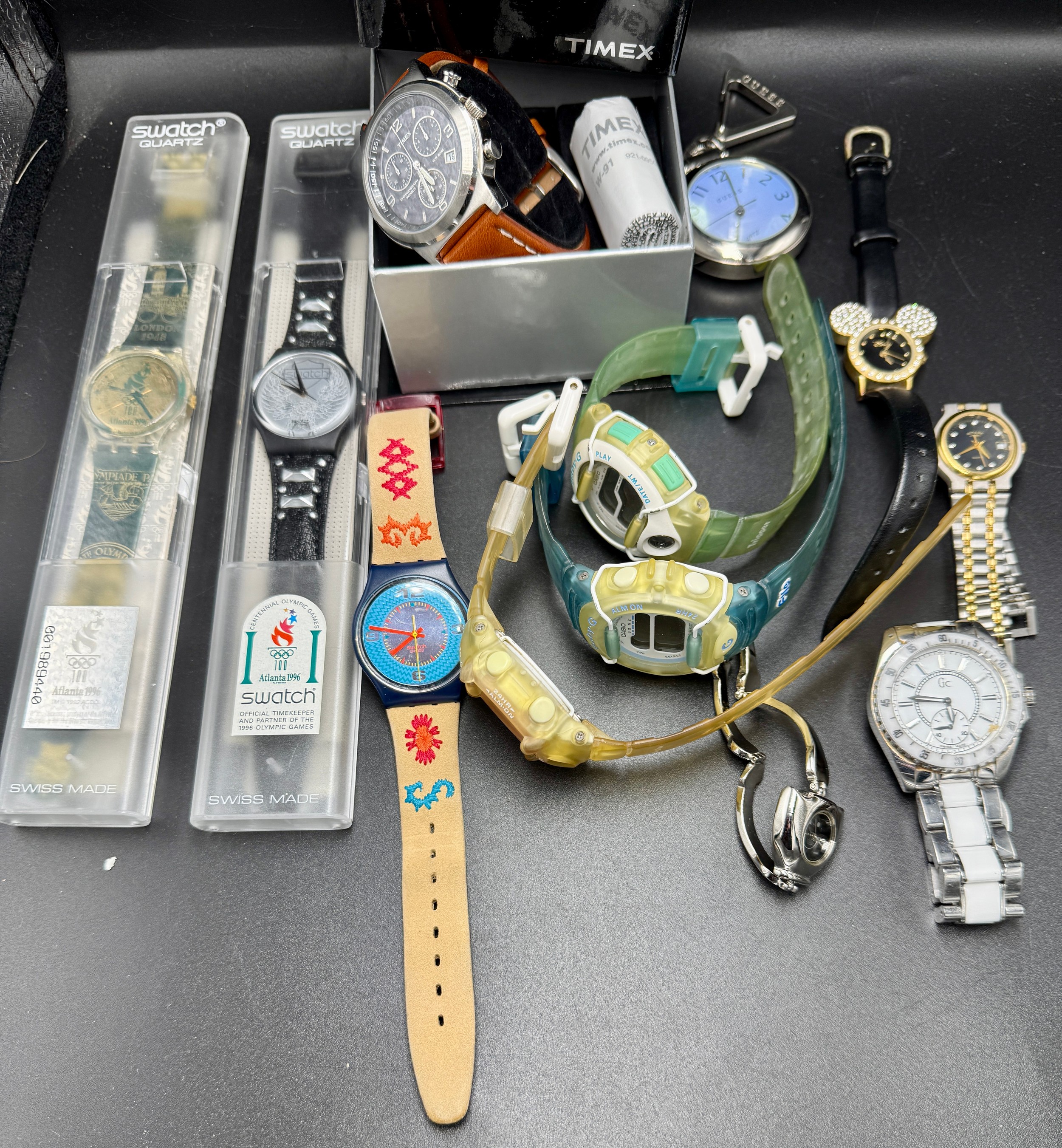 A collection of vintage wristwatches to include Swatch Atlanta 1996 Olympics, Swatch Hipster, 3 x Baby G watches, Timex, Guess, Rotary and Disney.