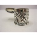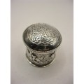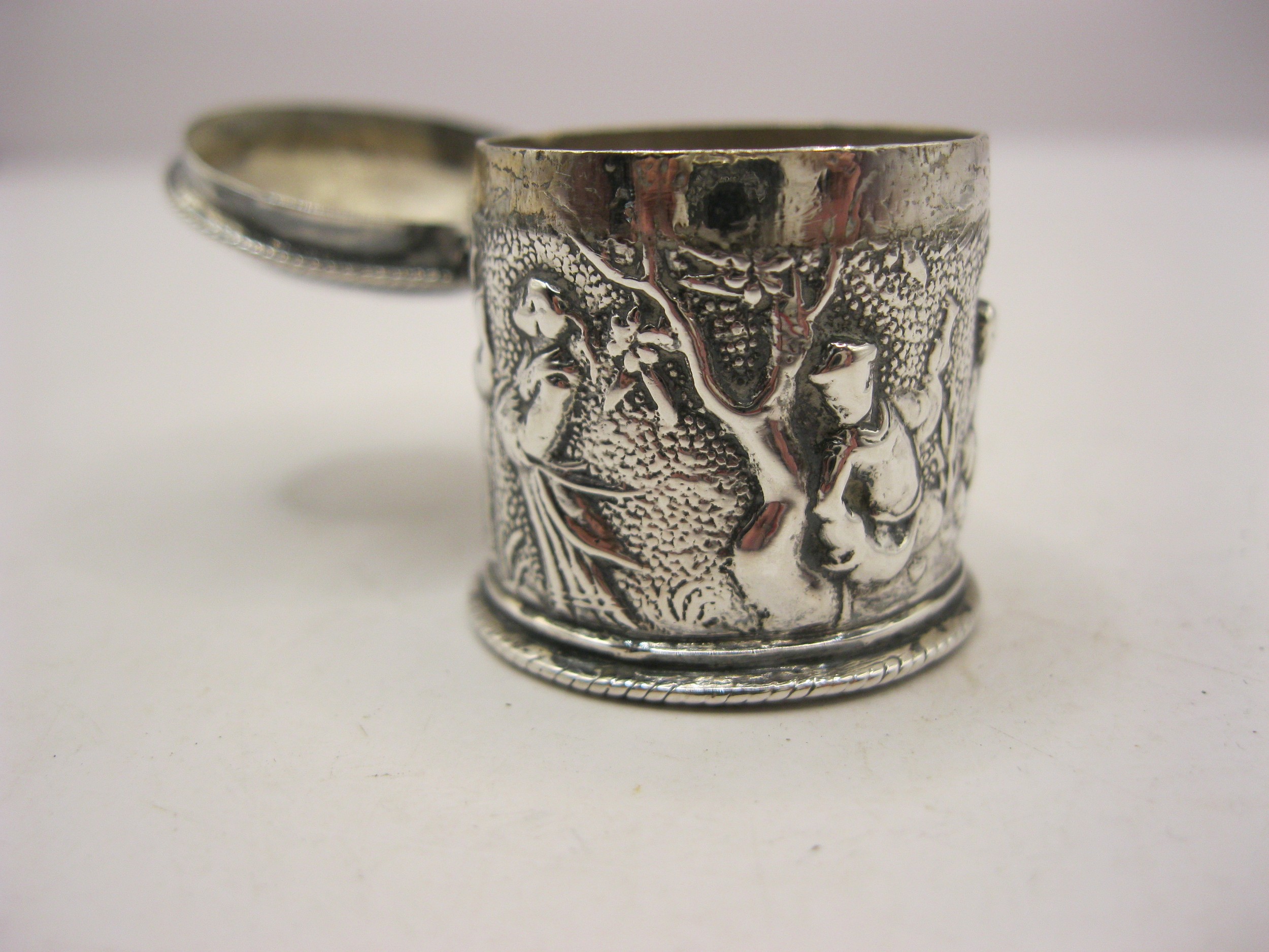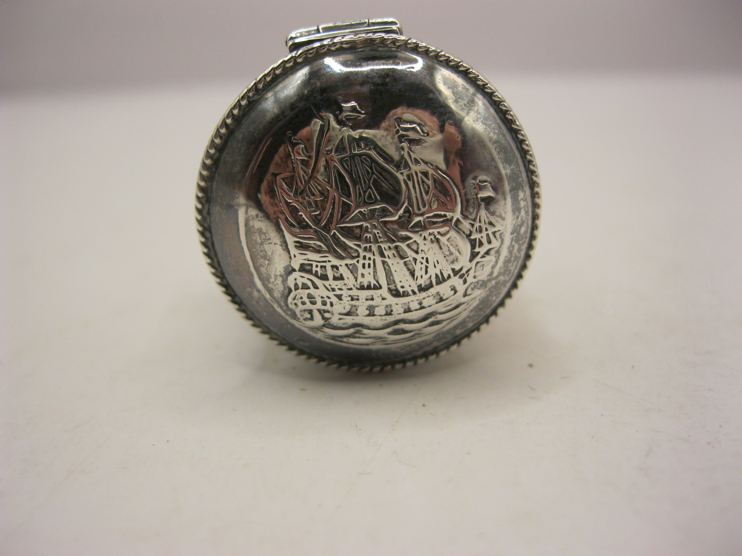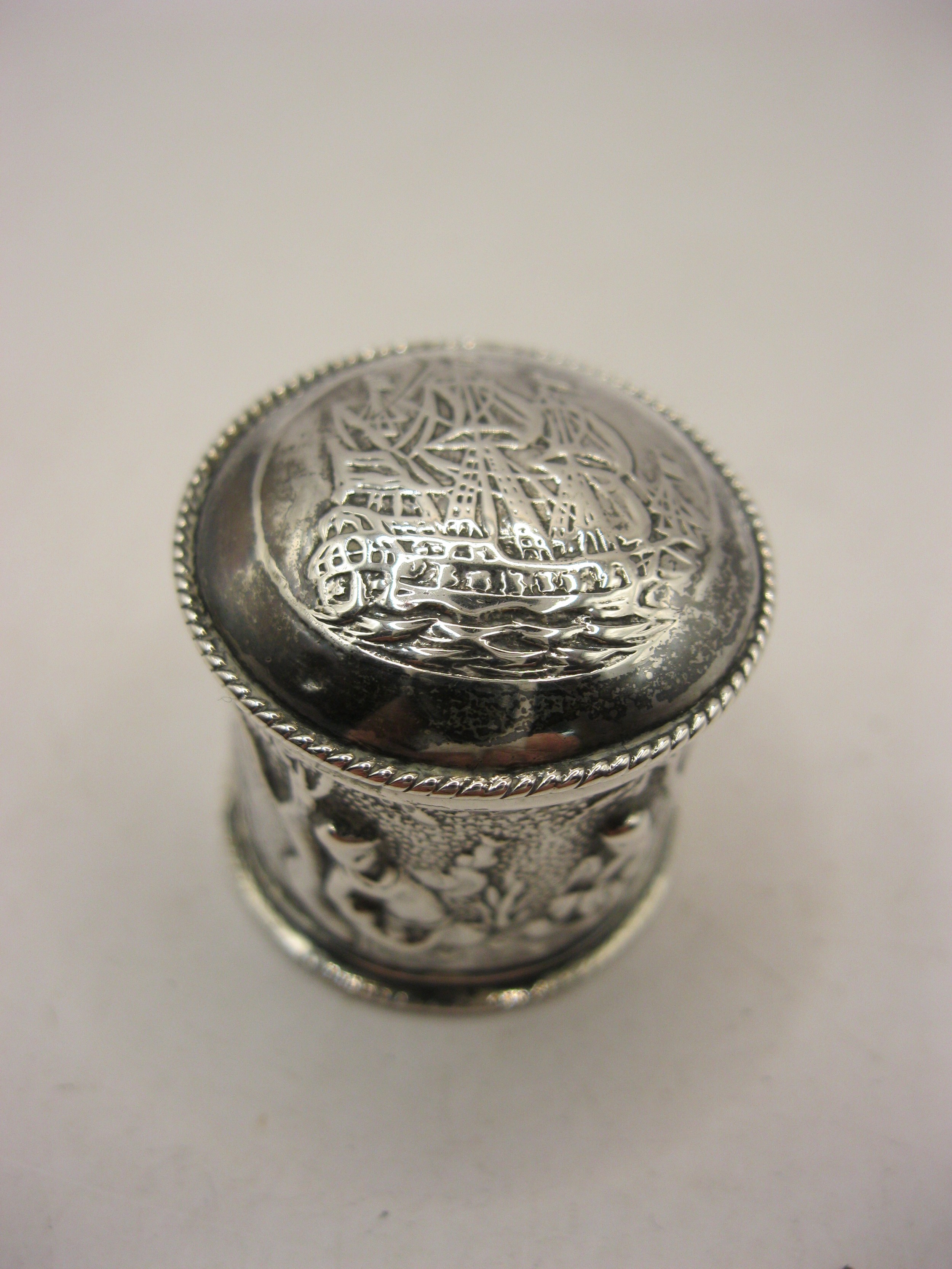 A sterling silver snuff- or pill-box decorated with a sailing ship to the lid