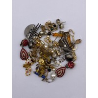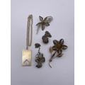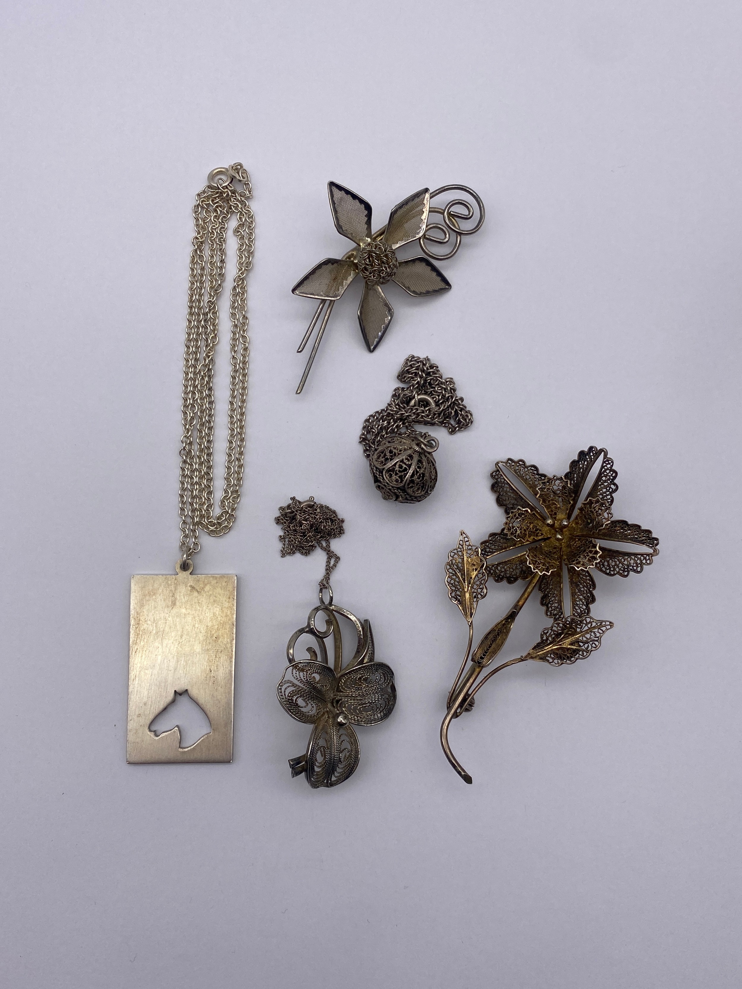 WHITE METAL AND SILVER FILIGREE FLORAL BROOCHES, BALL PENDANT AND A HORSEHEAD INGOT PENDANT ON CHAIN