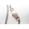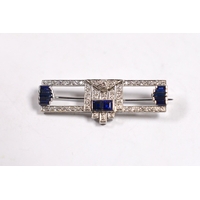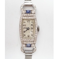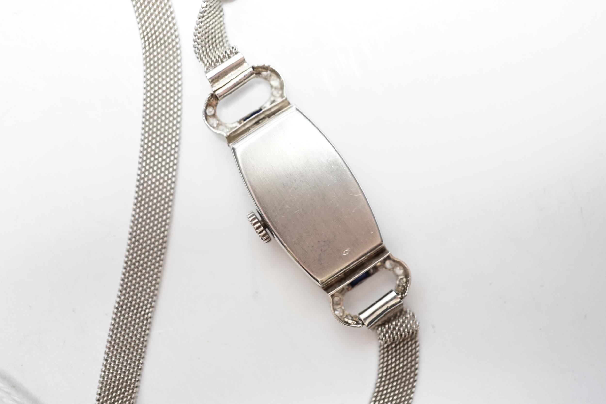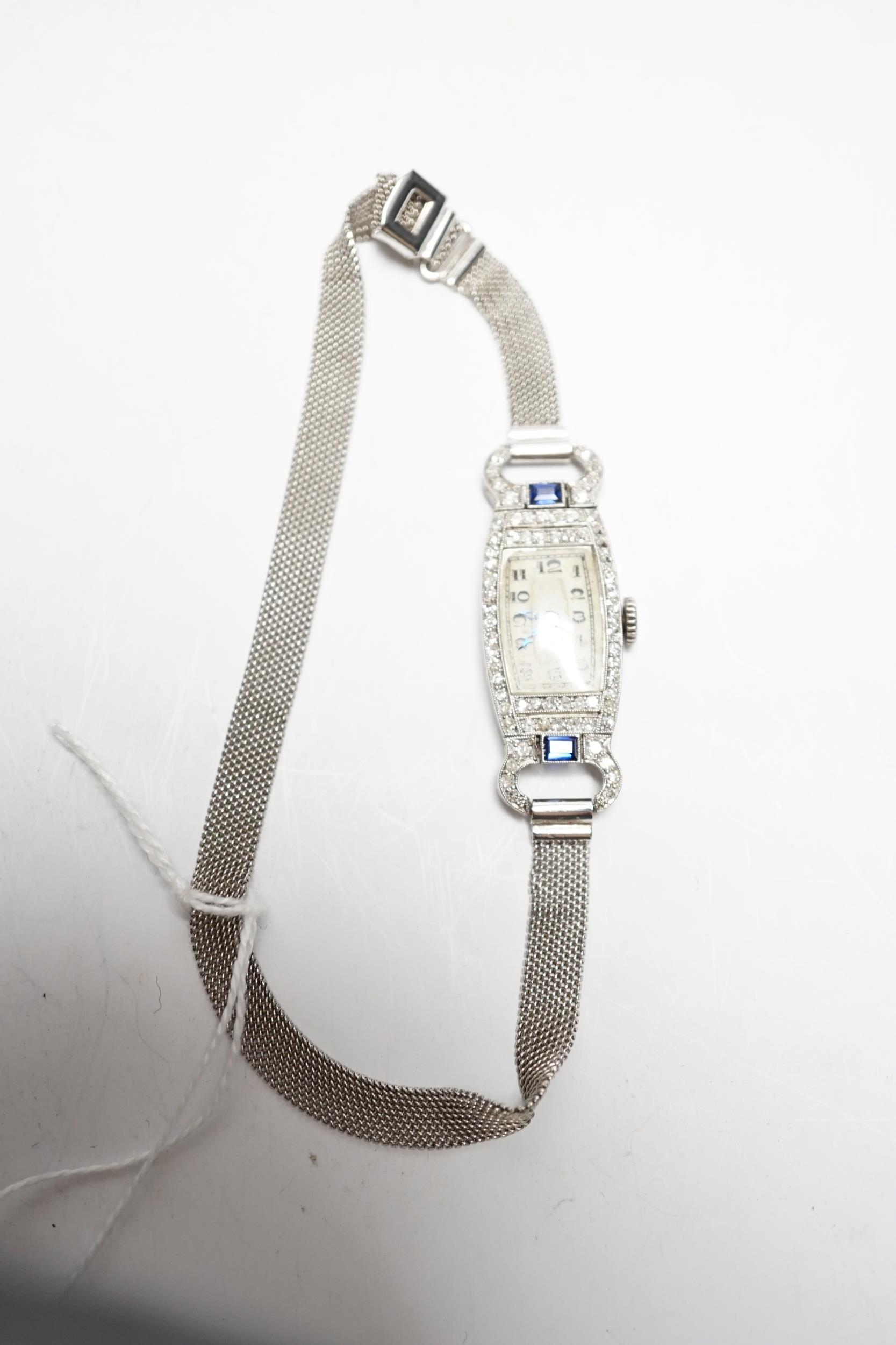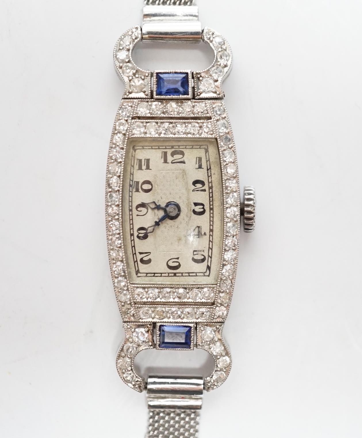 A lady's mid 20th century white metal (Swiss platinum mark), sapphire and diamond cluster set manual wind cocktail watch, with Arabic dial, on and adjustable 9ct mesh link bracelet, gross weight 18 grams.