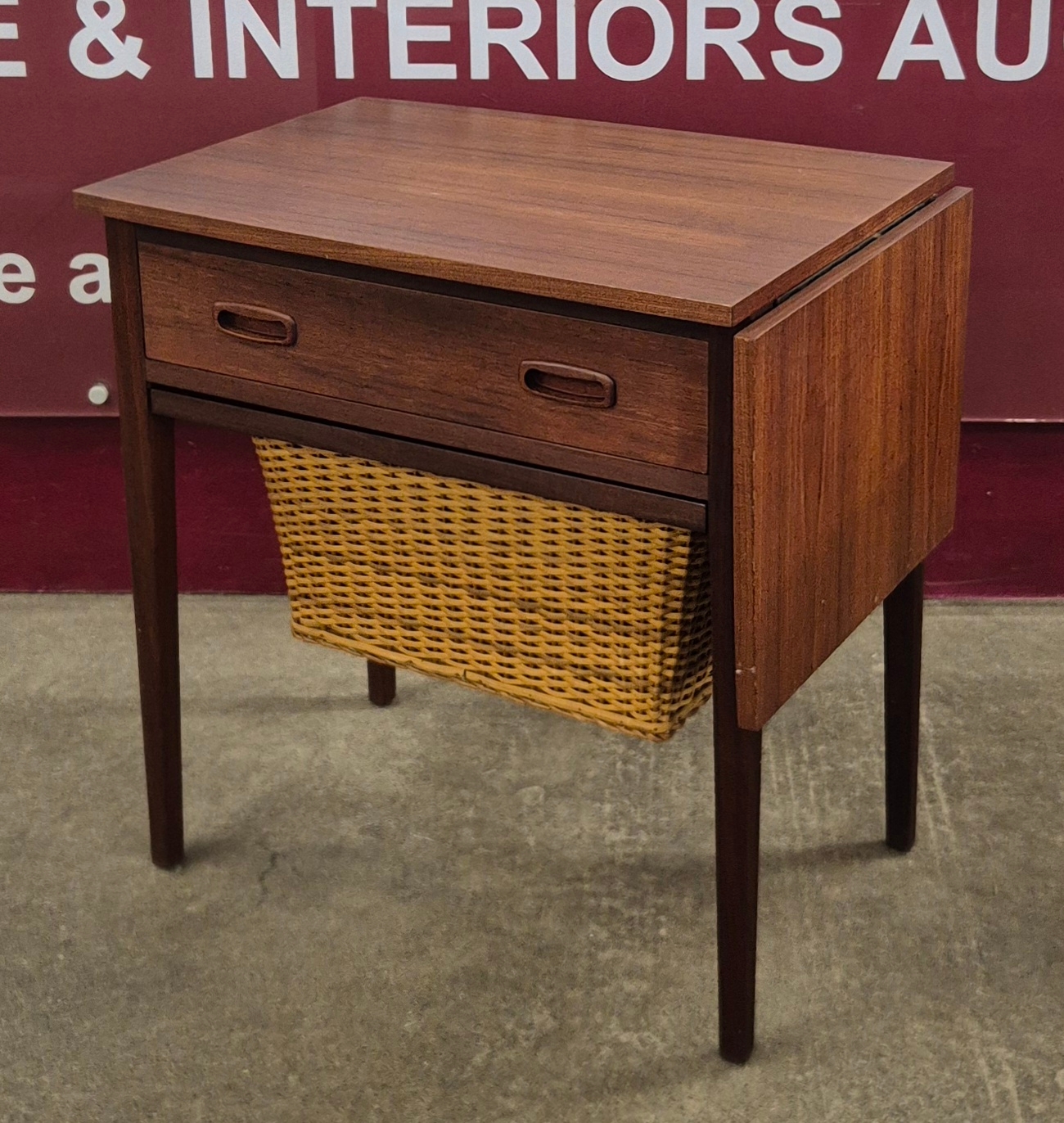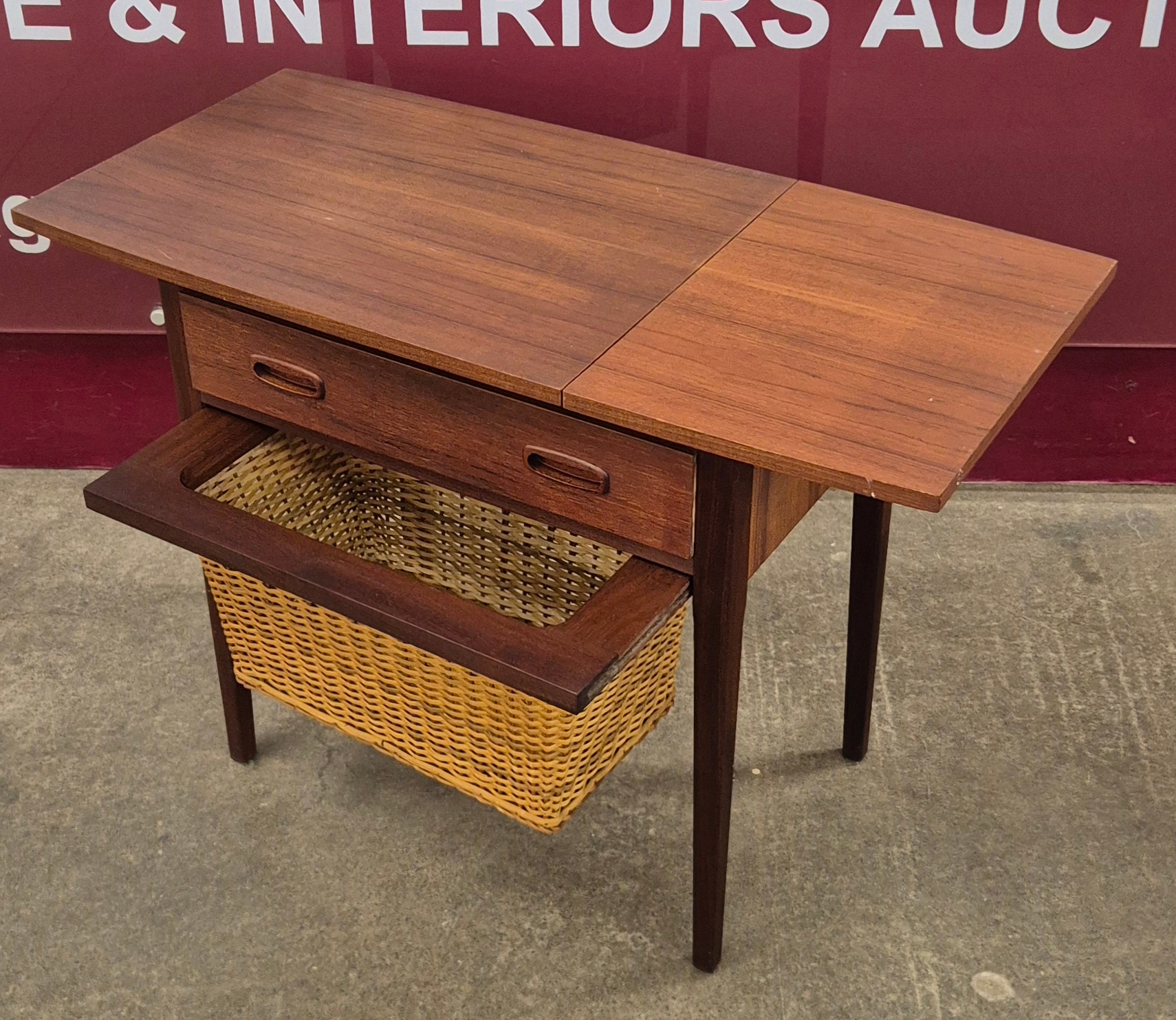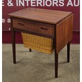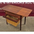 A Danish teak and rattan drop-leaf sewing table