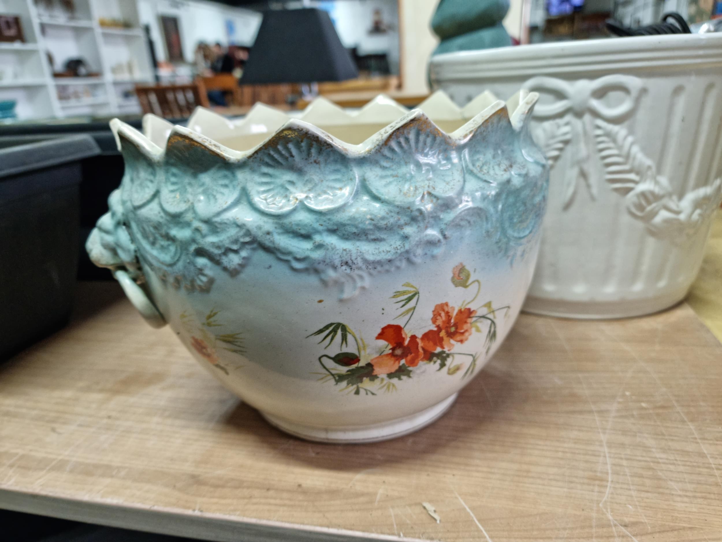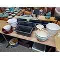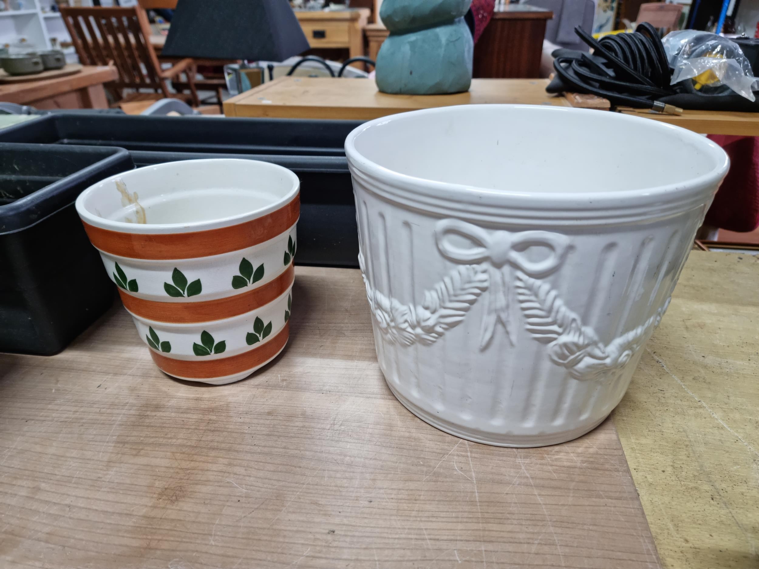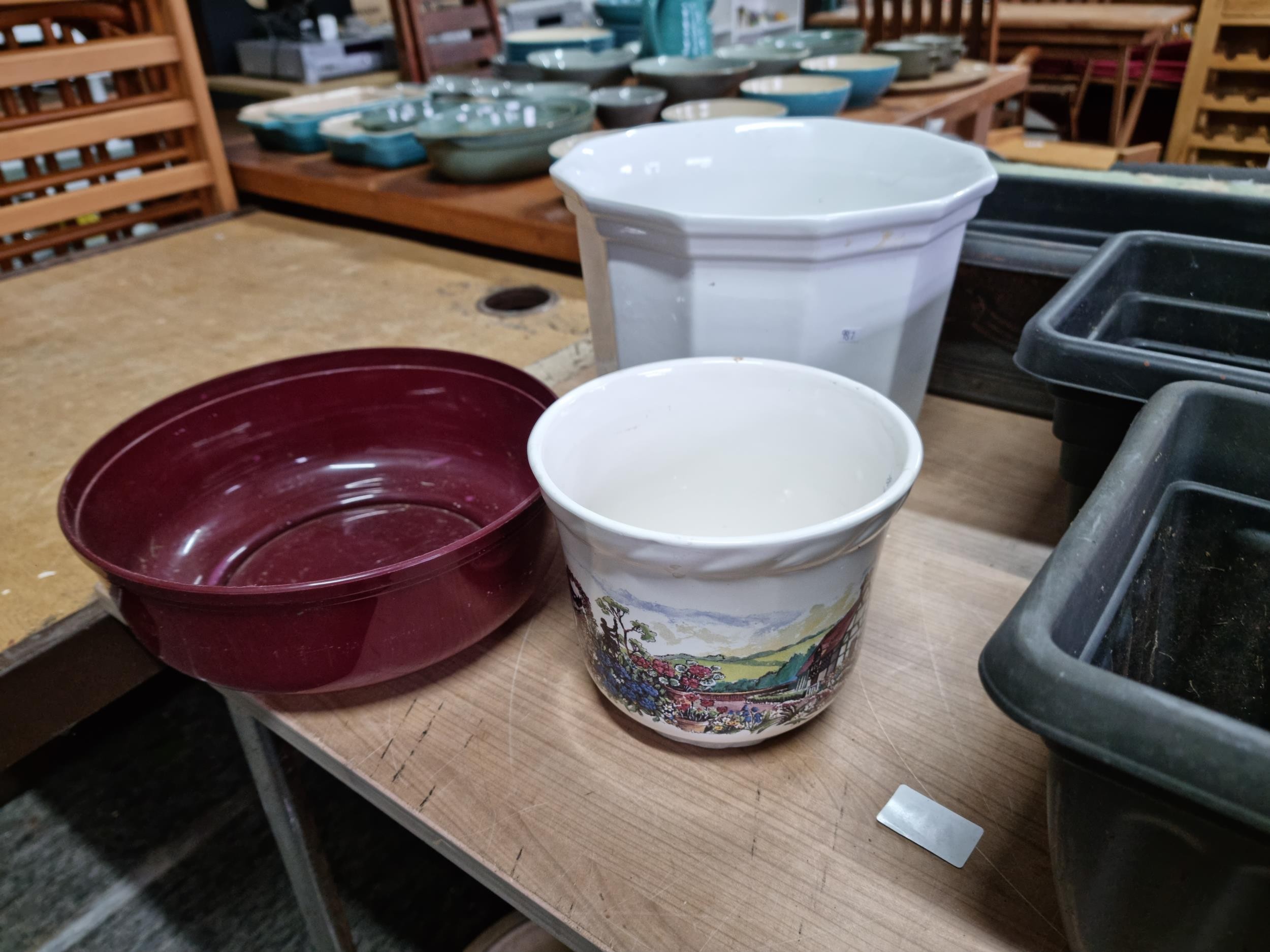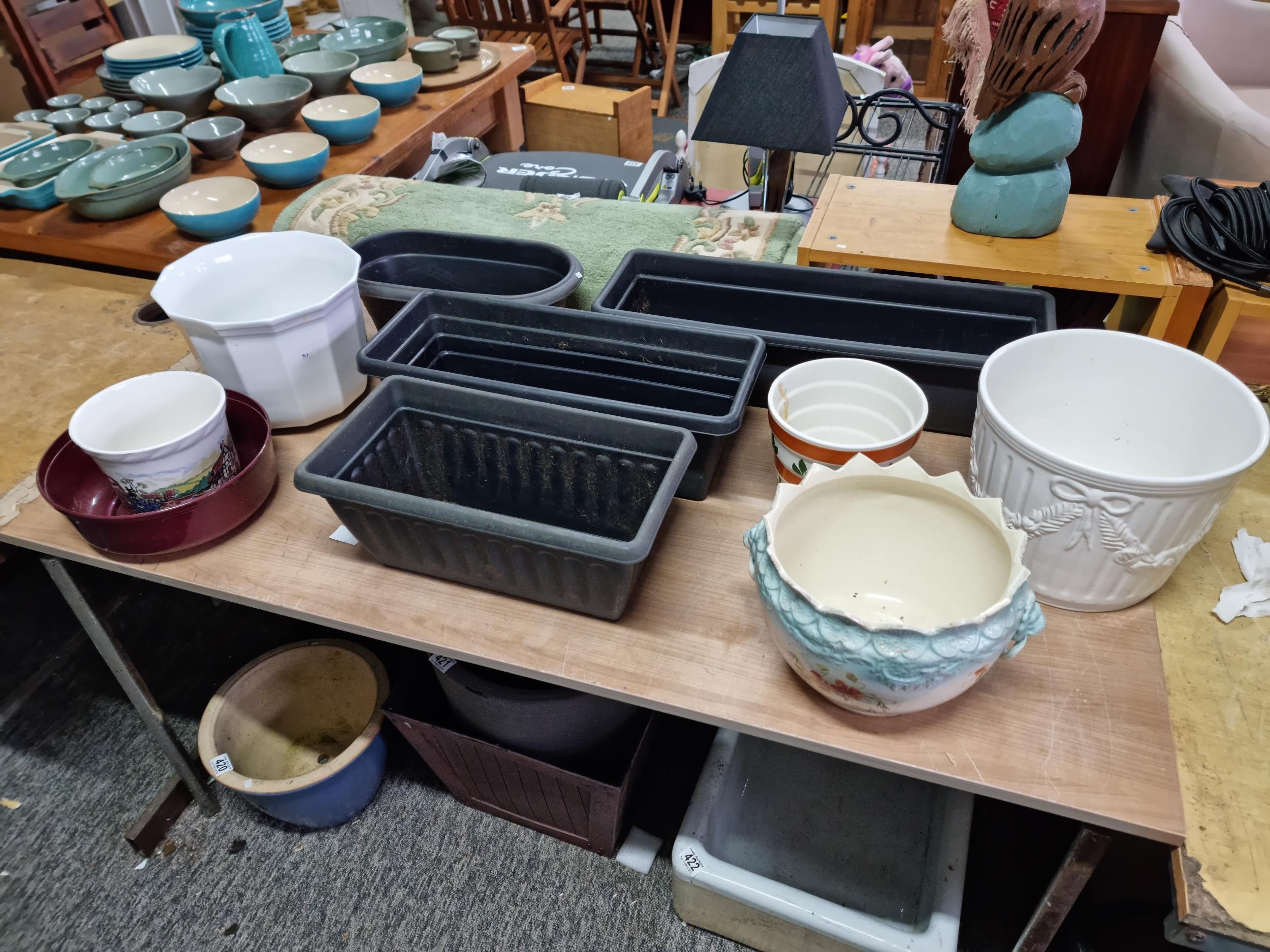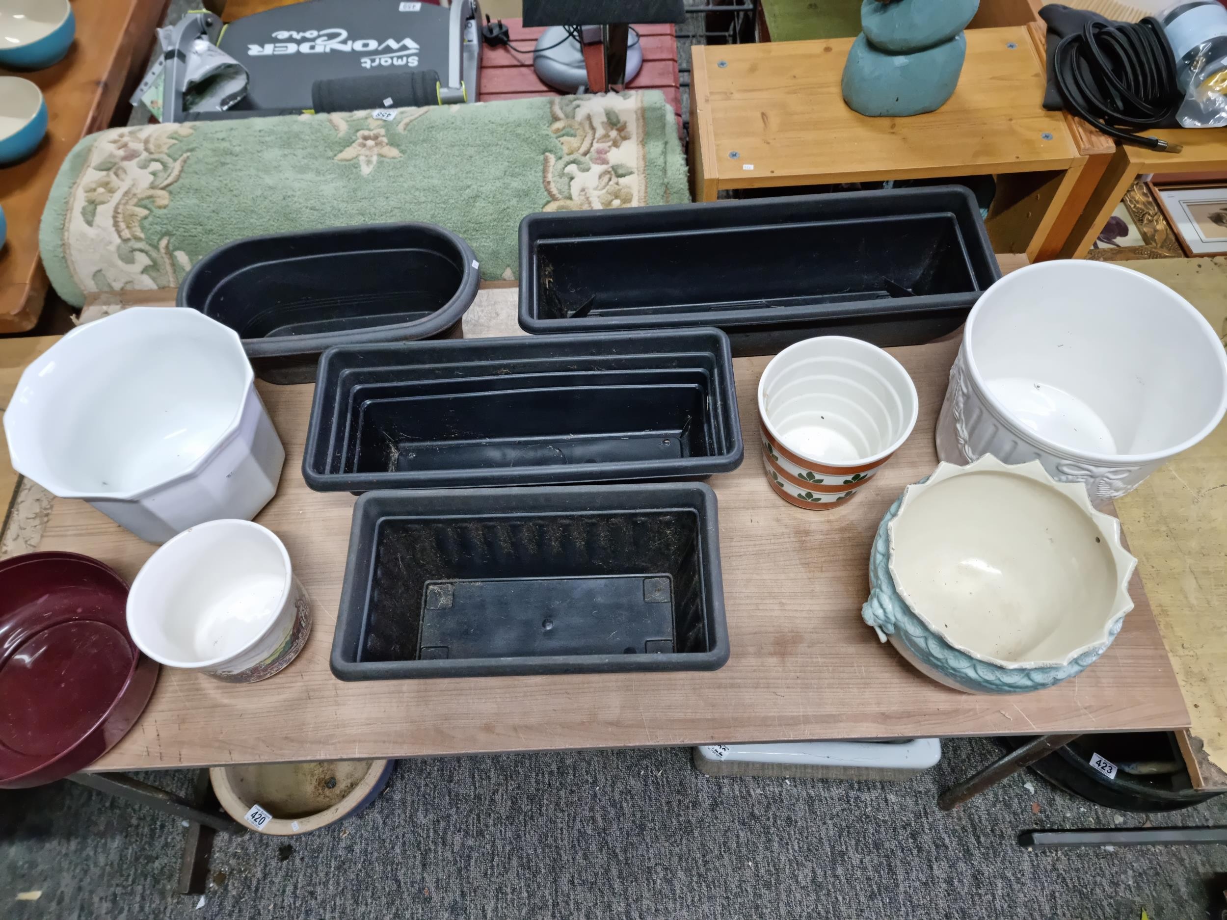 Large collection of planters to include 5x ceramic planters of various sizes to include a lion mask handle planter along with 4x plastic rectangular planters all in good order
