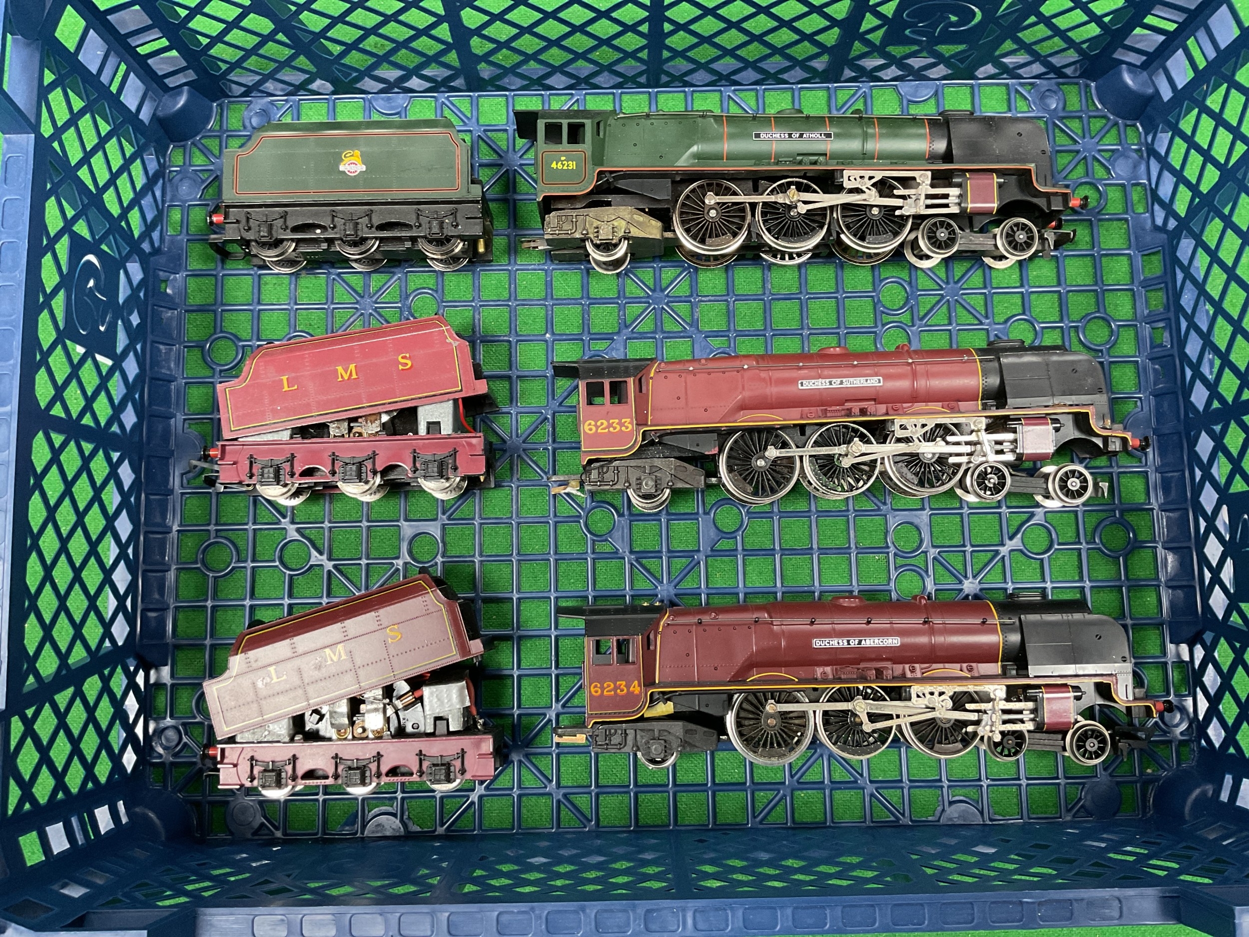 Three Hornby 00 gauge Duchess class locomotives: "Duchess of Abercorn" and "Duchess of Sutherland" in LMS Red, both noted as having tender bodies loose on their chassis; and "Duchess ofAtholl" in BR Green; all tender-drive, untested.