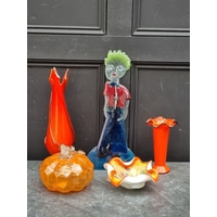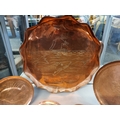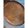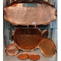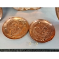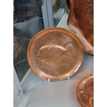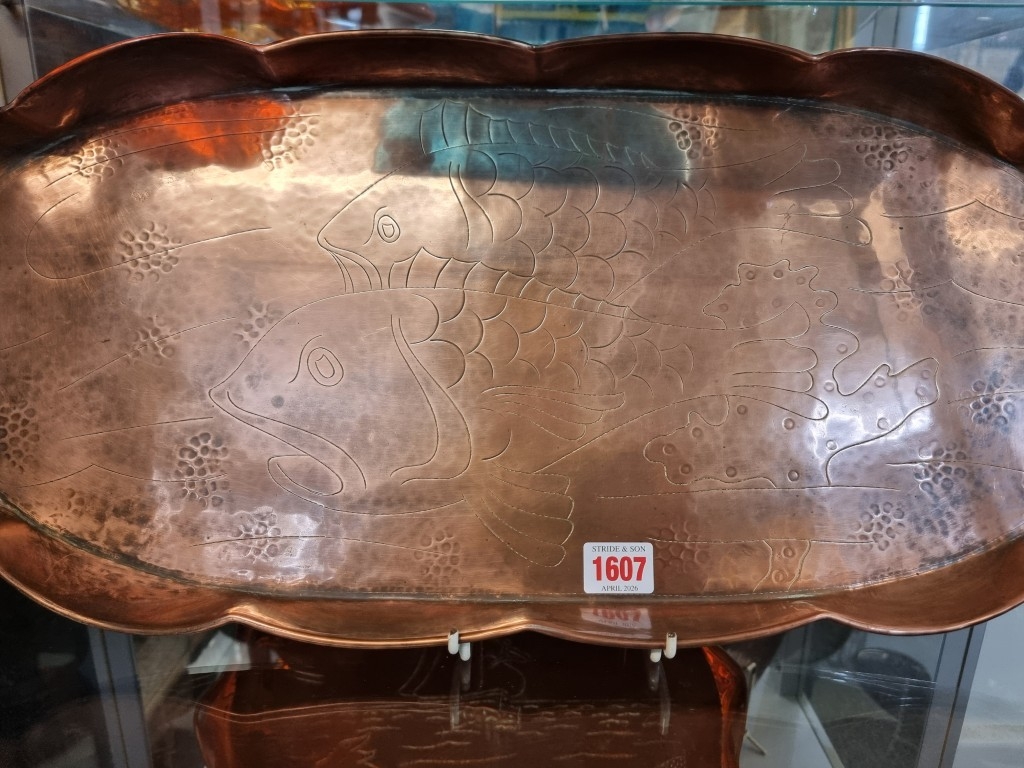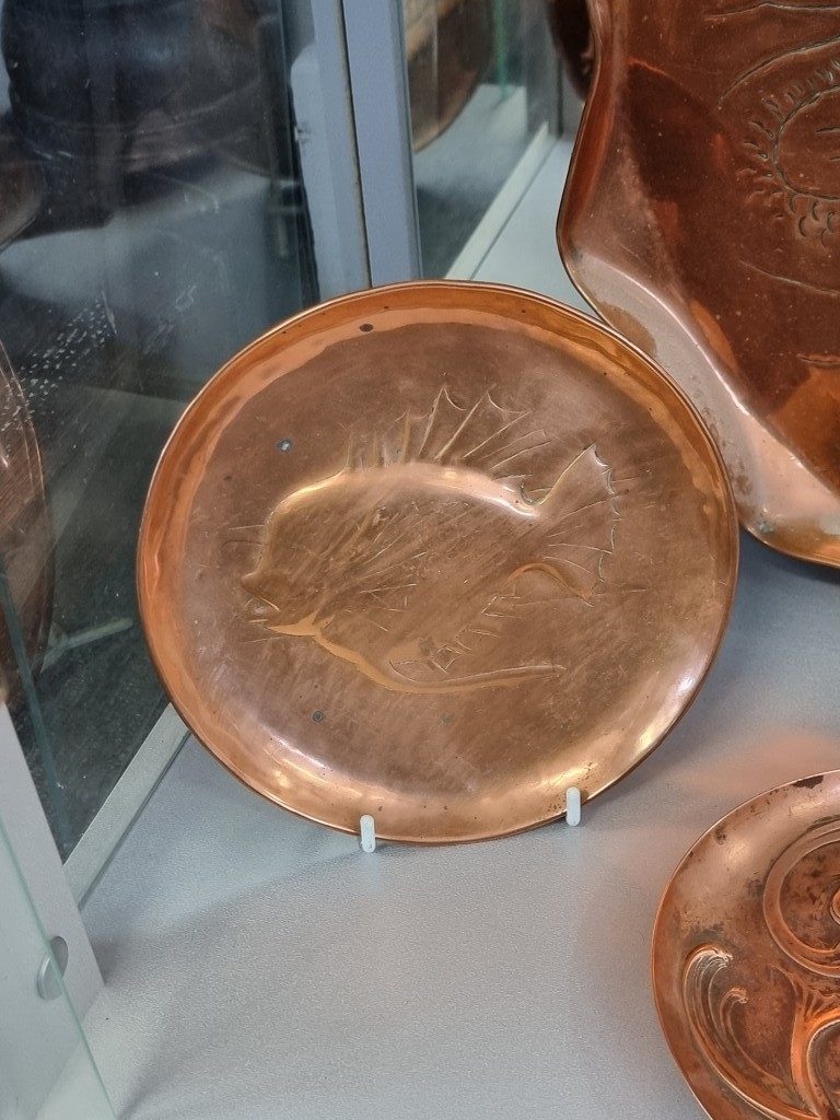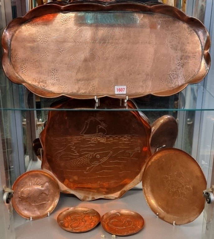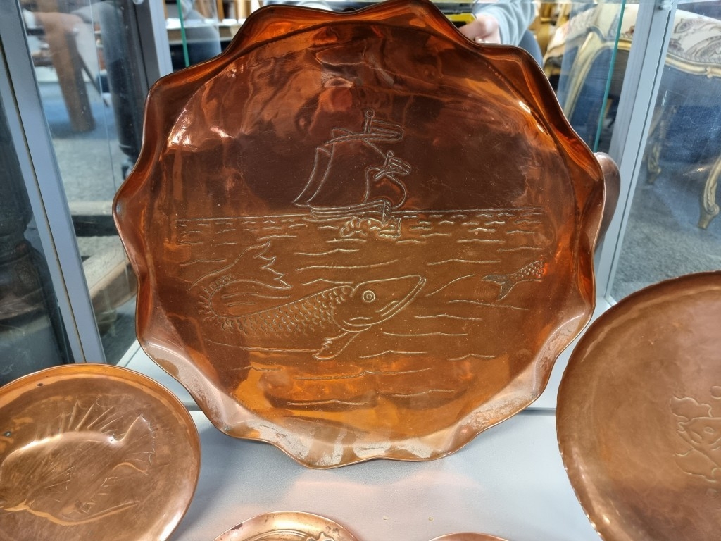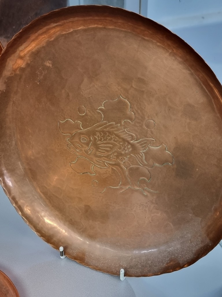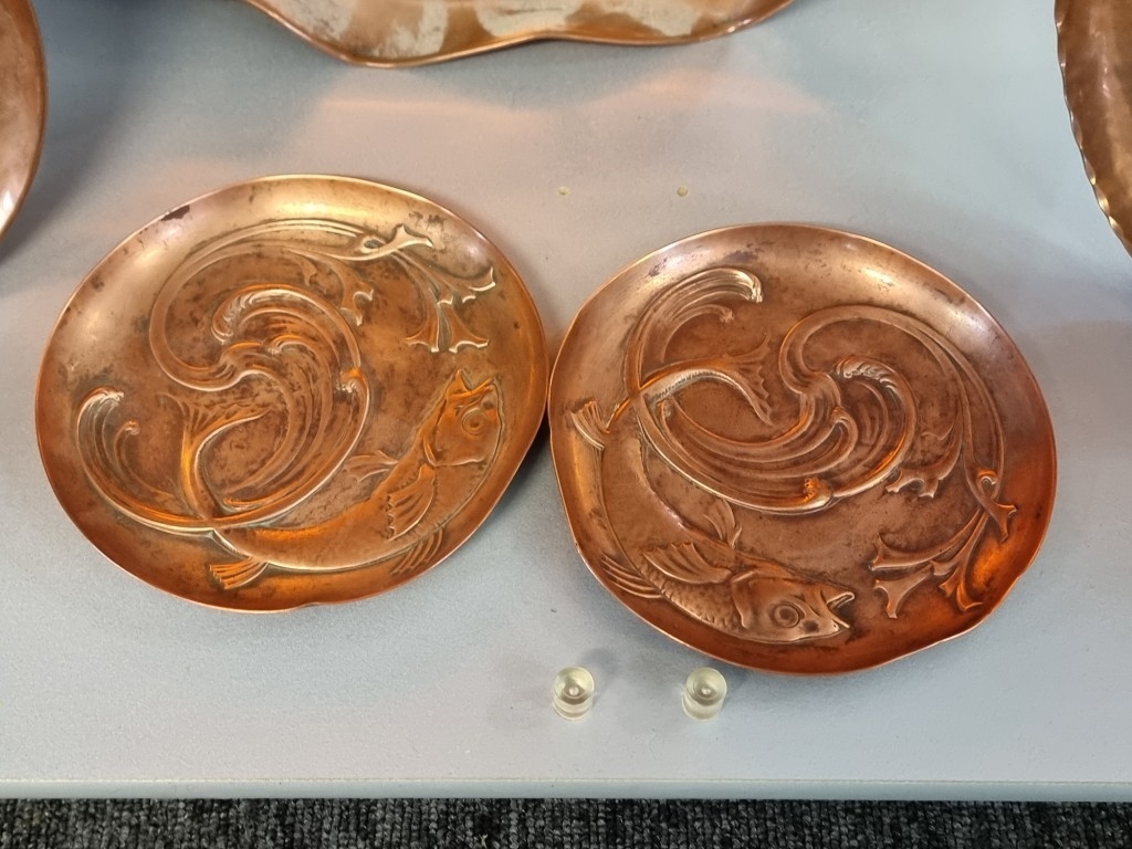 A collection of Arts & Crafts hammered copper 'Fish' plates, largest 58cm wide. (6)