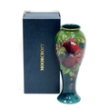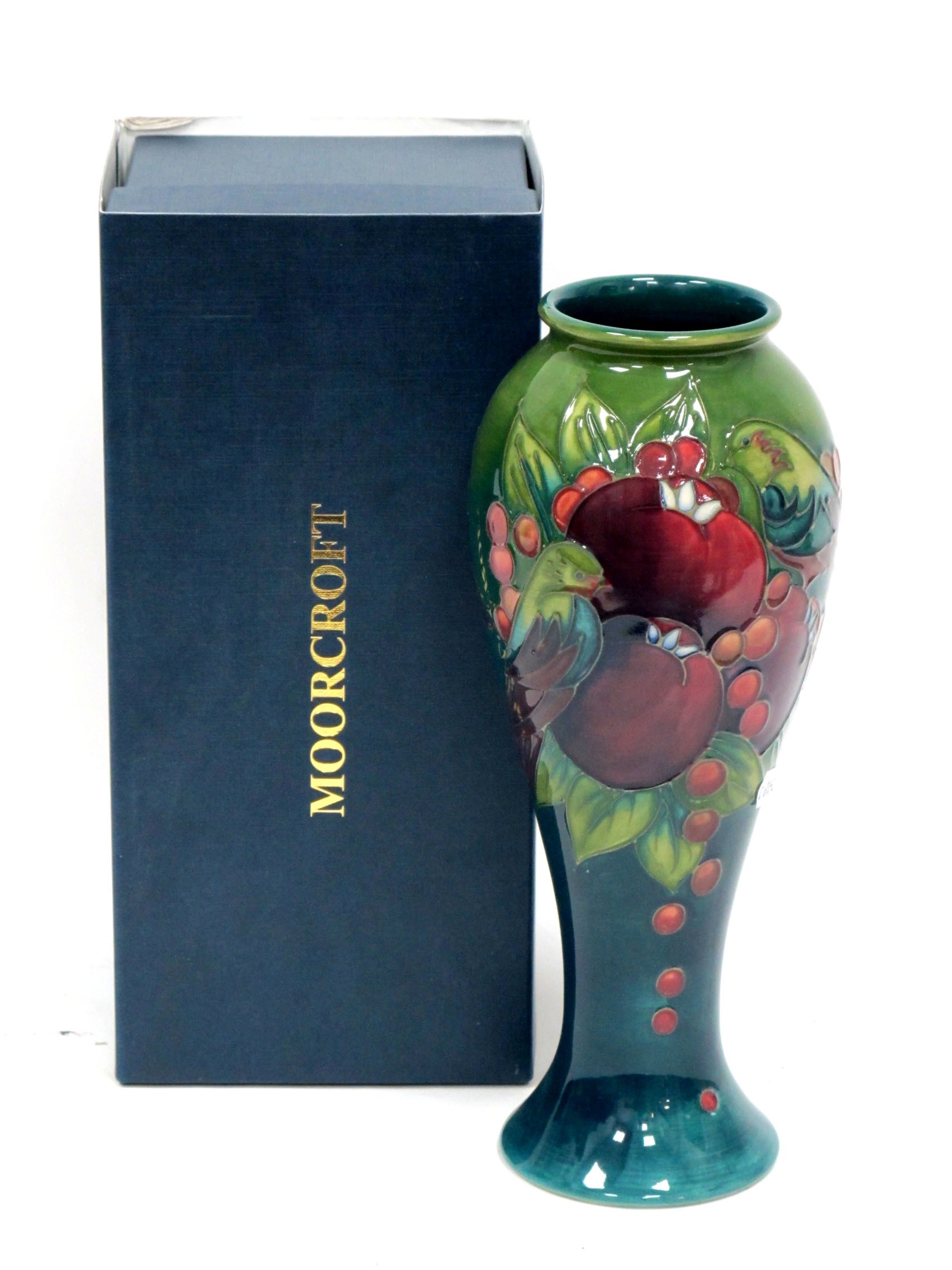 A Moorcroft Pottery Vase, of extended ovoid form, painted in the 'Finches' pattern against a green ground, painted and impressed marks, 27.5cm high, boxed.