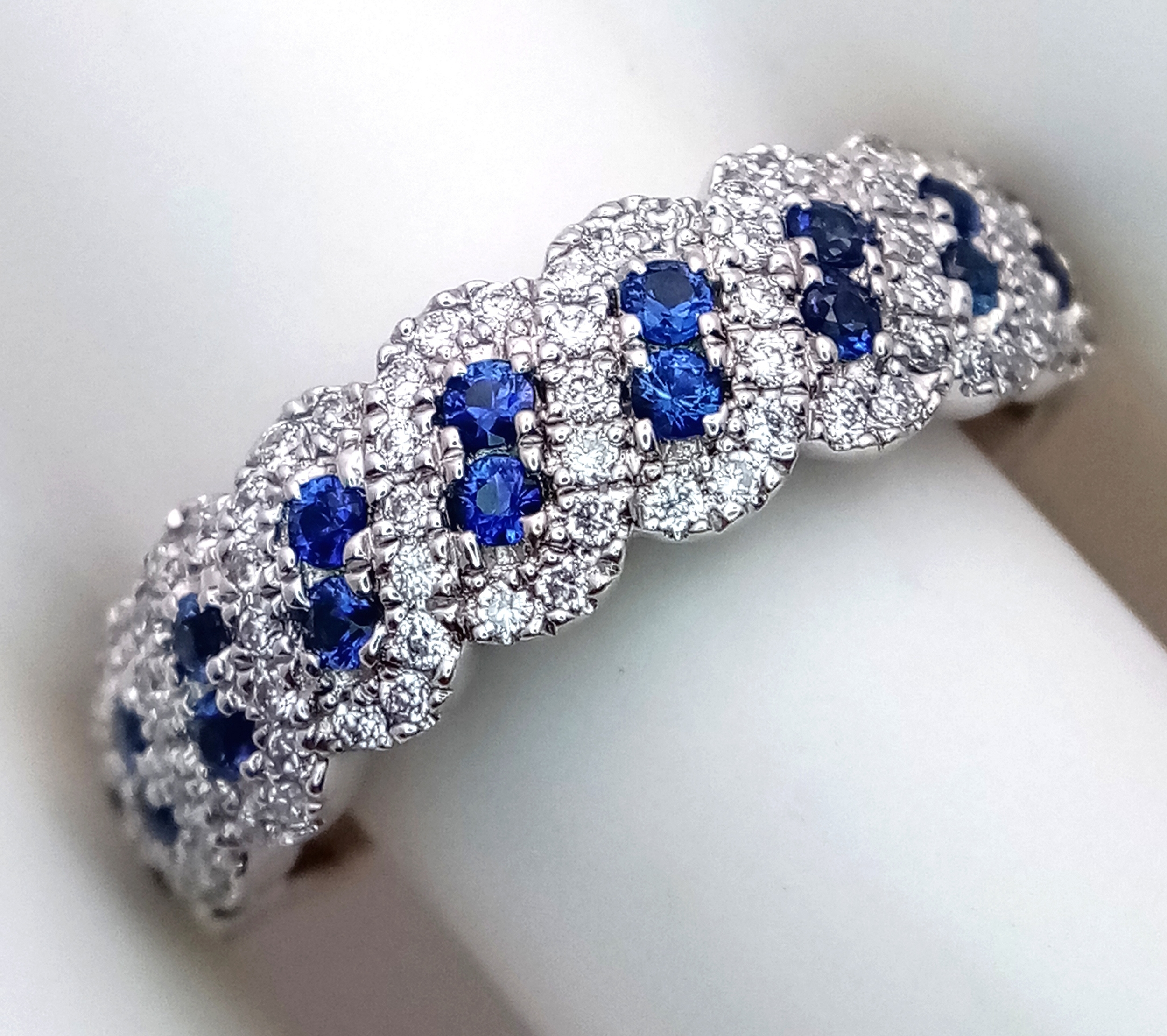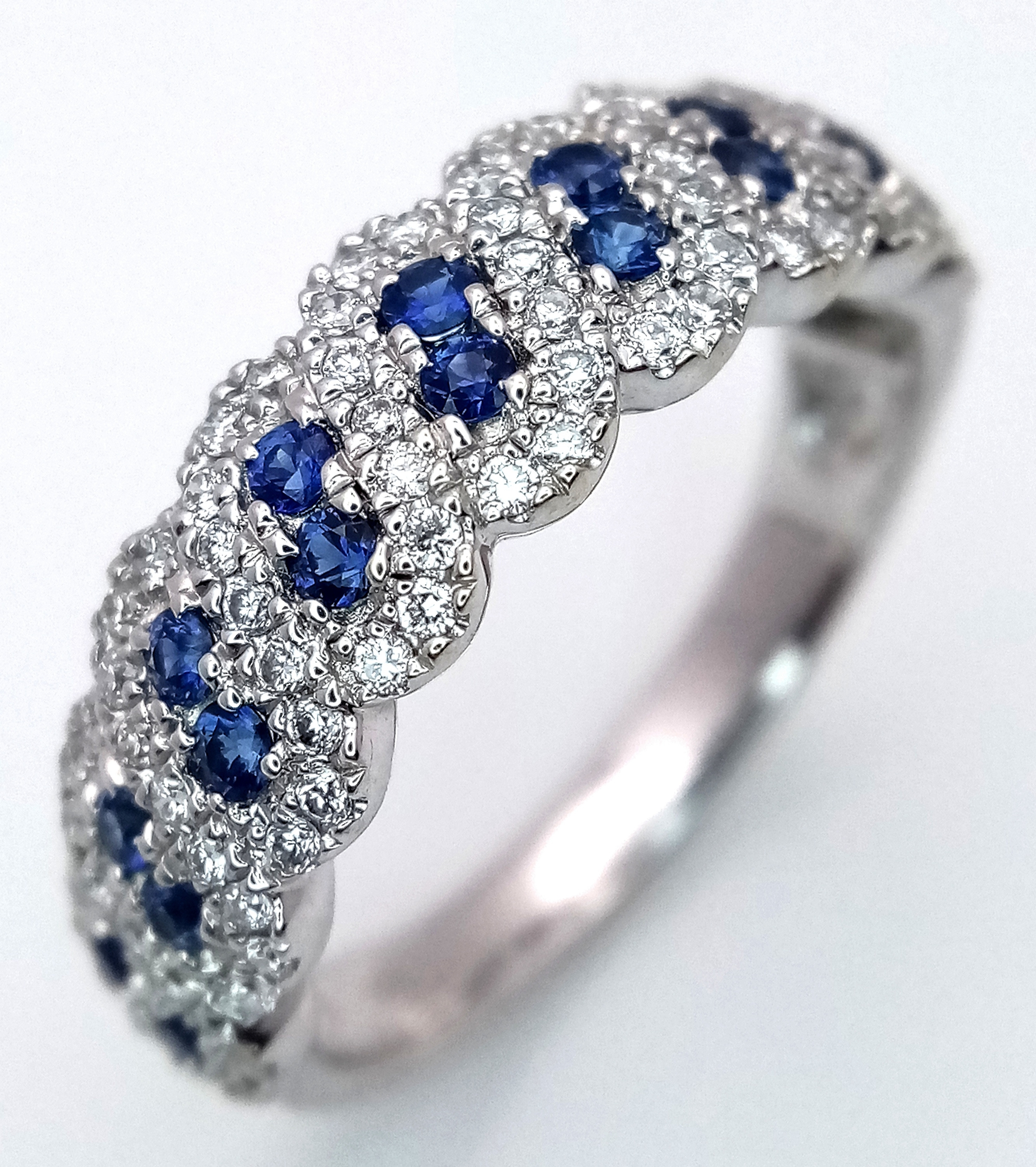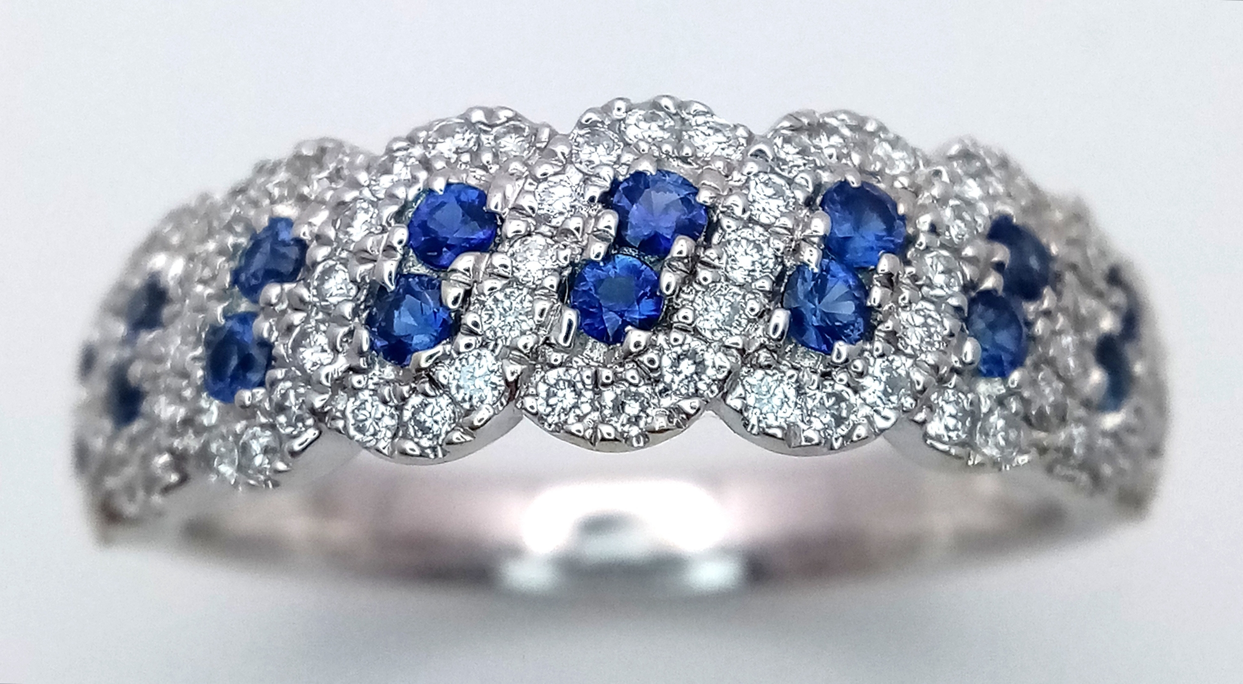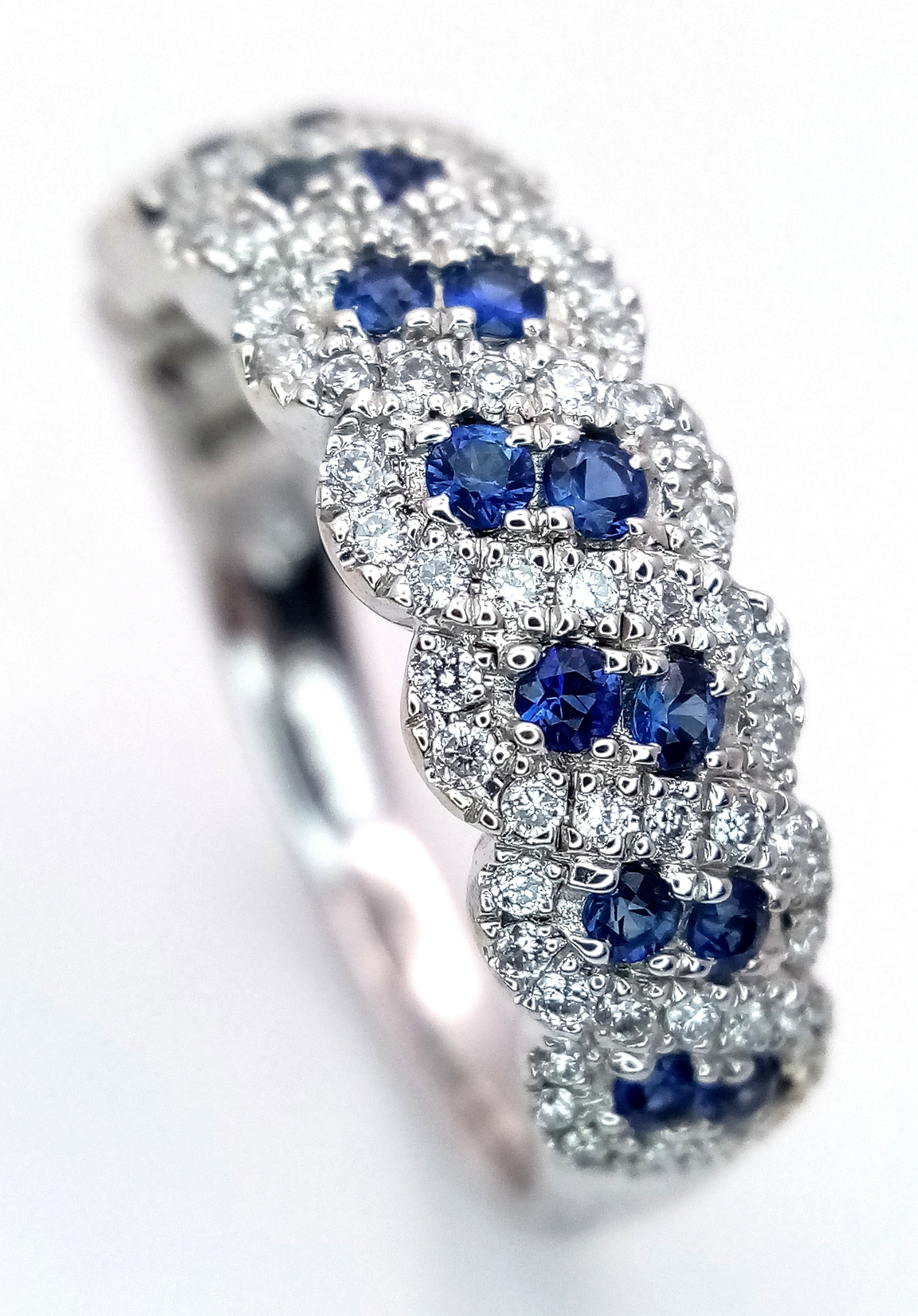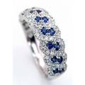 An 18K White Gold, Sapphire and Diamond Cluster Ring. 18 round cut sapphires in diagonal pair form - in a diamond cluster surround. Size T. 5.68g.