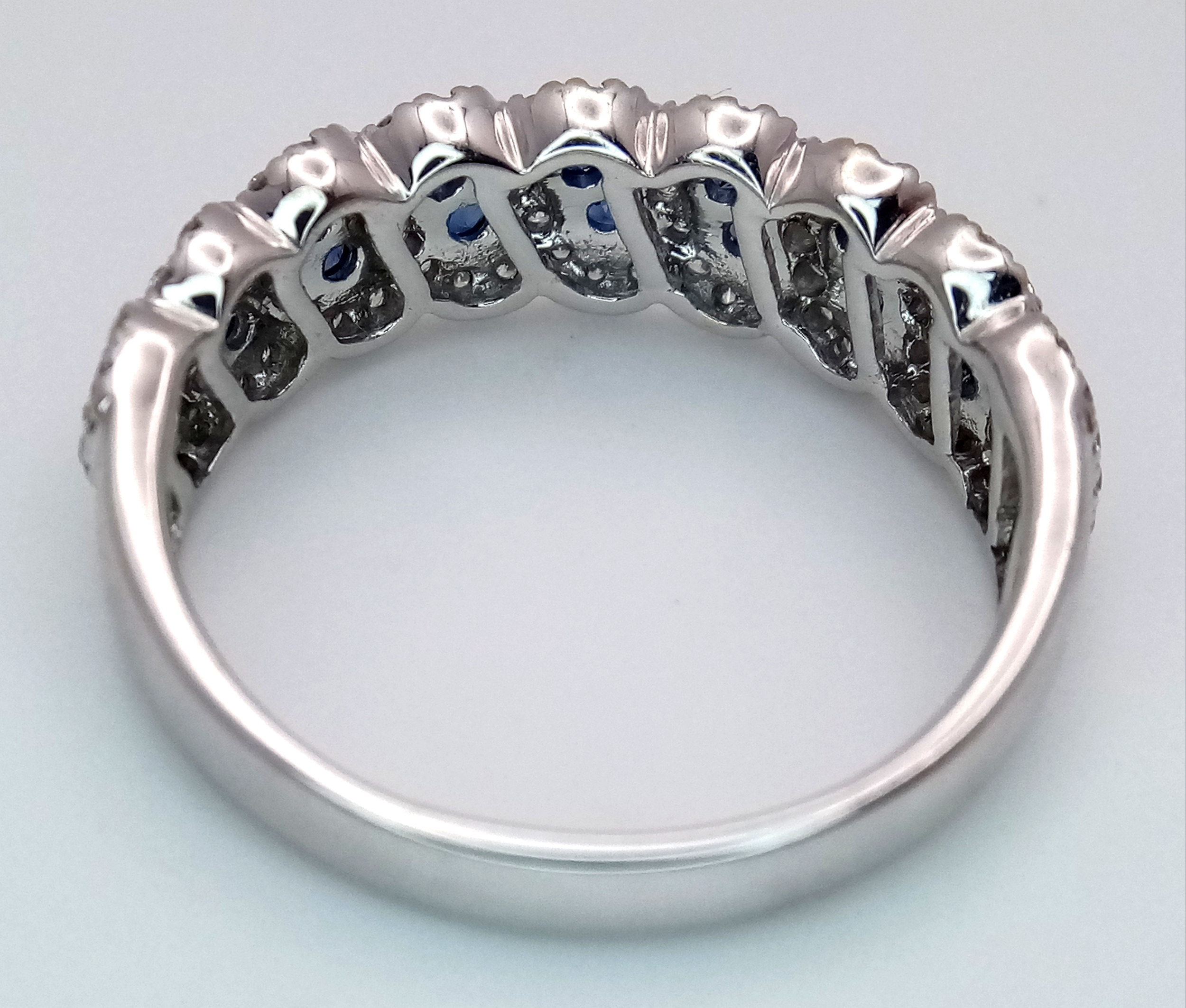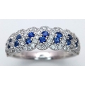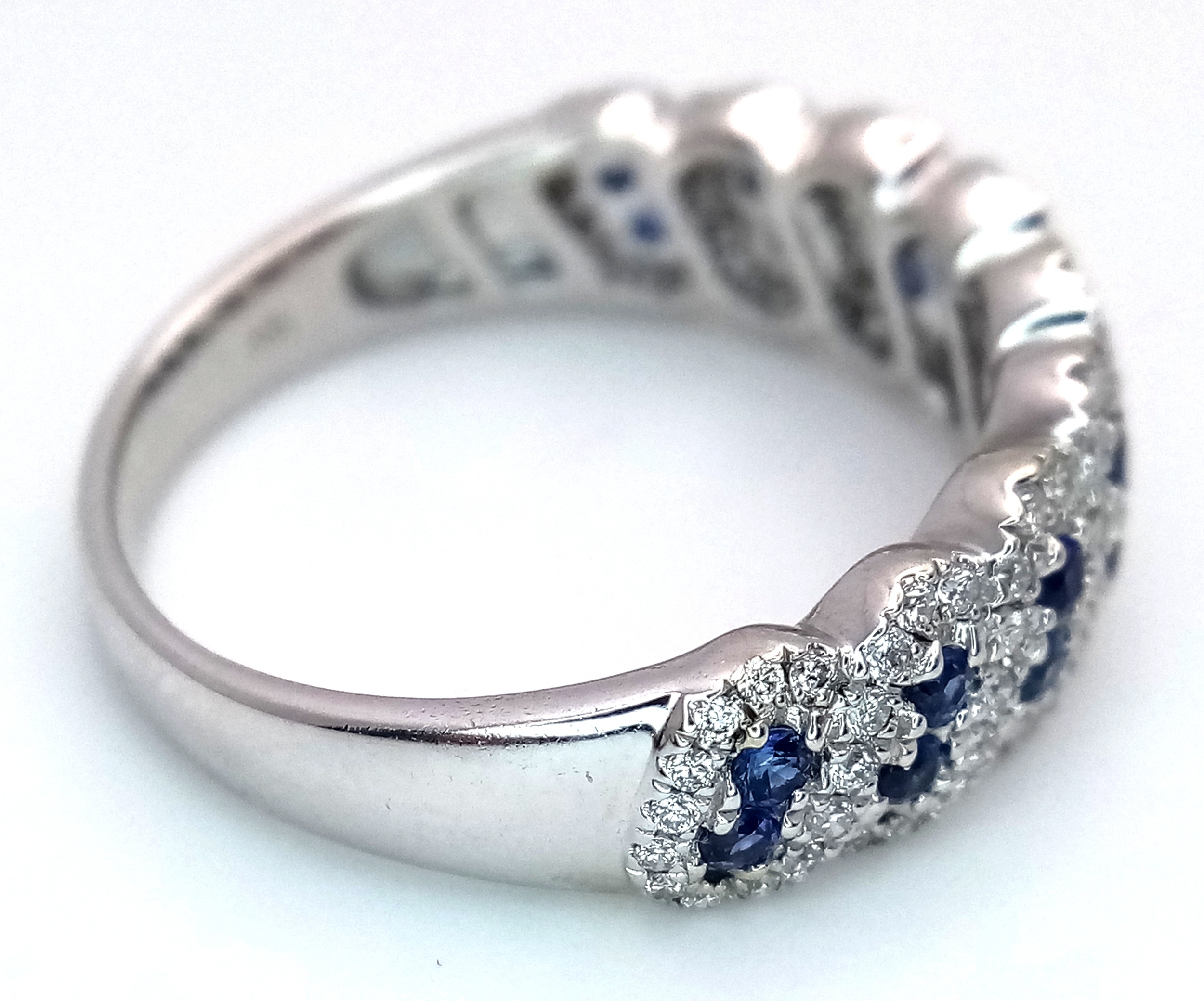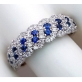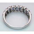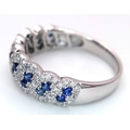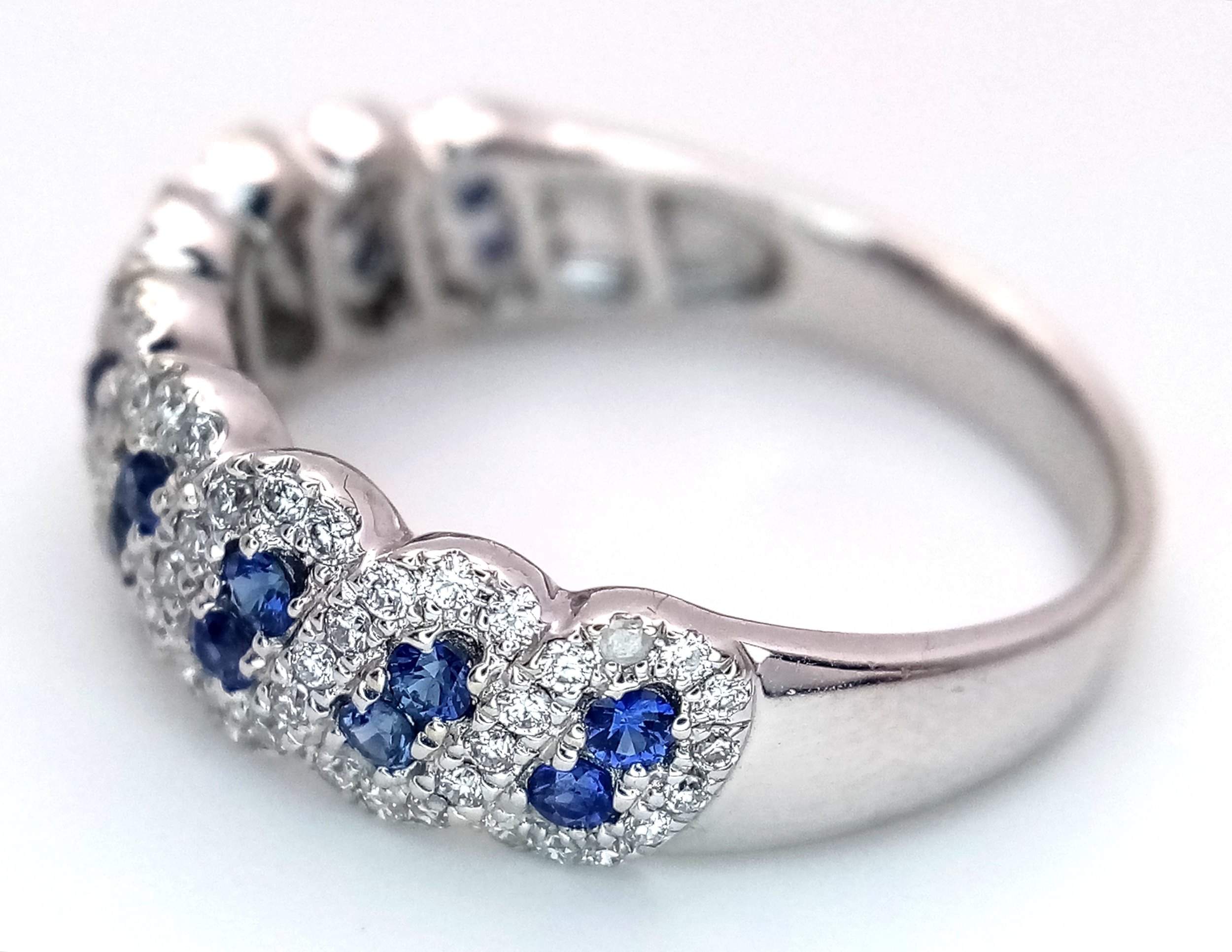 An 18K White Gold, Sapphire and Diamond Cluster Ring. 18 round cut sapphires in diagonal pair form - in a diamond cluster surround. Size T. 5.68g.